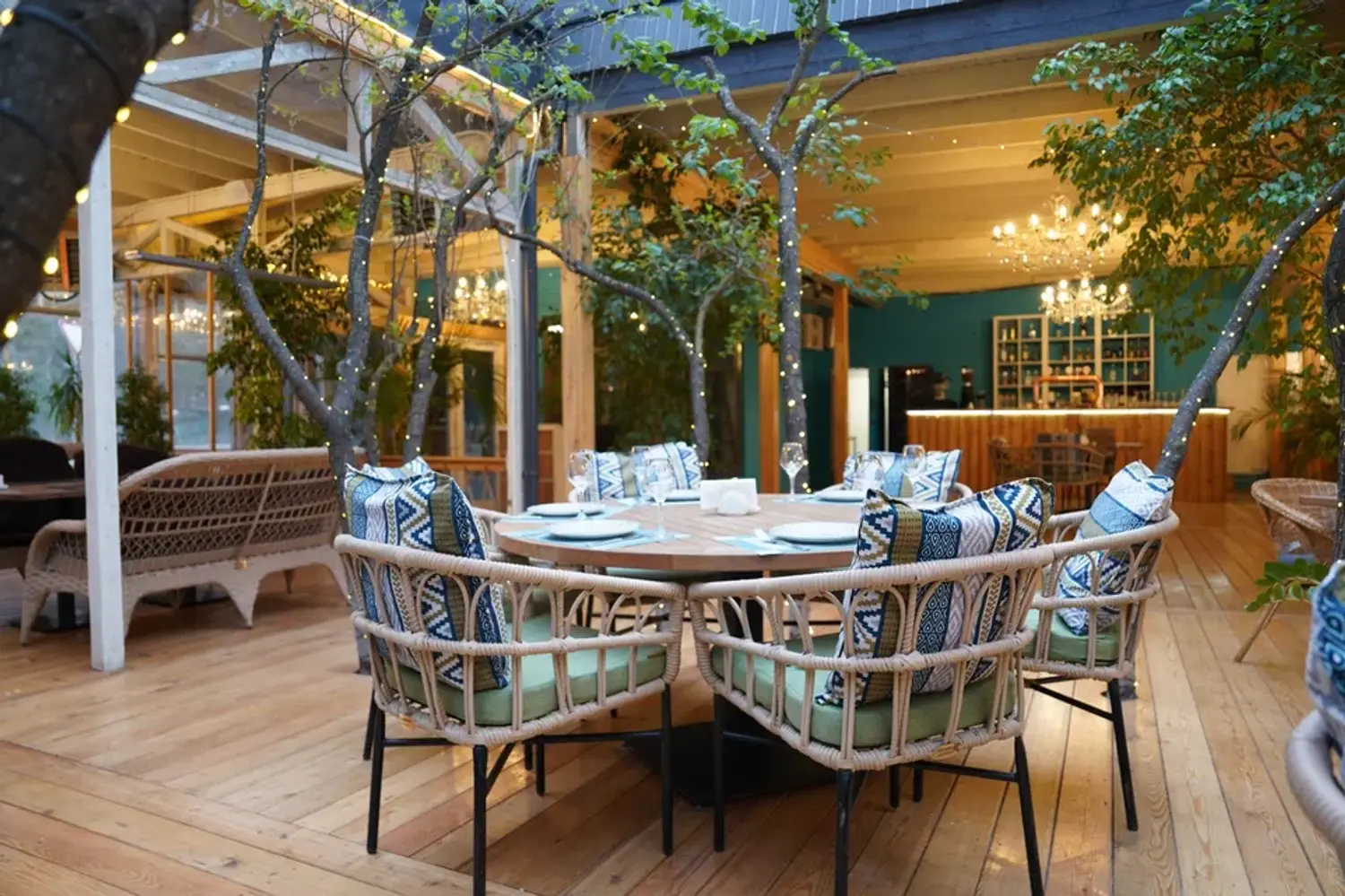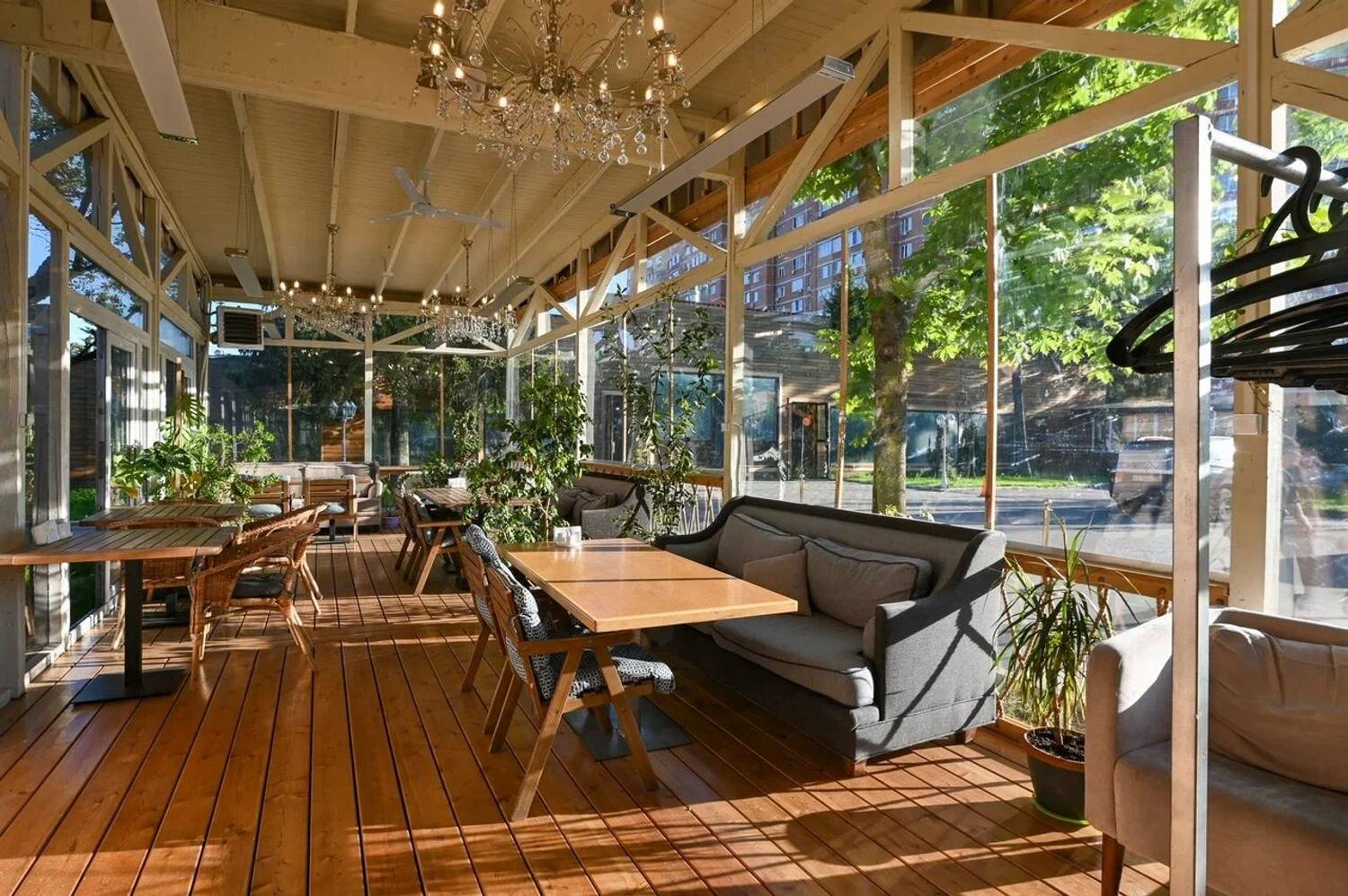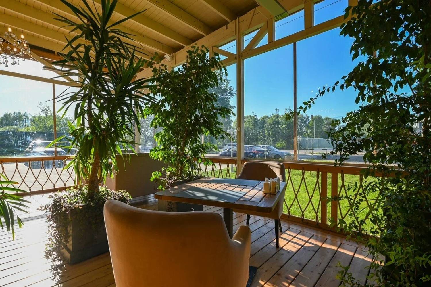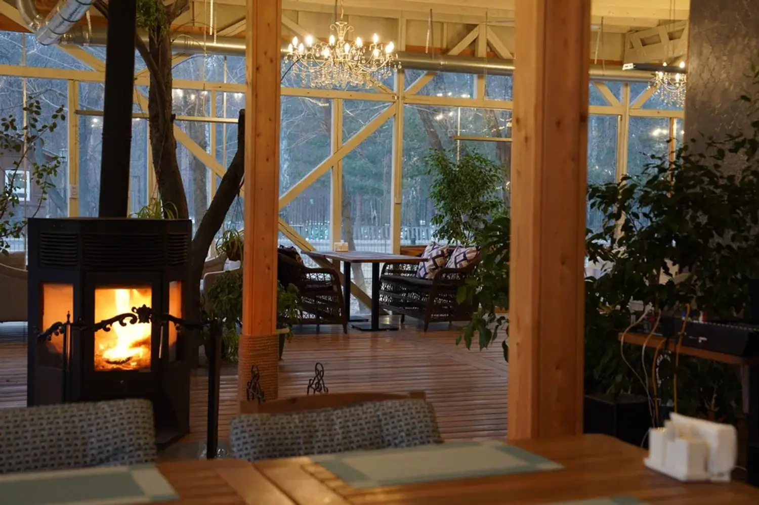 Атмосфера. Интерьер в стиле современного дачного дома: несколько залов с теплым светом, деревянной мебелью и натуральными материалами создают ощущение тепла и расслабленности. Есть застекленная веранда с деревьями и мягкими креслами.