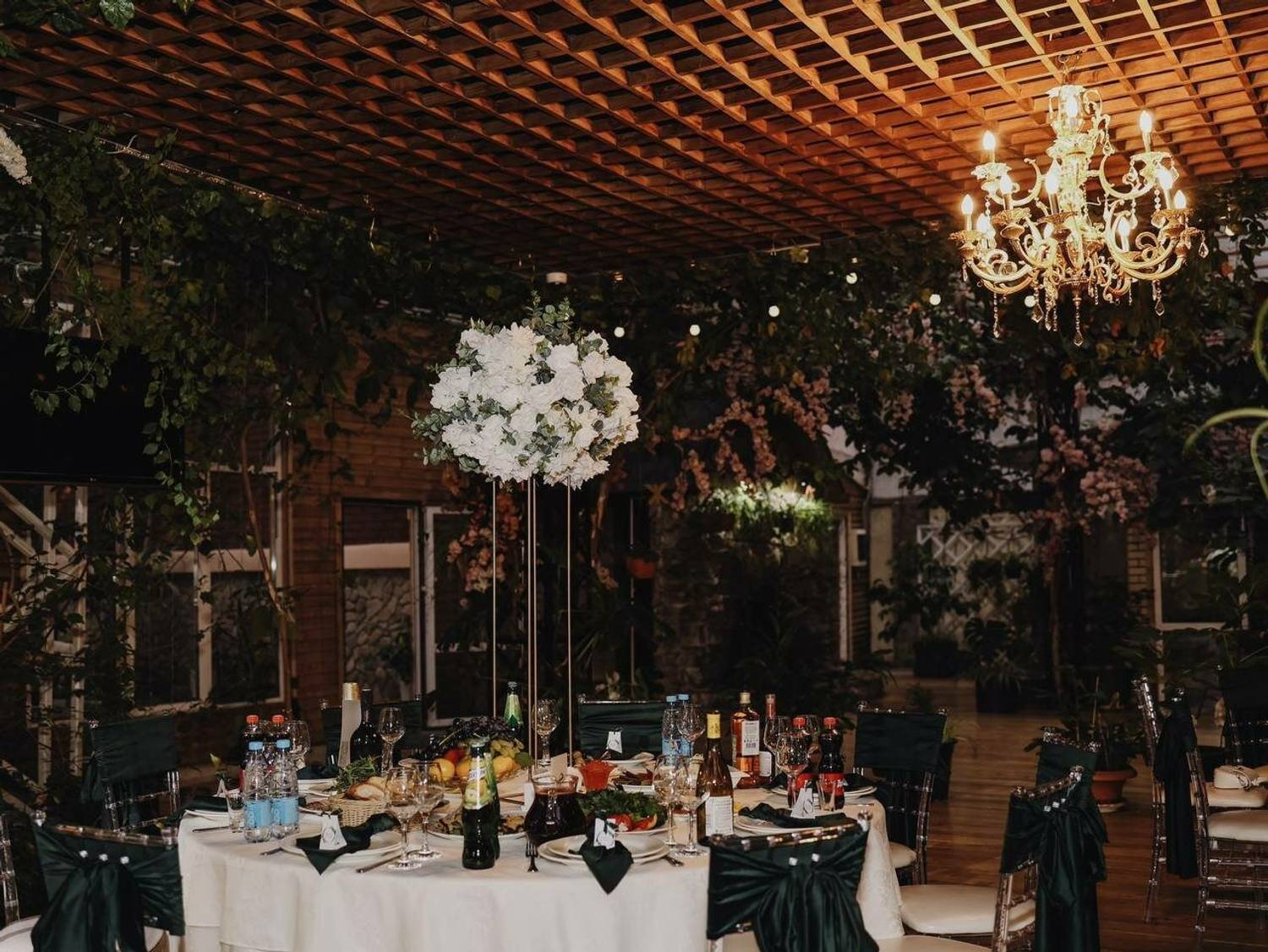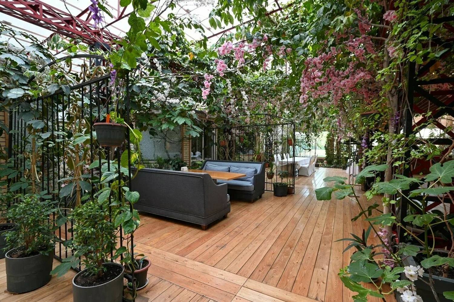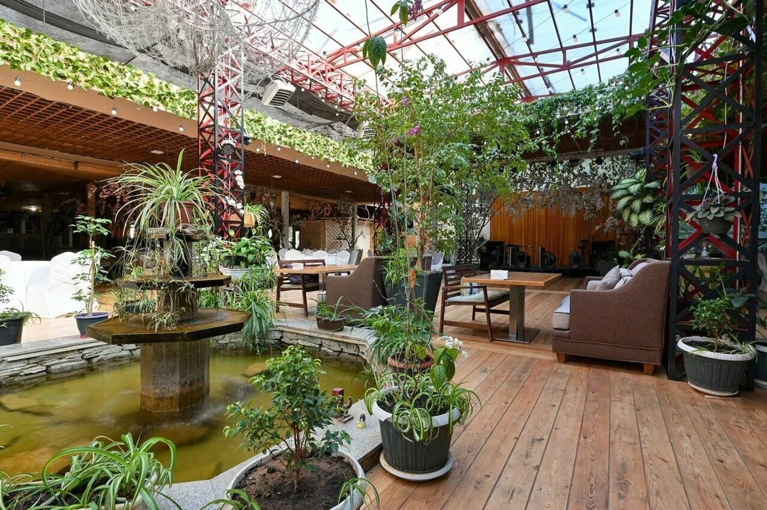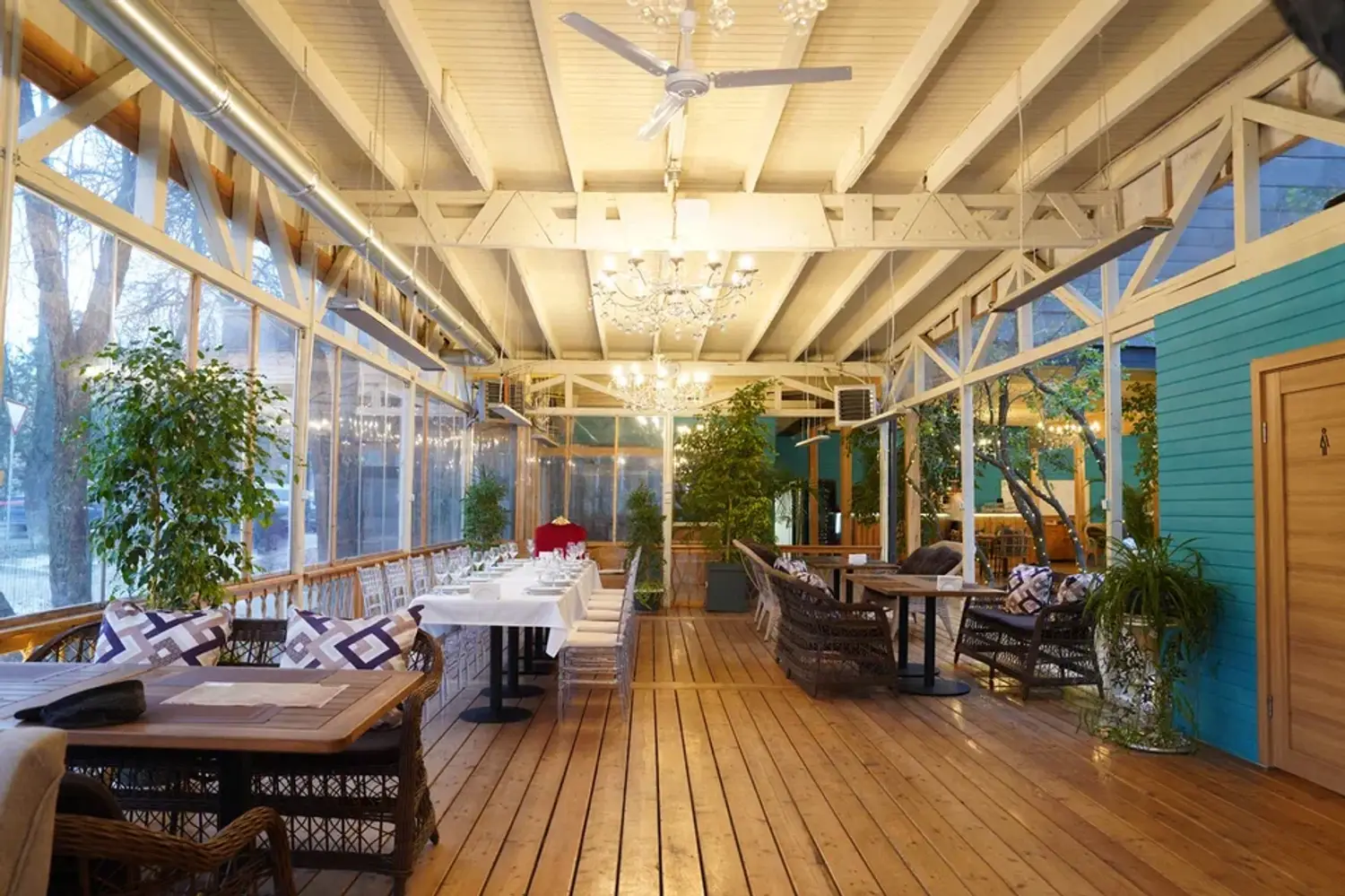 Атмосфера. Интерьер в стиле современного дачного дома: несколько залов с теплым светом, деревянной мебелью и натуральными материалами создают ощущение тепла и расслабленности. Есть застекленная веранда с деревьями и мягкими креслами.