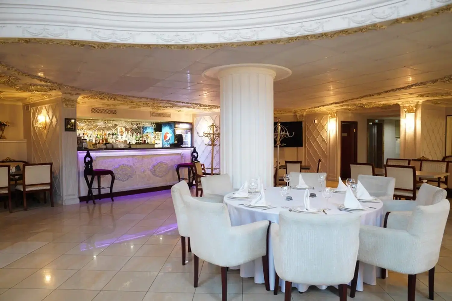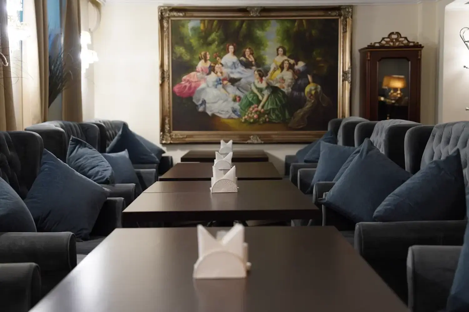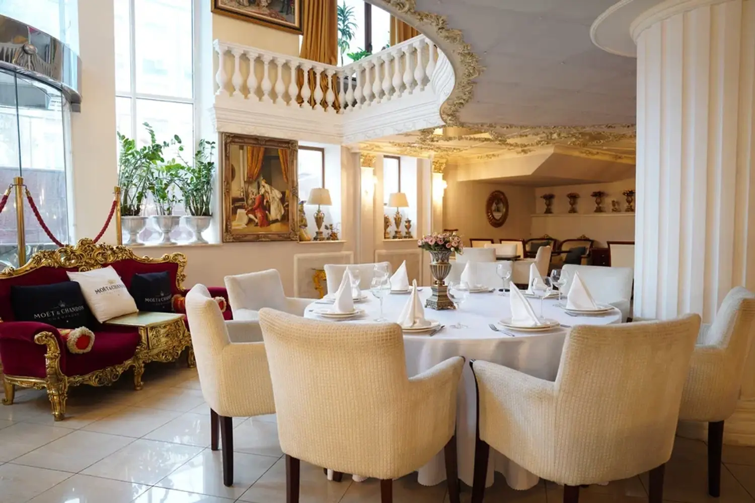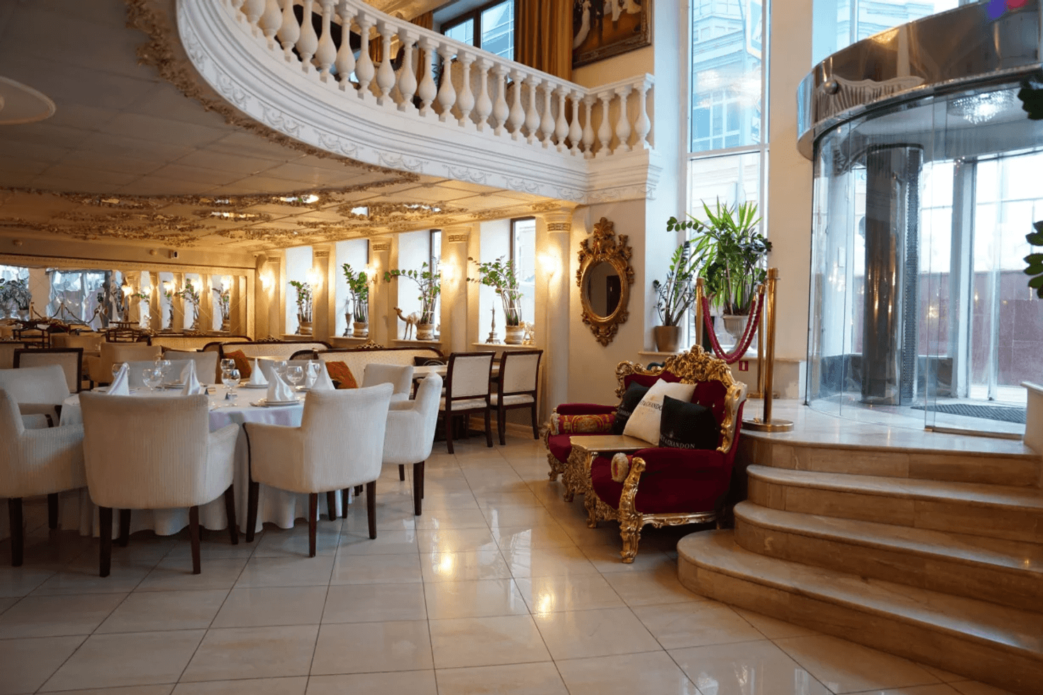 Атмосфера. Пространство оформлено в классическом стиле с акцентами в духе роскоши. Здесь мягкая светлая мебель, много мрамора, позолота и хрусталь.
