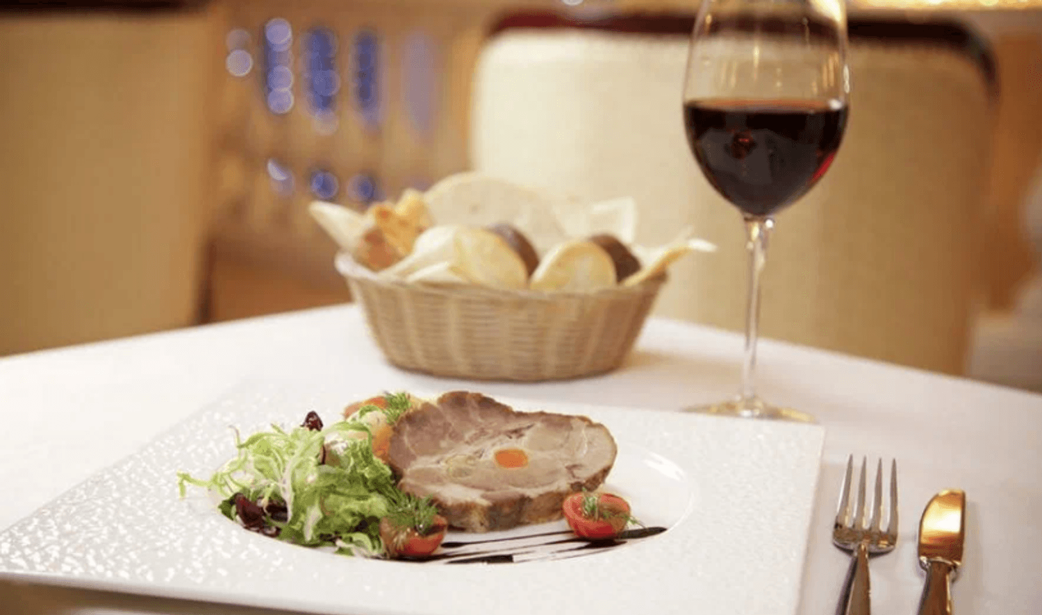 Еда и напитки. Готовят оливье с фермерским цыпленком и красной икрой, котлету по-киевски с пармезаном, пасту с камчатским крабом, малиновый мусс с кули из шампанского. В баре представлен широкий выбор вин, коктейлей и безалкогольных напитков.