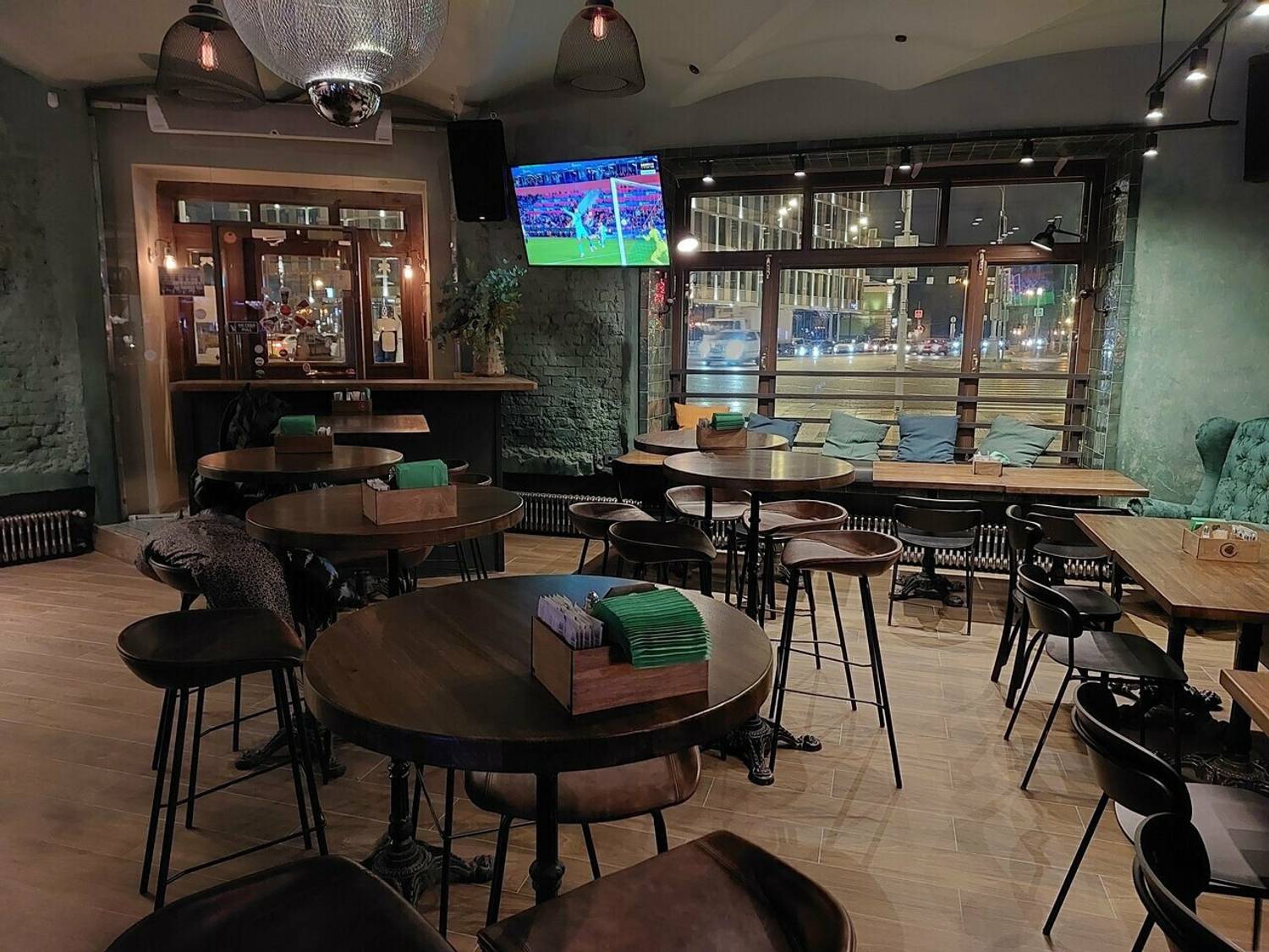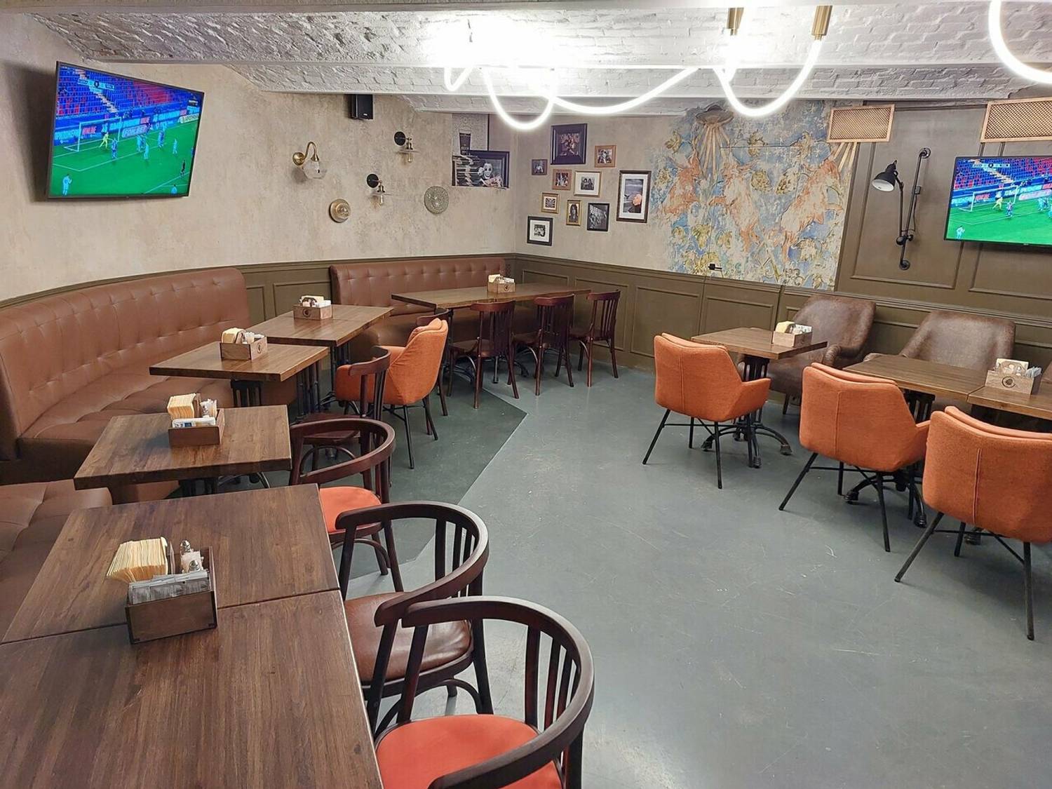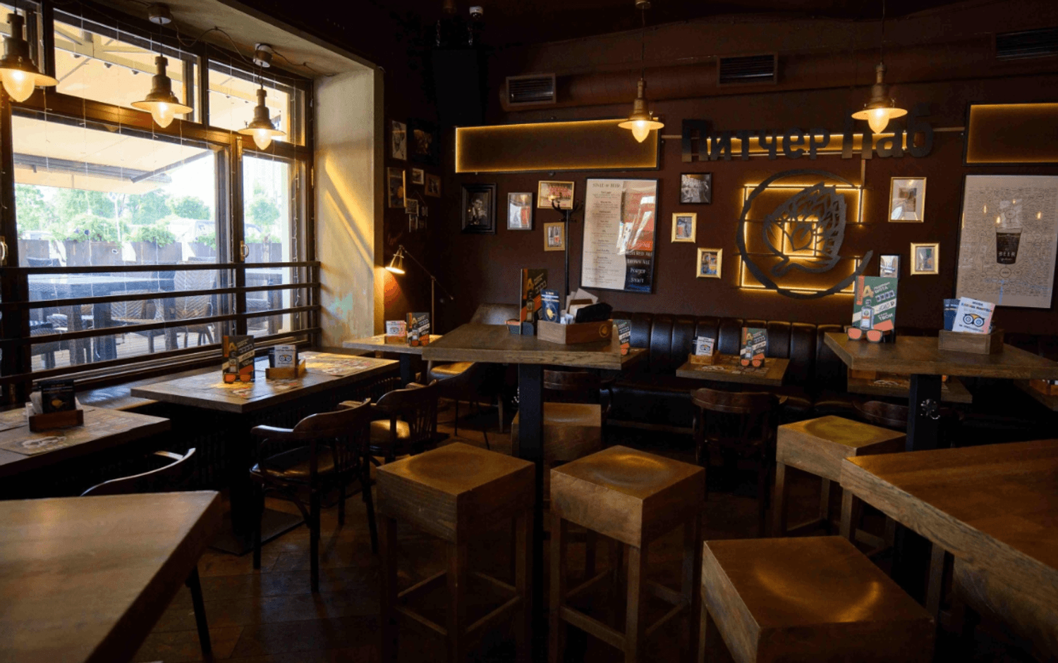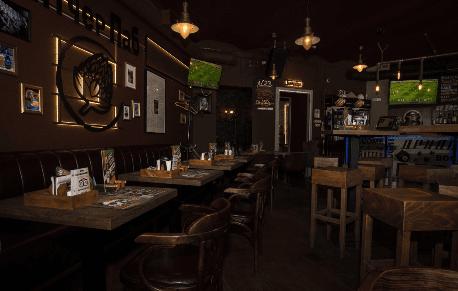 Атмосфера. Два зала оформлены в духе классического английского клубного паба: фактурные стены с патиной, сводчатые потолки, массивная барная стойка и кожаные диваны. В интерьере использованы книжные шкафы, картины и диваны в оконных нишах, создающие камерную обстановку.