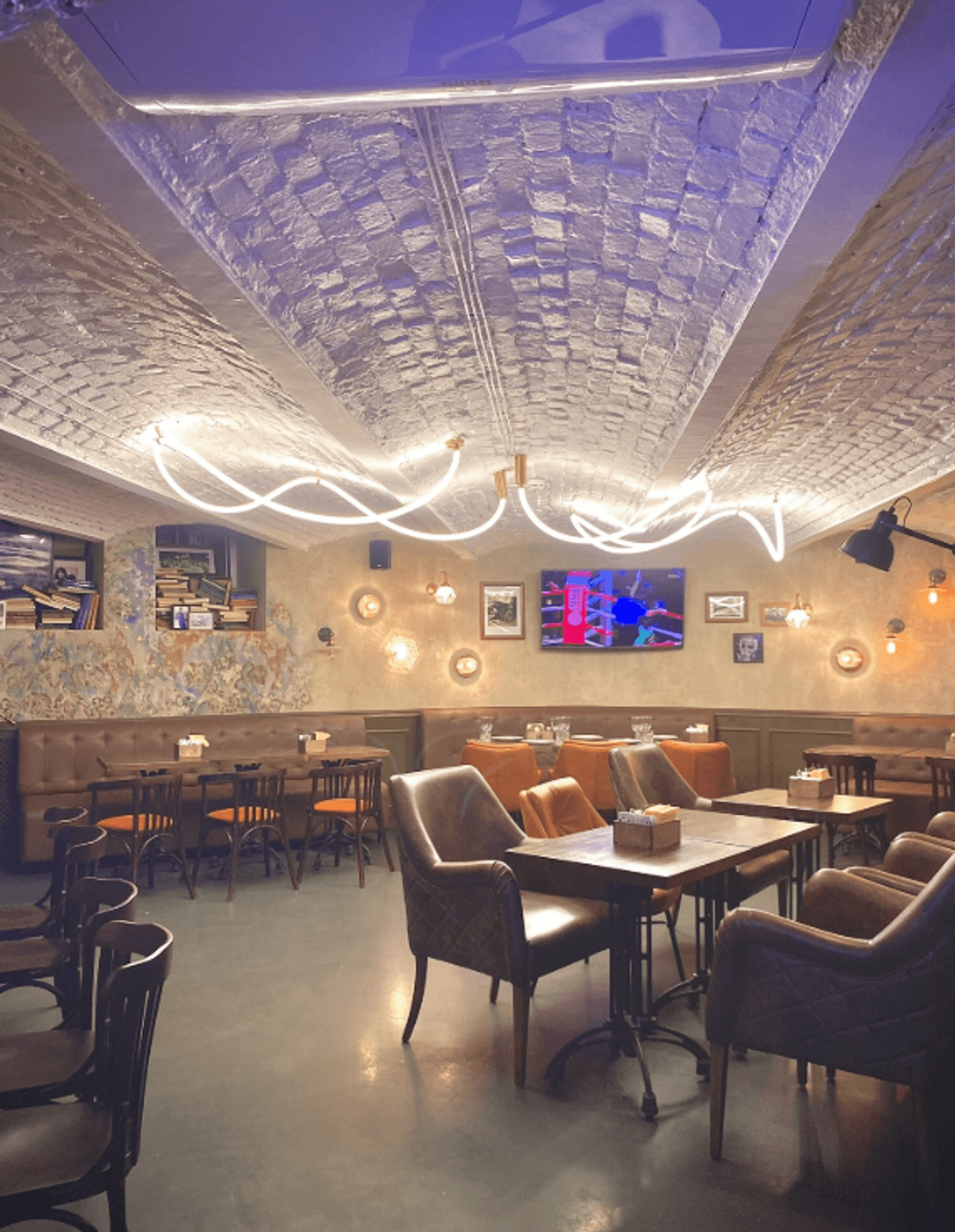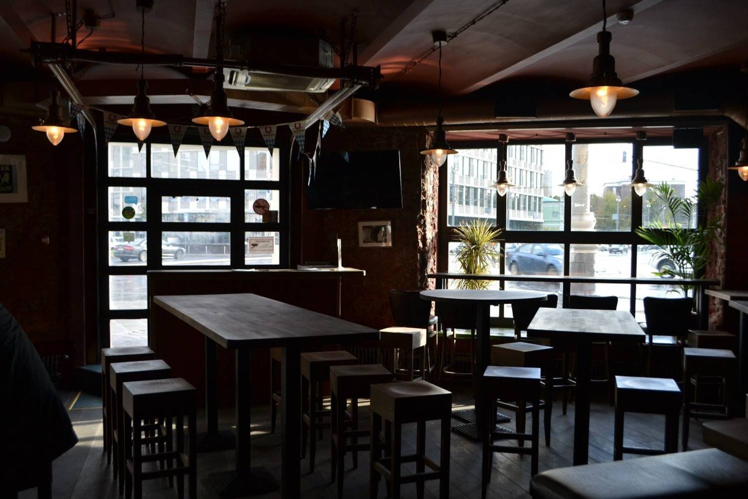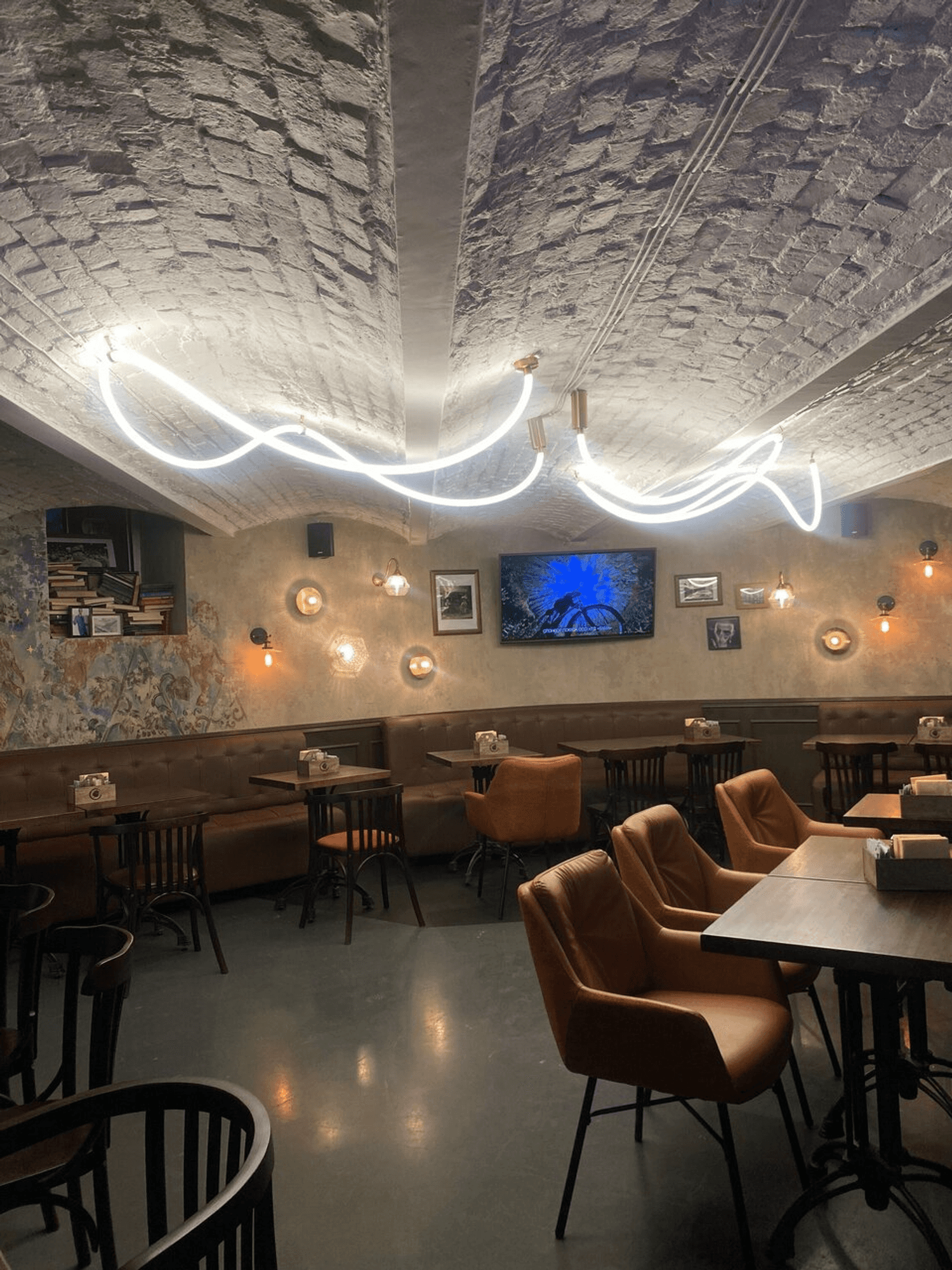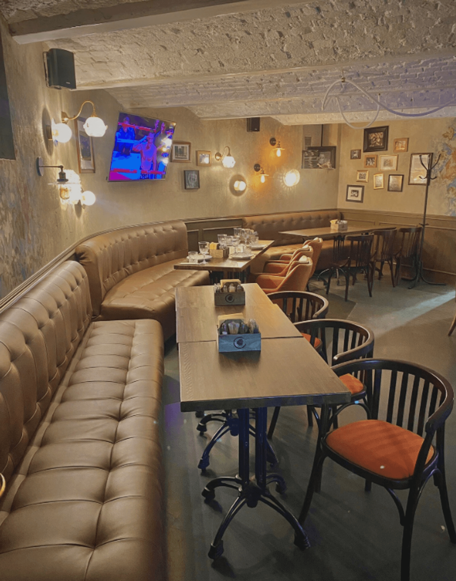 Атмосфера. Два зала оформлены в духе классического английского клубного паба: фактурные стены с патиной, сводчатые потолки, массивная барная стойка и кожаные диваны. В интерьере использованы книжные шкафы, картины и диваны в оконных нишах, создающие камерную обстановку.