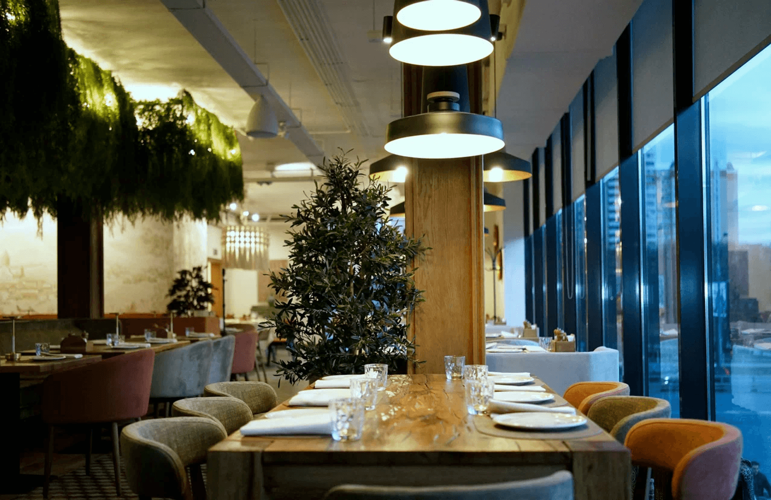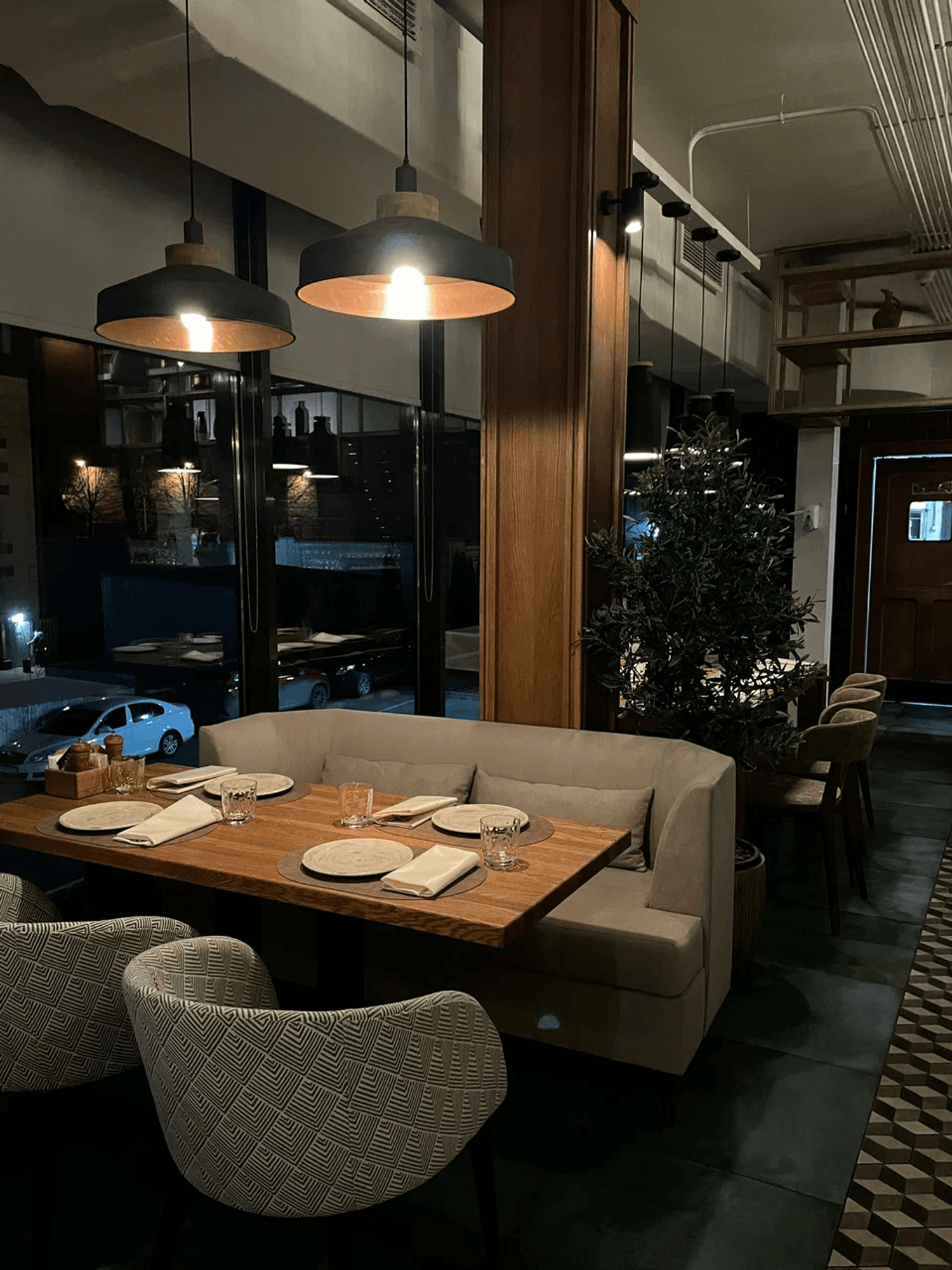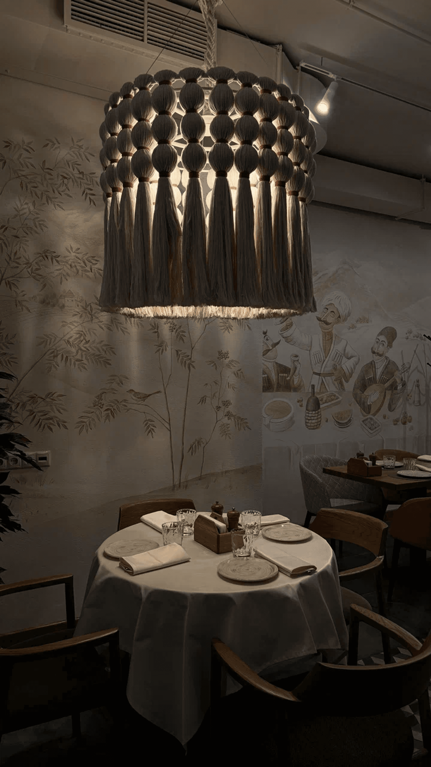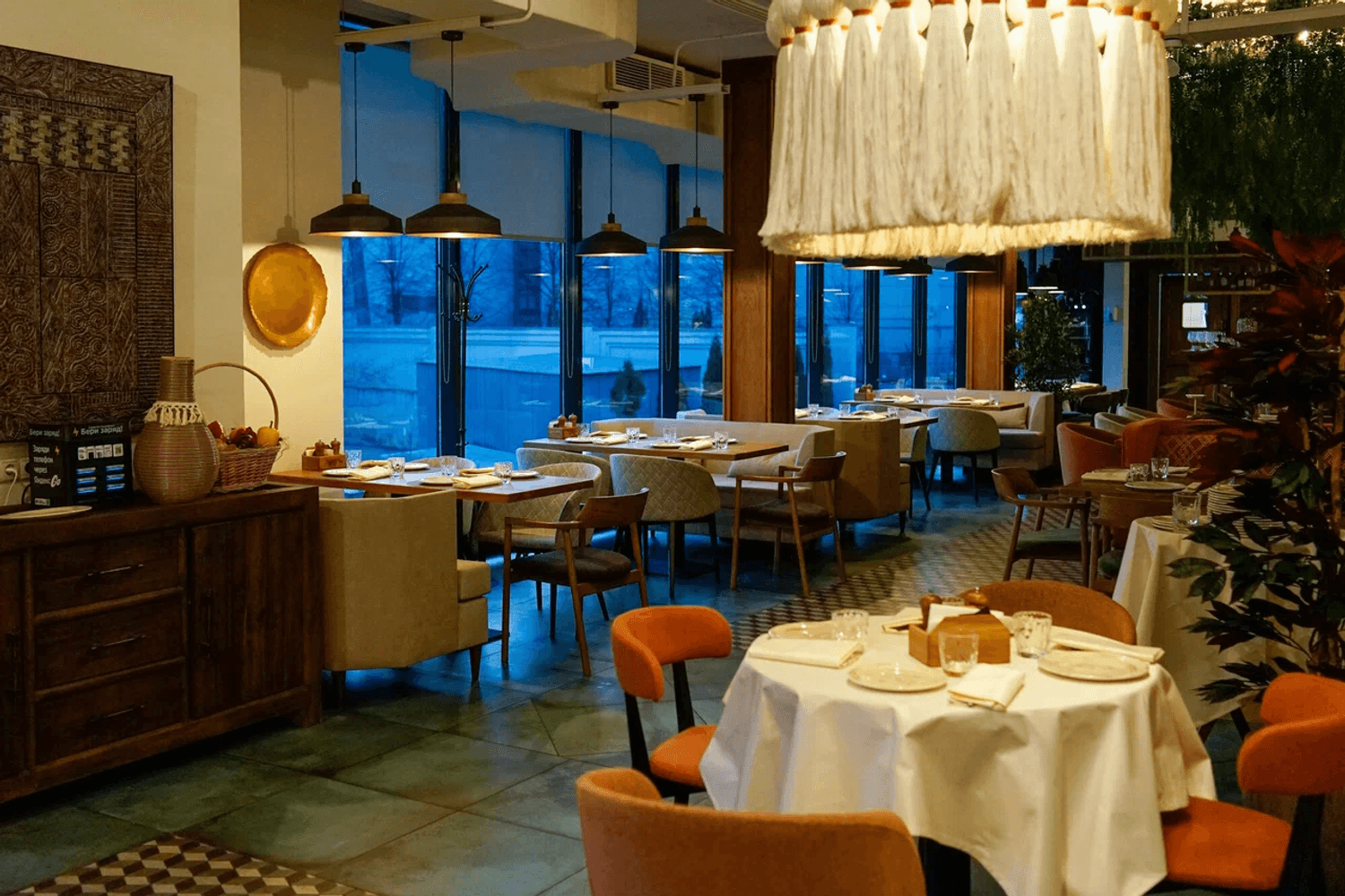 Атмосфера. Интерьер сочетает сдержанную европейскую эстетику с яркими грузинскими деталями: деревянные балки, орнаменты и обилие зелени создают теплую, по-домашнему уютную обстановку. Пространство с мягкими диванами и отдельными зонами подходит как для камерных встреч, так и для масштабных праздников.