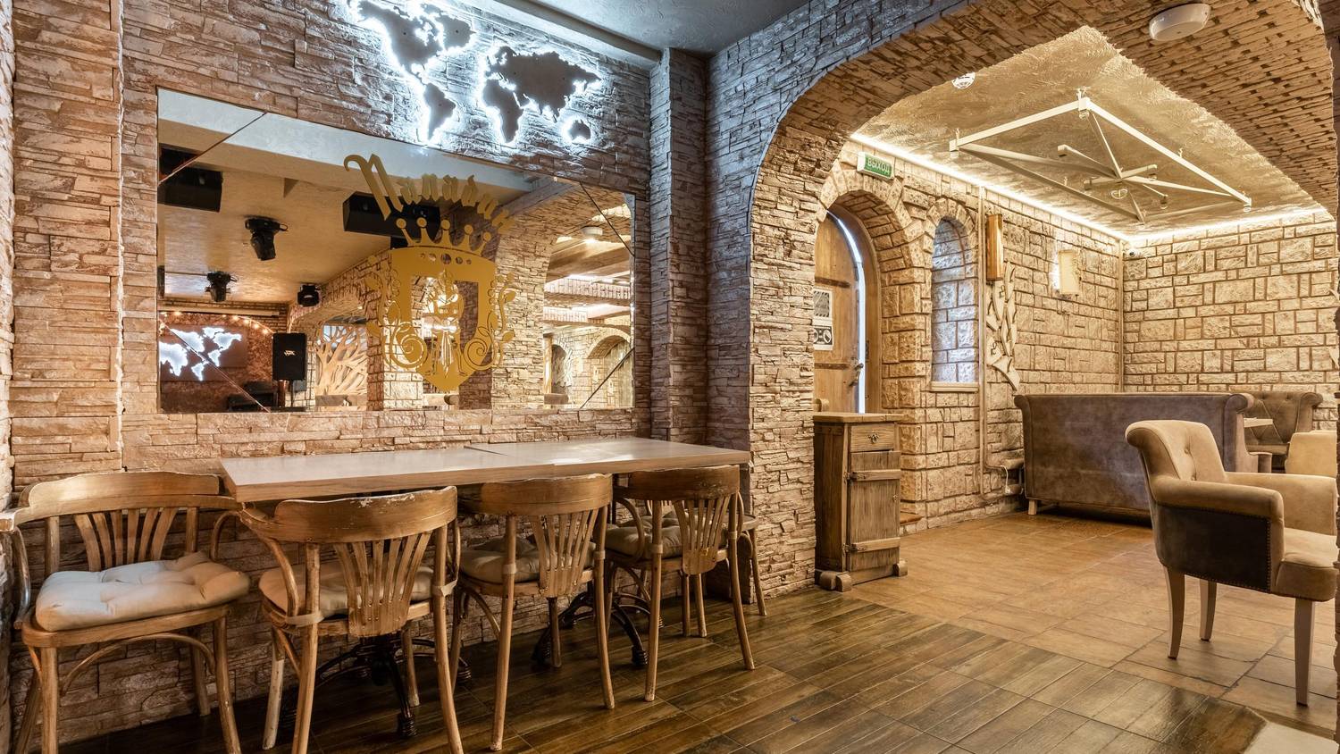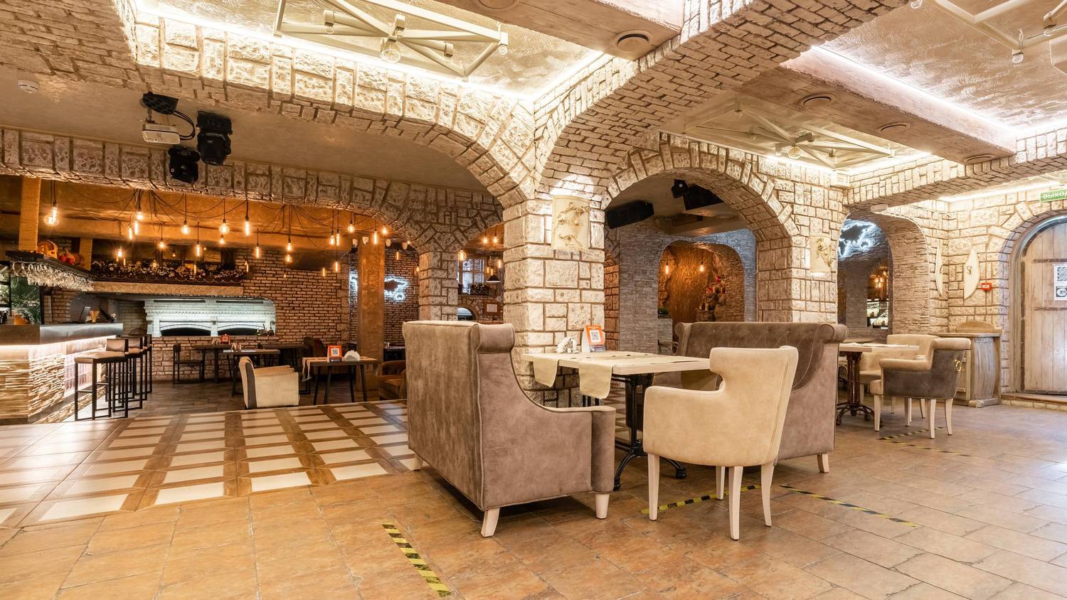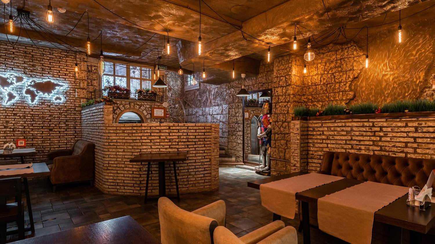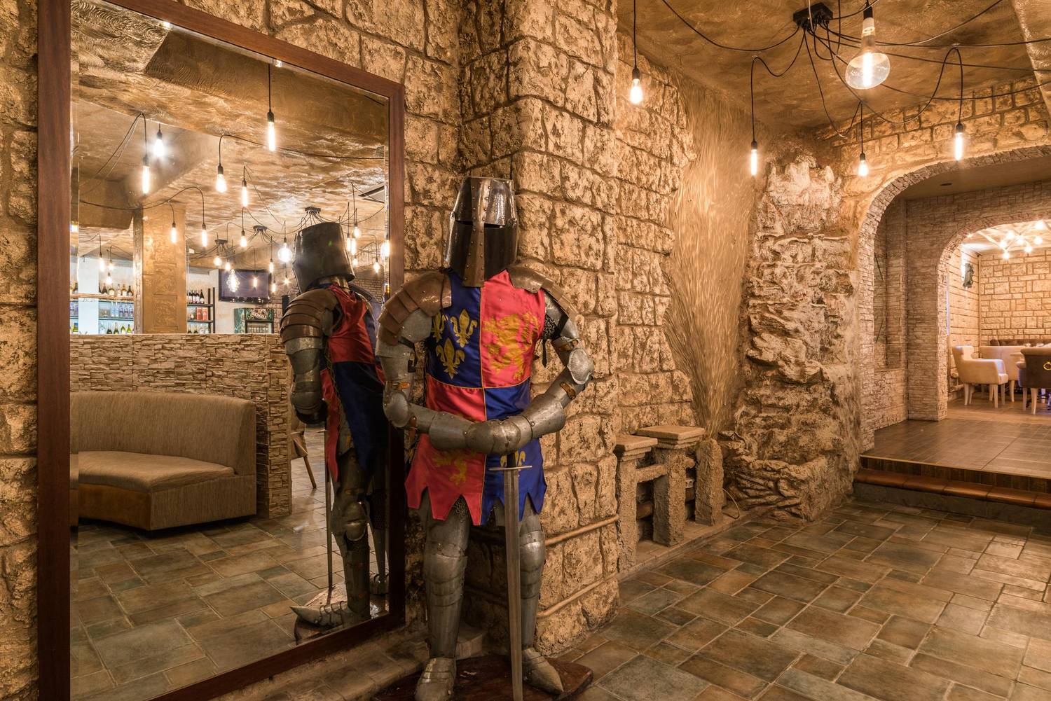 Атмосфера. Пространство с теплыми оттенками и состаренным кирпичом погружает в атмосферу рыцарских времен: гостей встречает страж в доспехах, а светильники-свечи создают особое таинственное настроение.