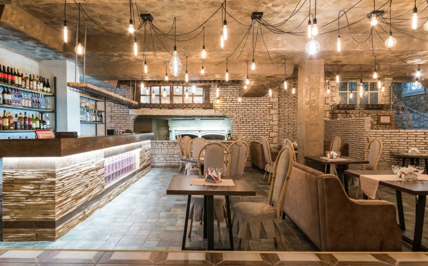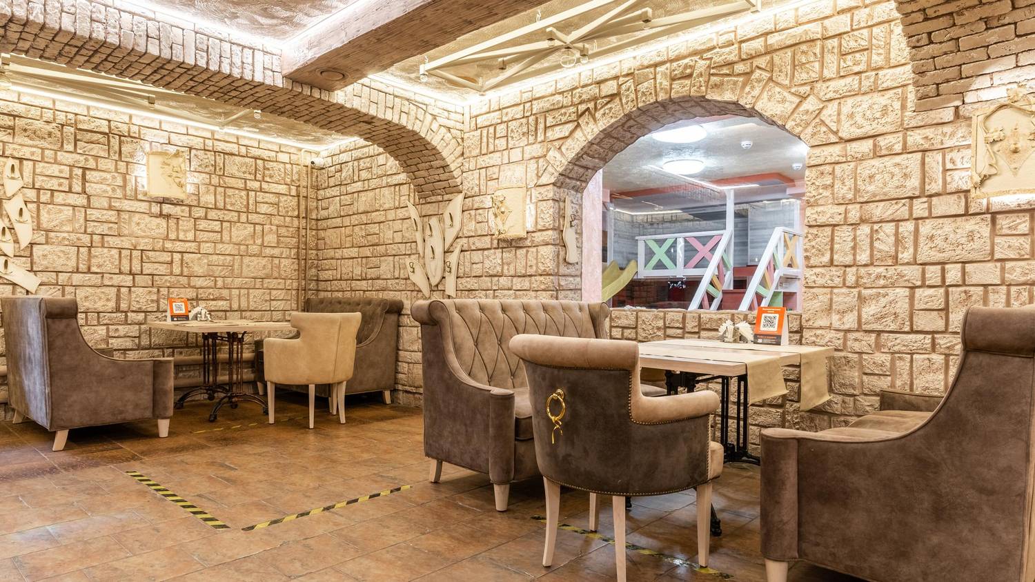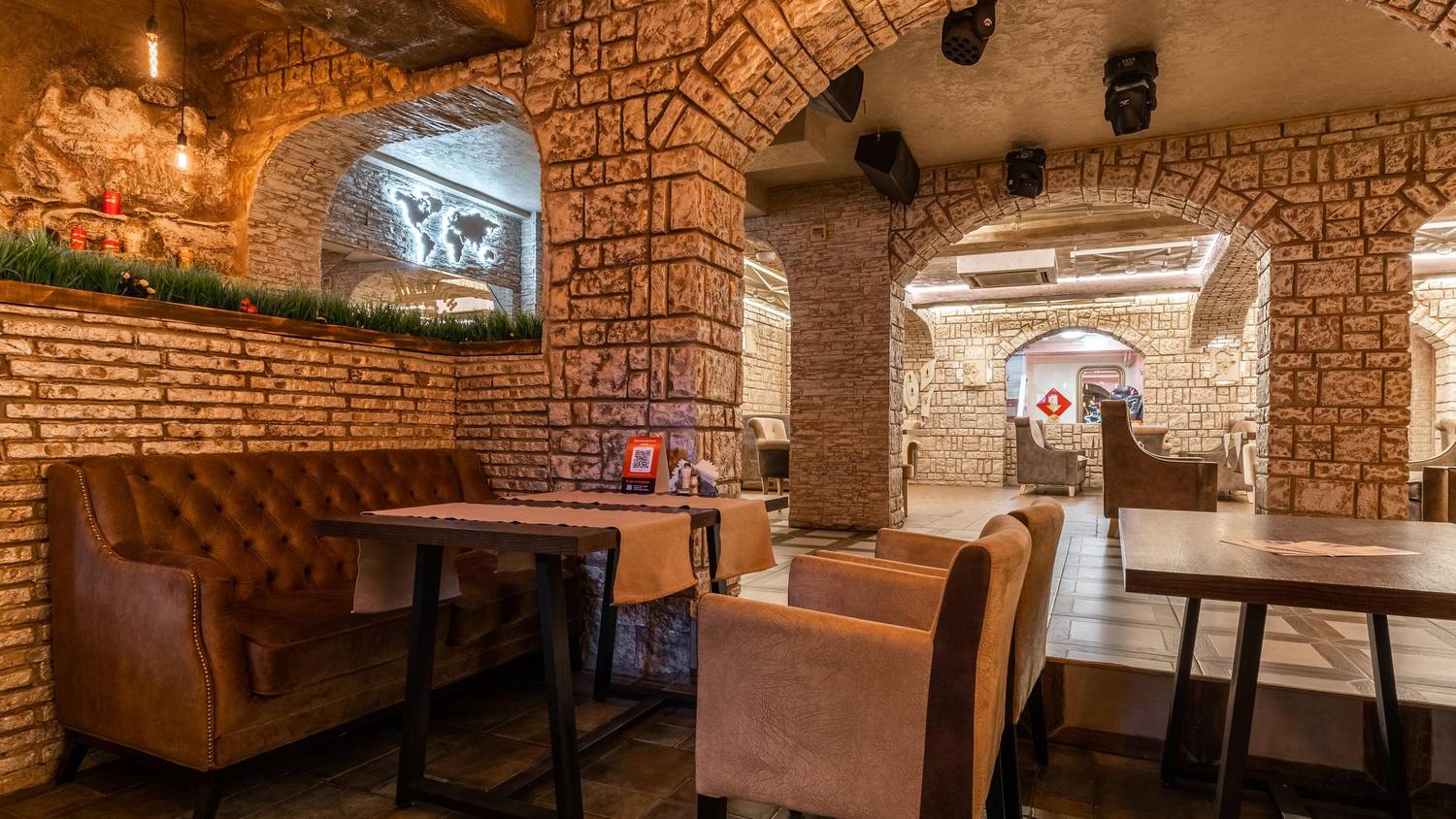 Атмосфера. Пространство с теплыми оттенками и состаренным кирпичом погружает в атмосферу рыцарских времен: гостей встречает страж в доспехах, а светильники-свечи создают особое таинственное настроение.