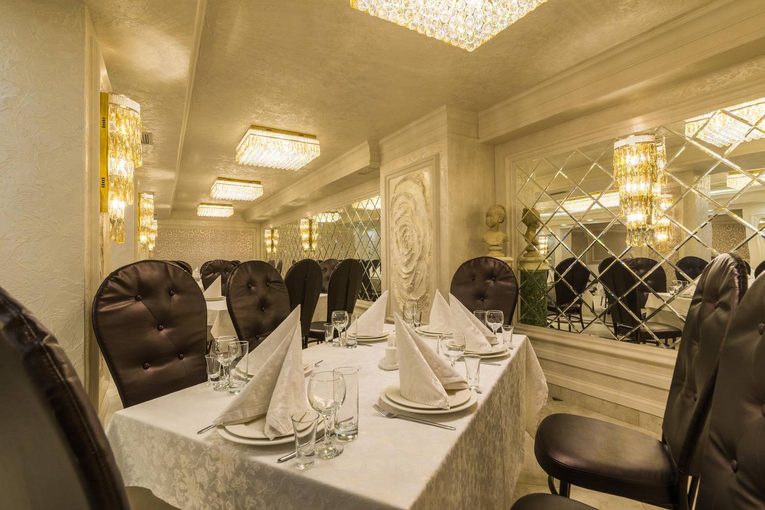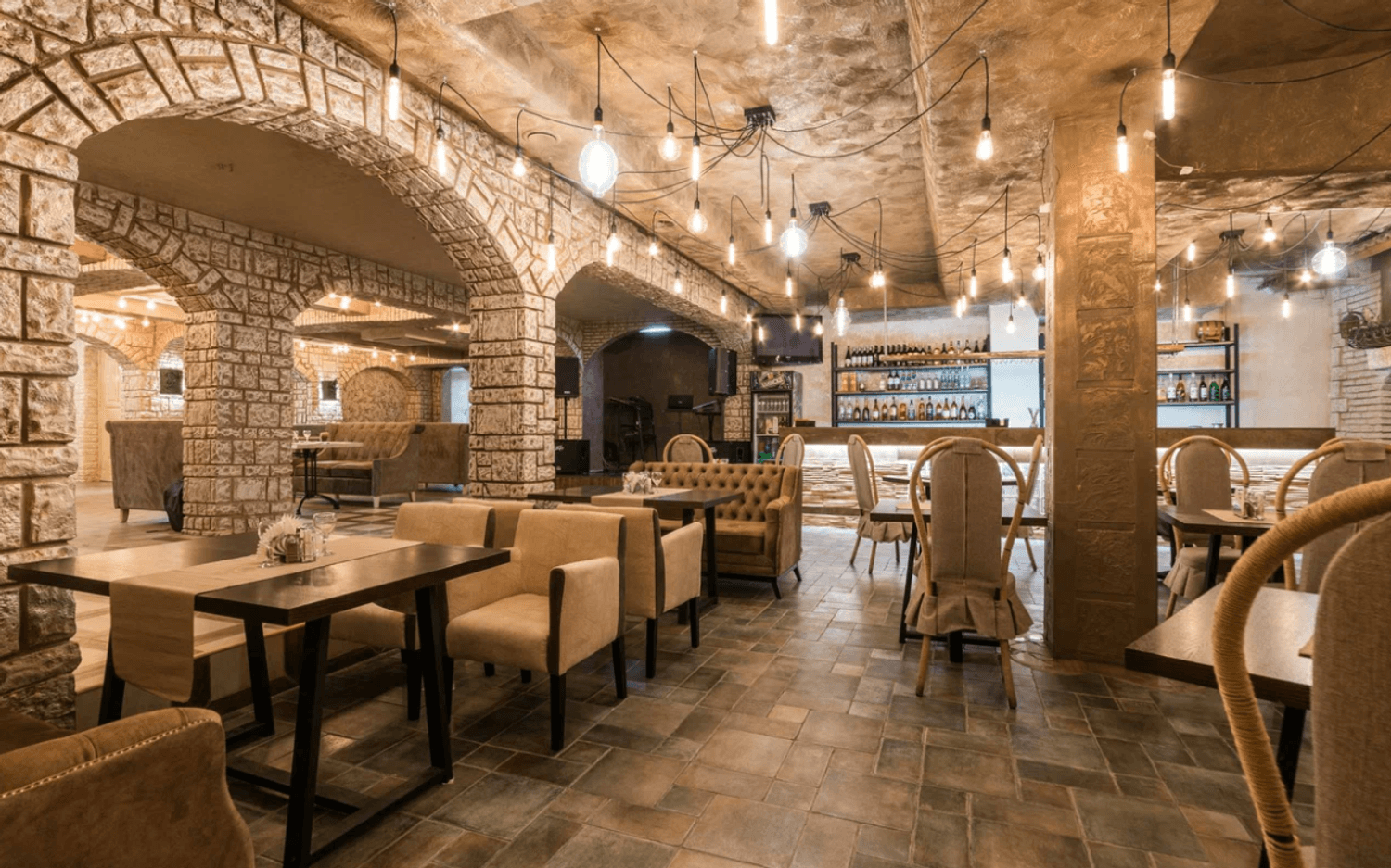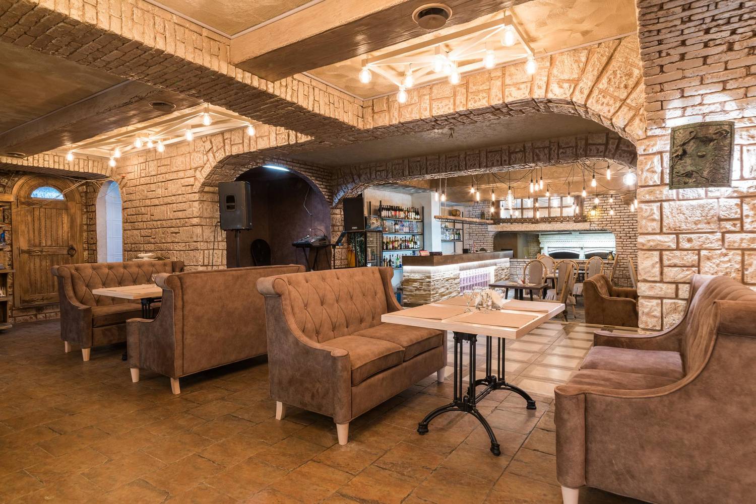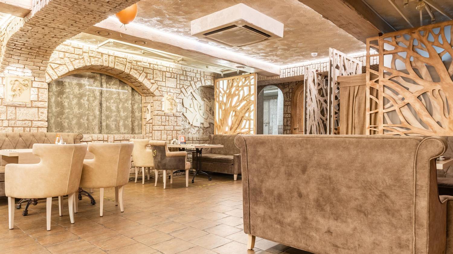 Атмосфера. Пространство с теплыми оттенками и состаренным кирпичом погружает в атмосферу рыцарских времен: гостей встречает страж в доспехах, а светильники-свечи создают особое таинственное настроение.