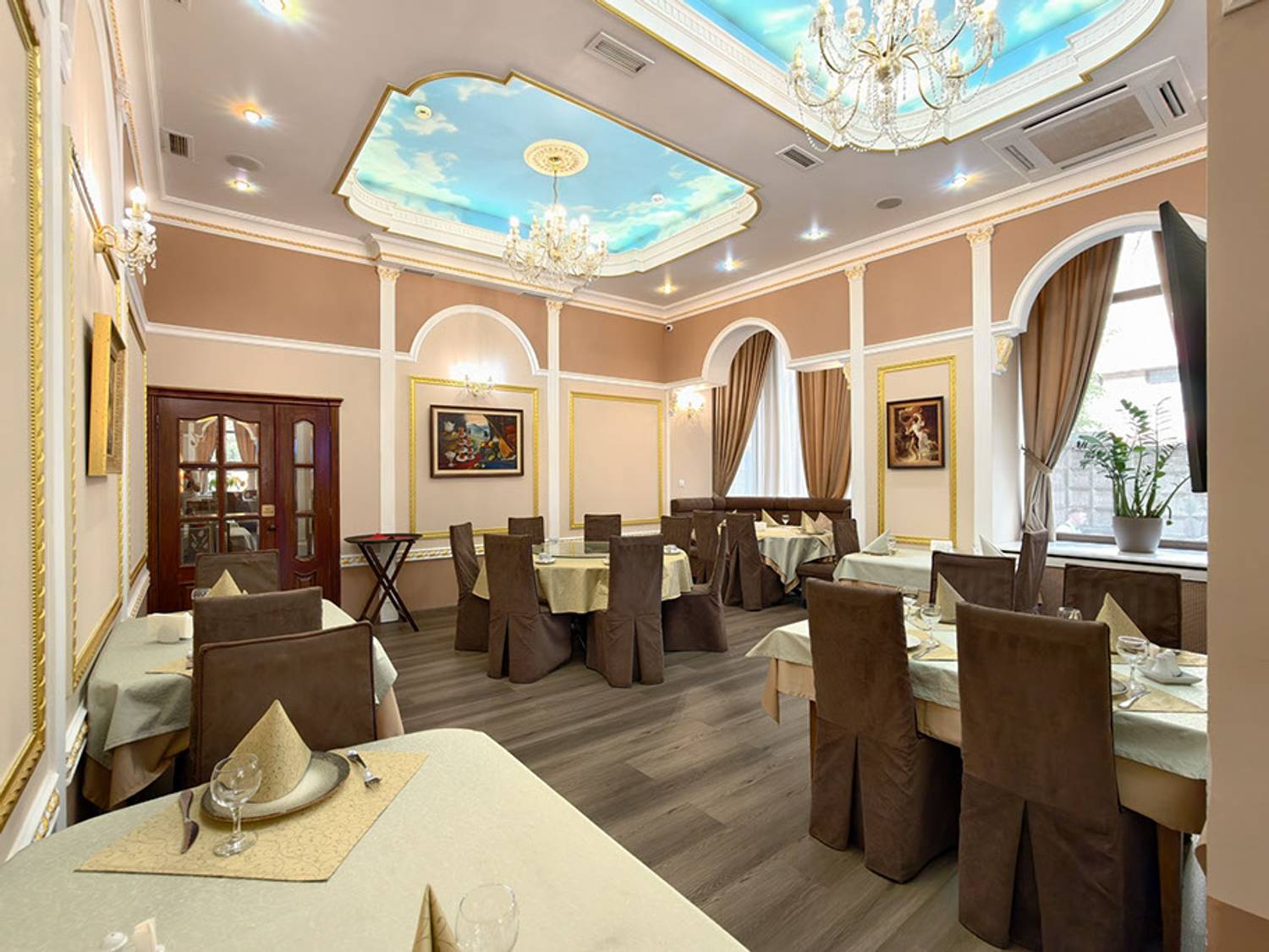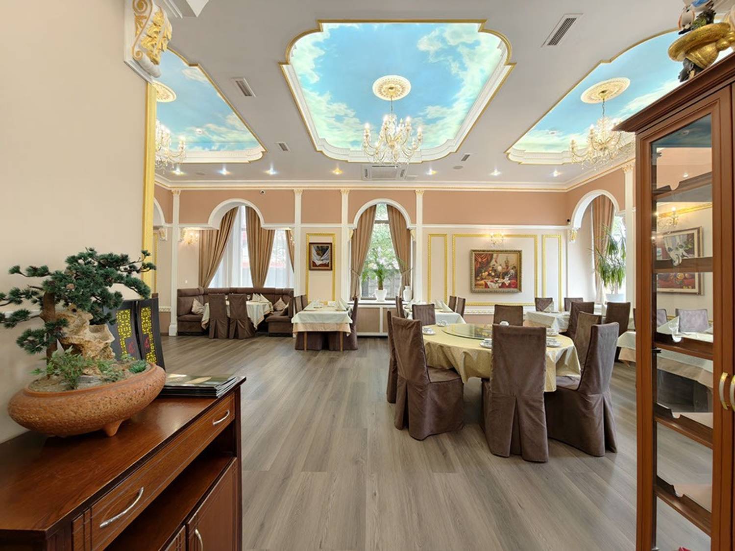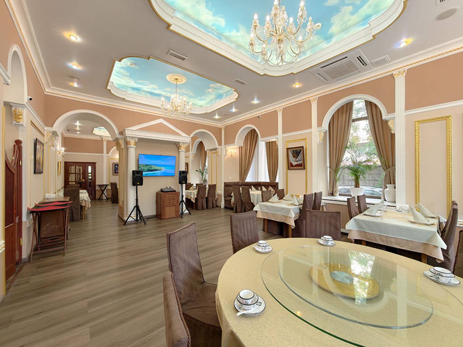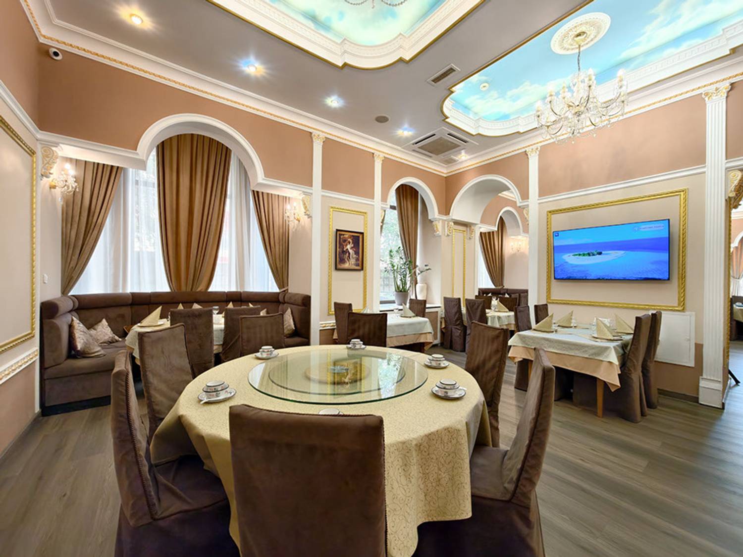 Атмосфера. Пространство разделено на несколько зон: основной зал с лепниной, хрустальными люстрами и золотыми портьерами, а также камерные VIP-комнаты и караоке-залом на 24 персоны. Светлая цветовая гамма, мягкое освещение и восточные декоративные элементы поддерживают баланс между роскошью и уютом.