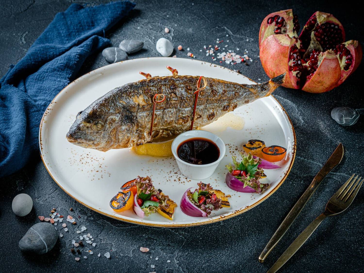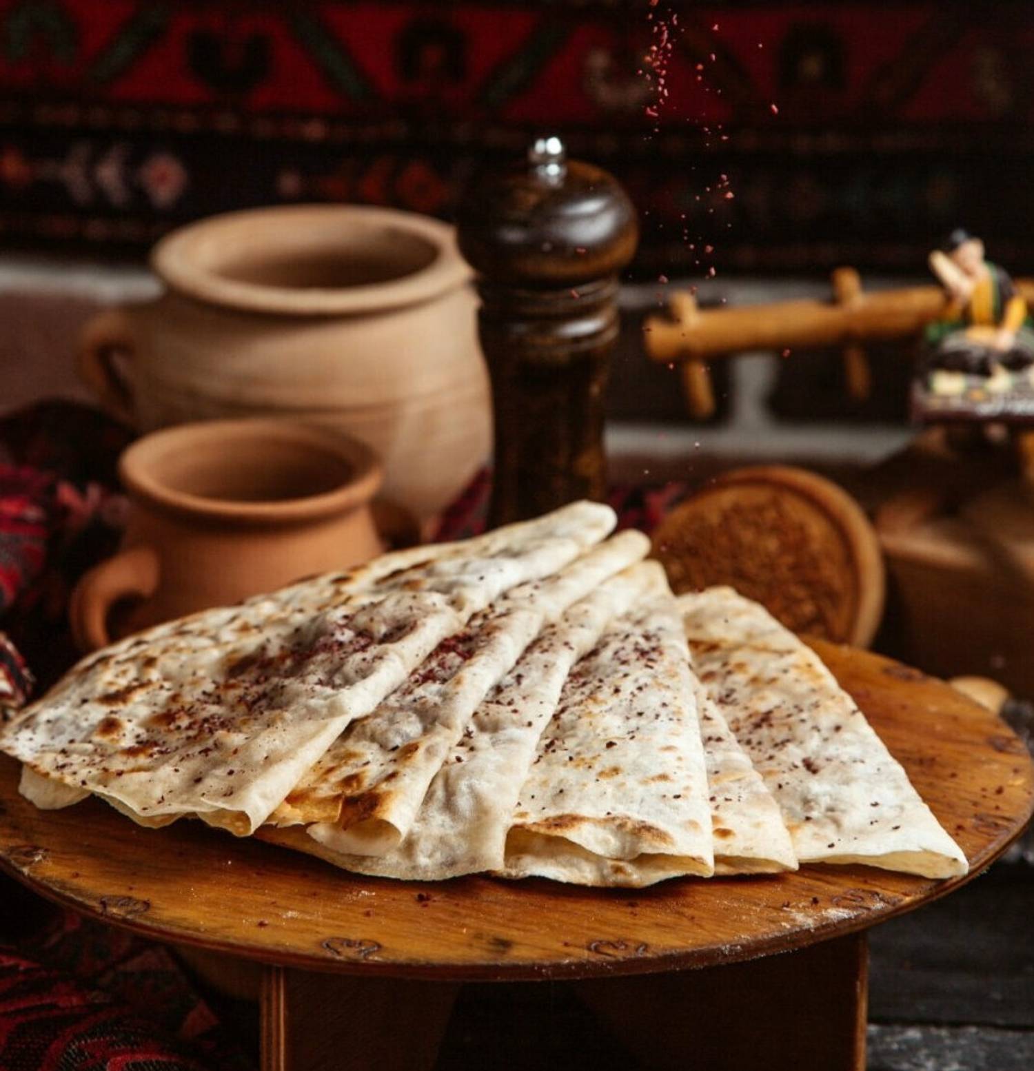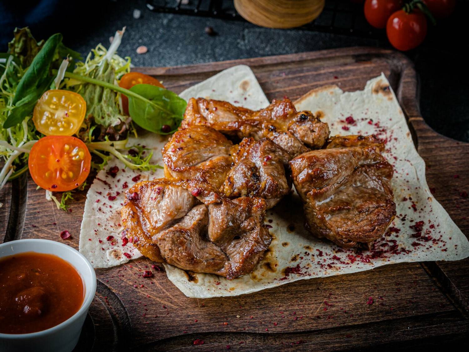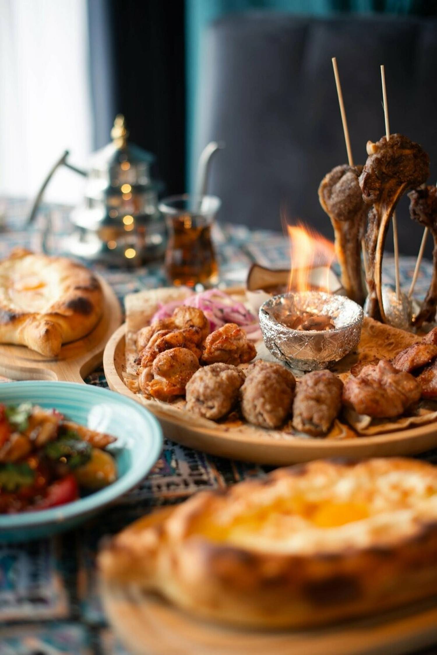 Еда и напитки. В меню — блюда кавказской кухни: жареная гюрза, дюшбара с бараниной, харчо по-грузински, осетинский пирог с курицей и грибами, манты с бараниной. Также готовят мясо на мангале: каре ягненка, бараньи ребрышки или сердце, люля-кебаб из телятины.