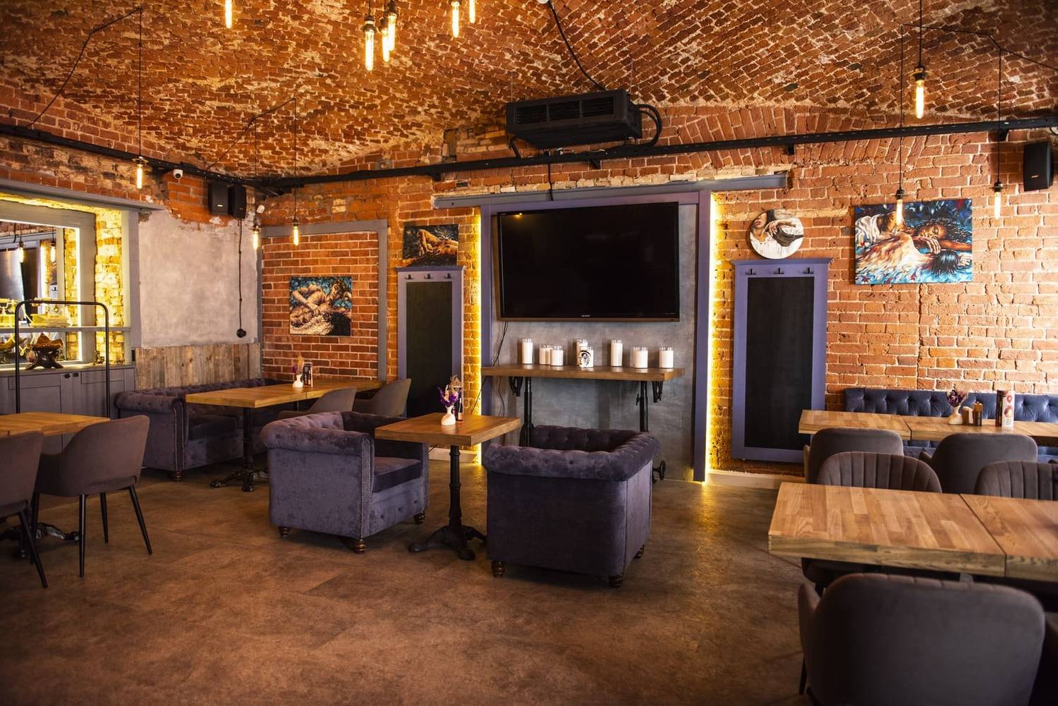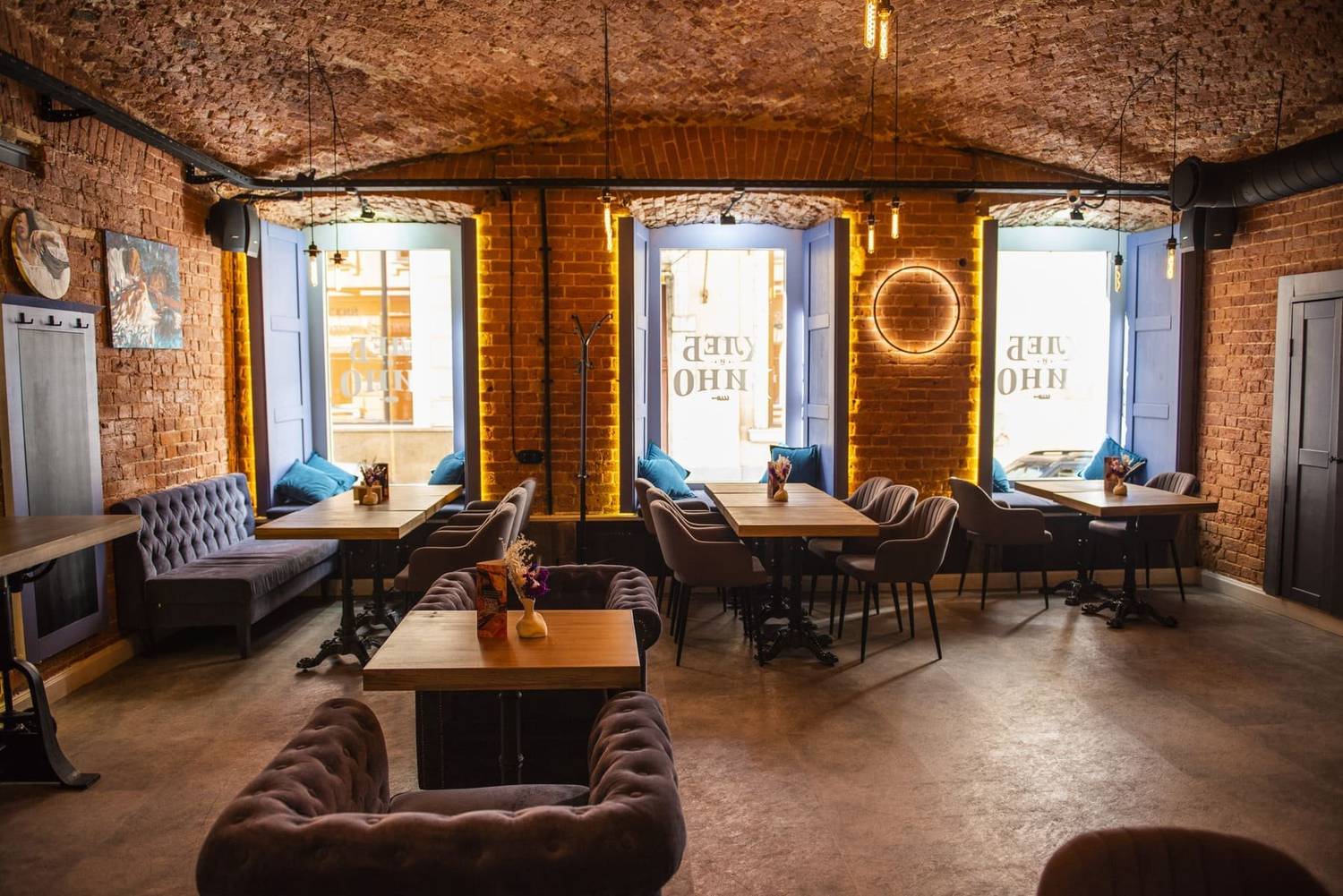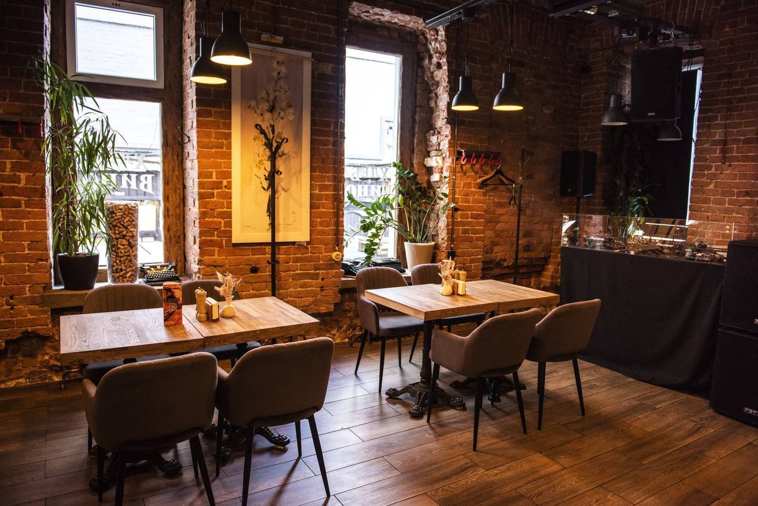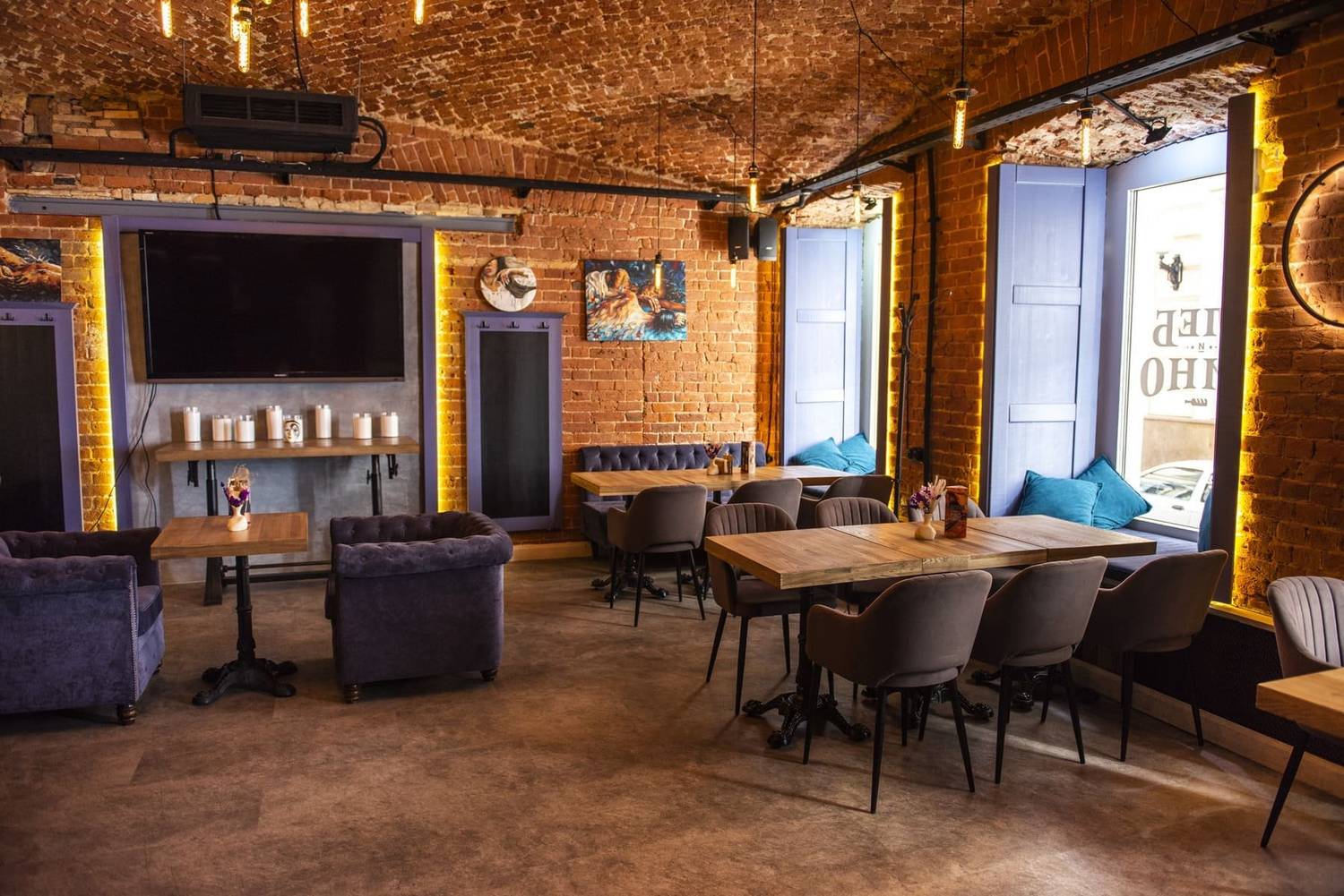 Атмосфера. Пространство разделено на два основных зала и VIP-зону. В интерьере сочетаются кирпичные стены, мягкая мебель, работы современных художников, комнатные растения и атмосферные деревянные ставни на окнах, а вечернее освещение создает романтическую обстановку, подходящую для свиданий и камерных встреч.