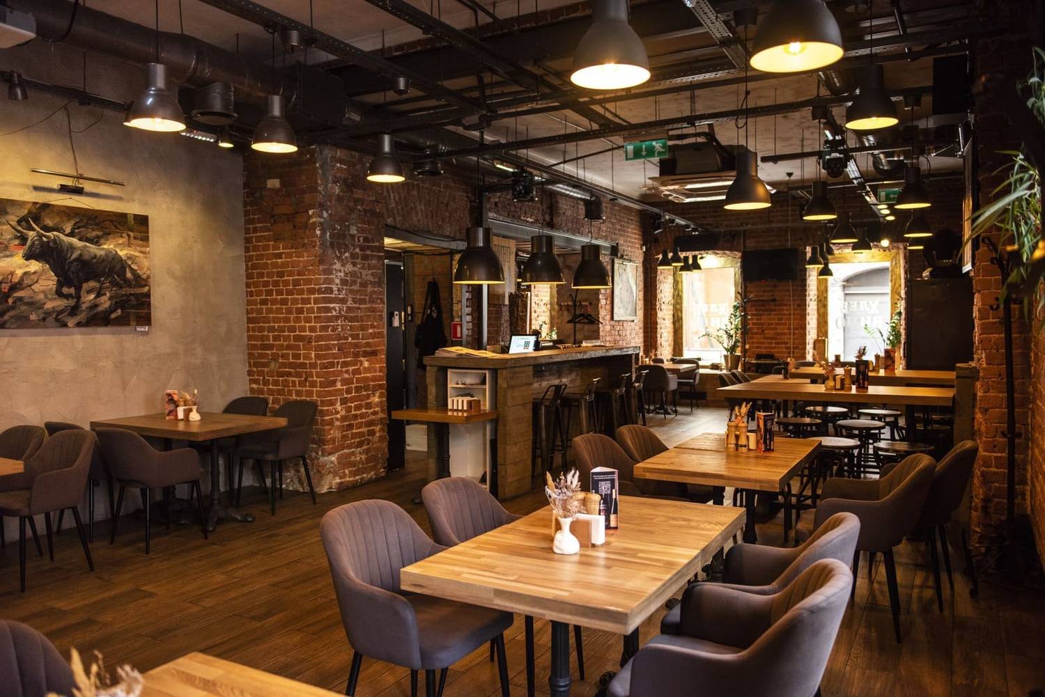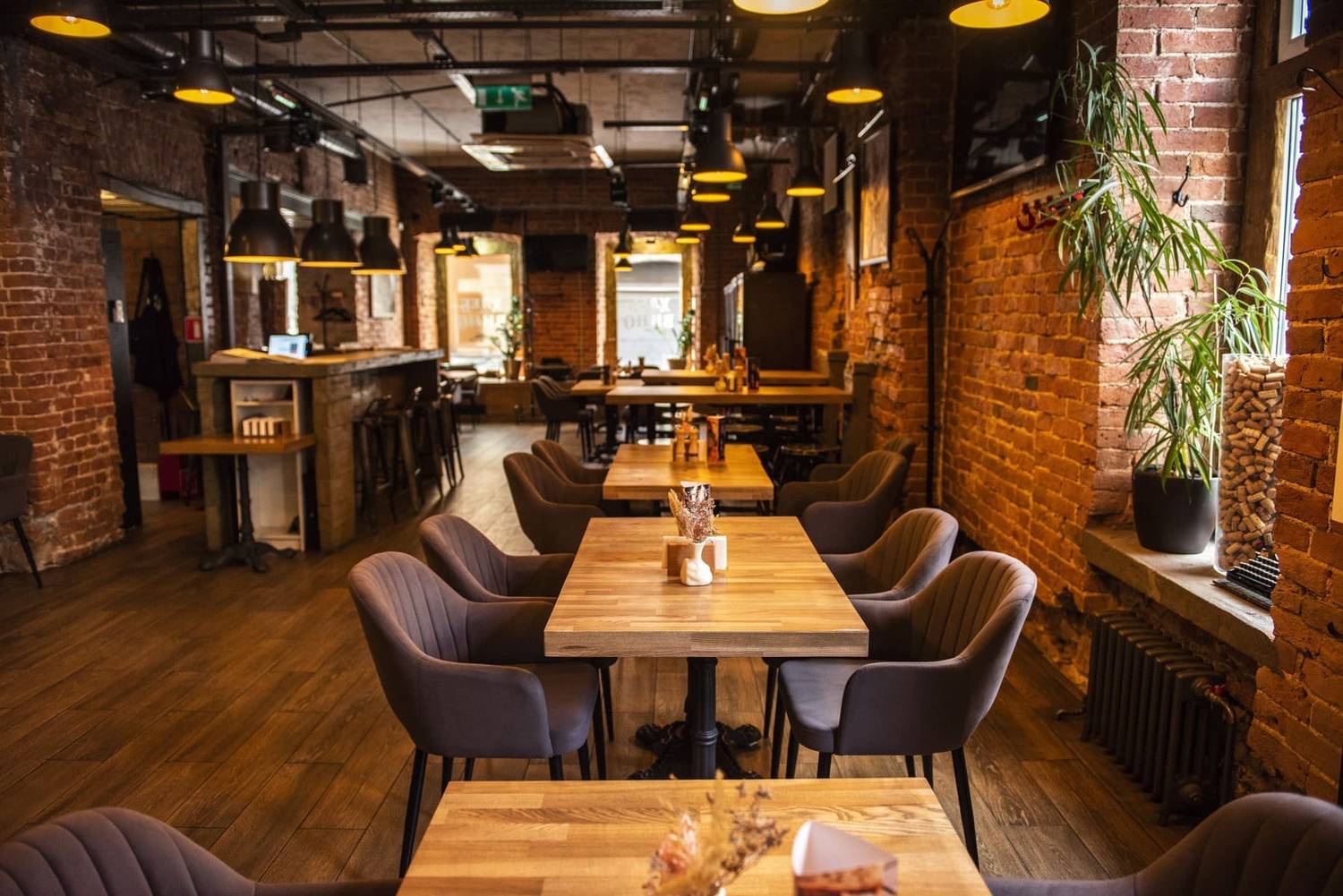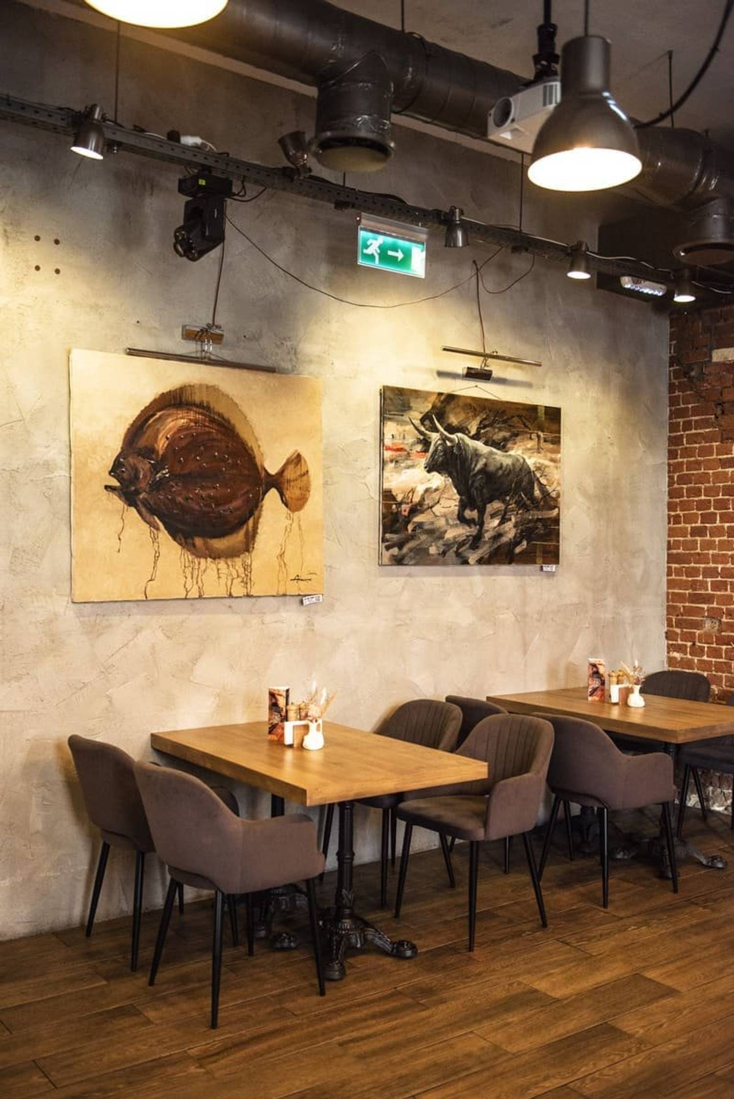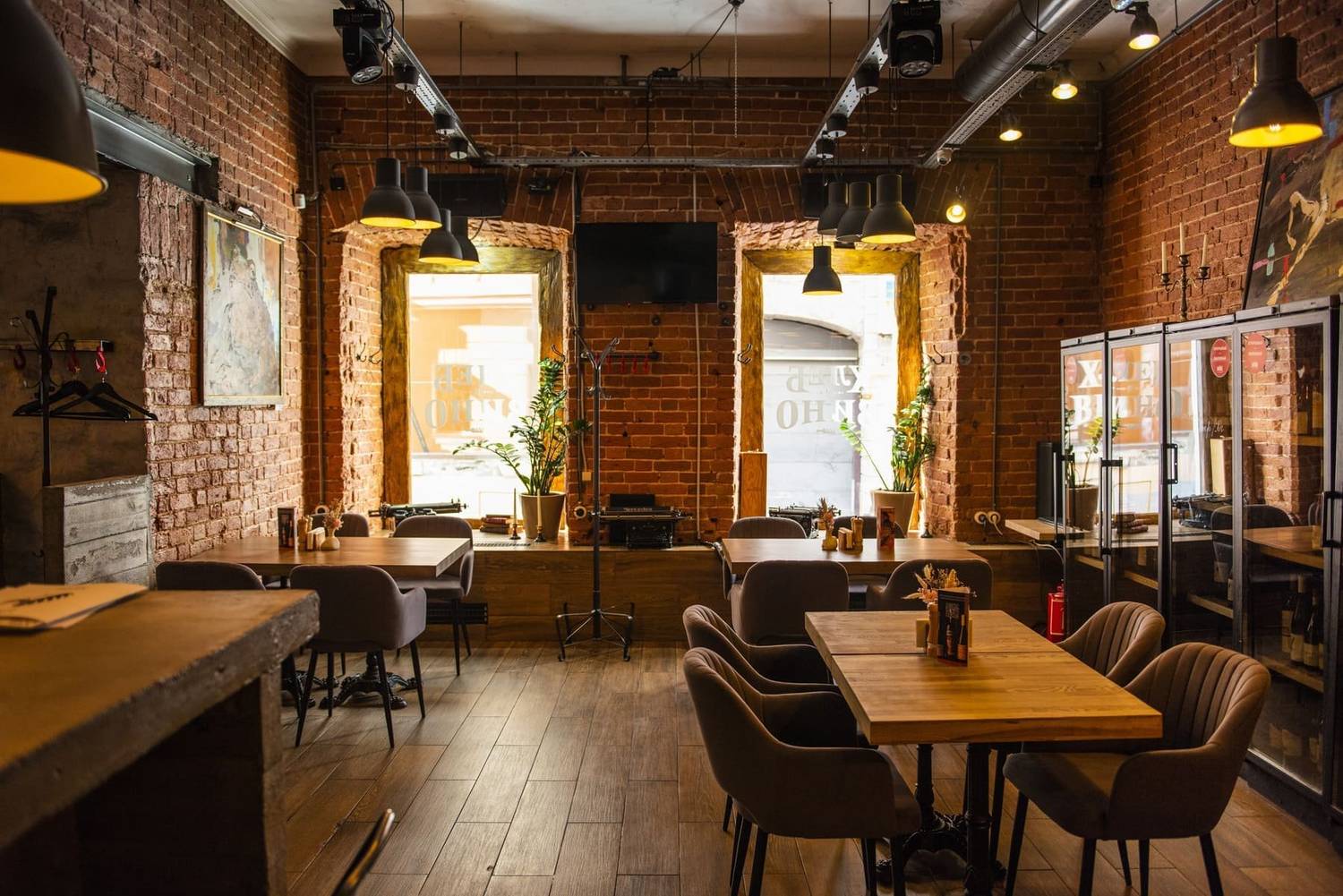 Атмосфера. Пространство разделено на два основных зала и VIP-зону. В интерьере сочетаются кирпичные стены, мягкая мебель, работы современных художников, комнатные растения и атмосферные деревянные ставни на окнах, а вечернее освещение создает романтическую обстановку, подходящую для свиданий и камерных встреч.