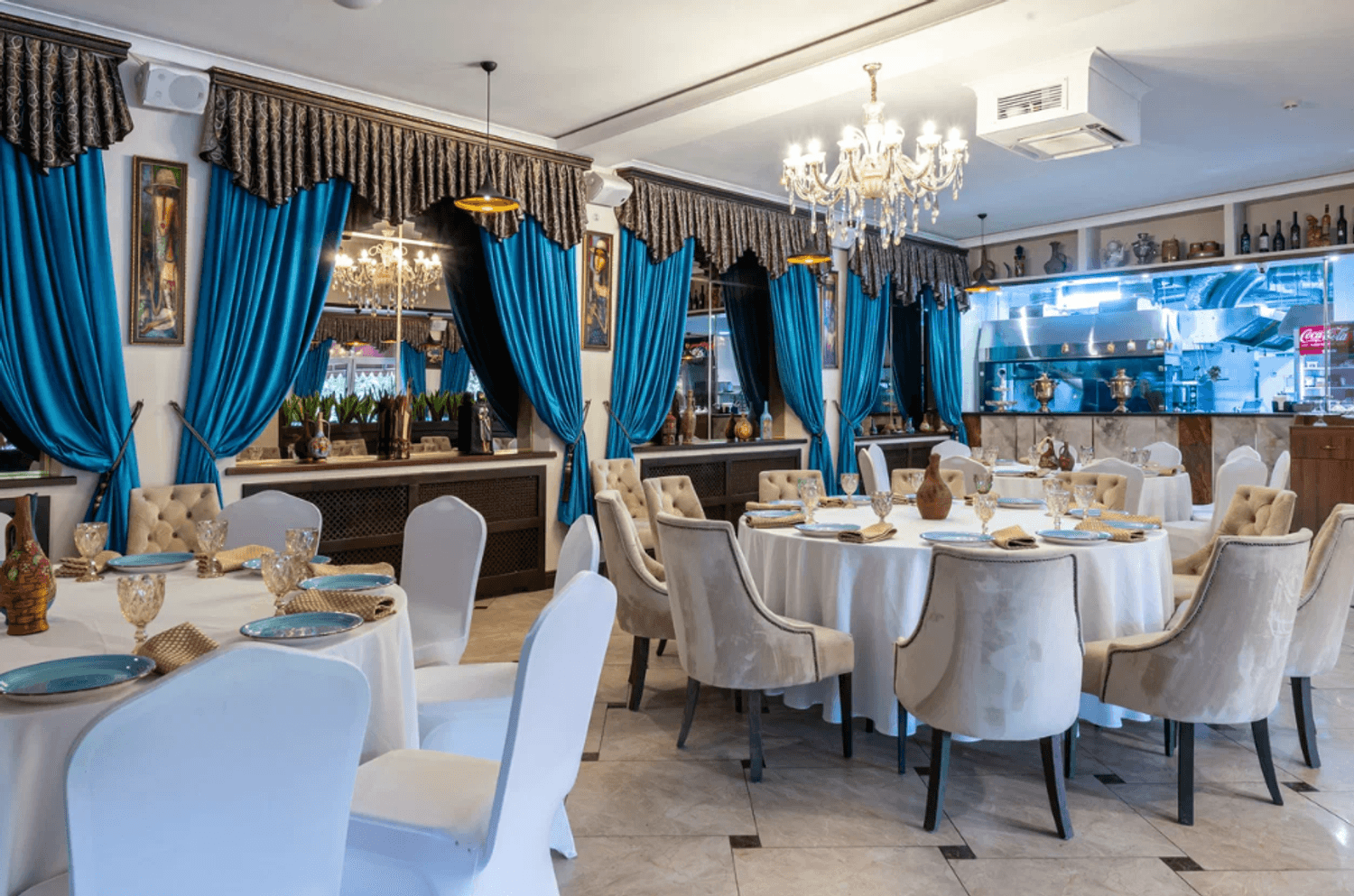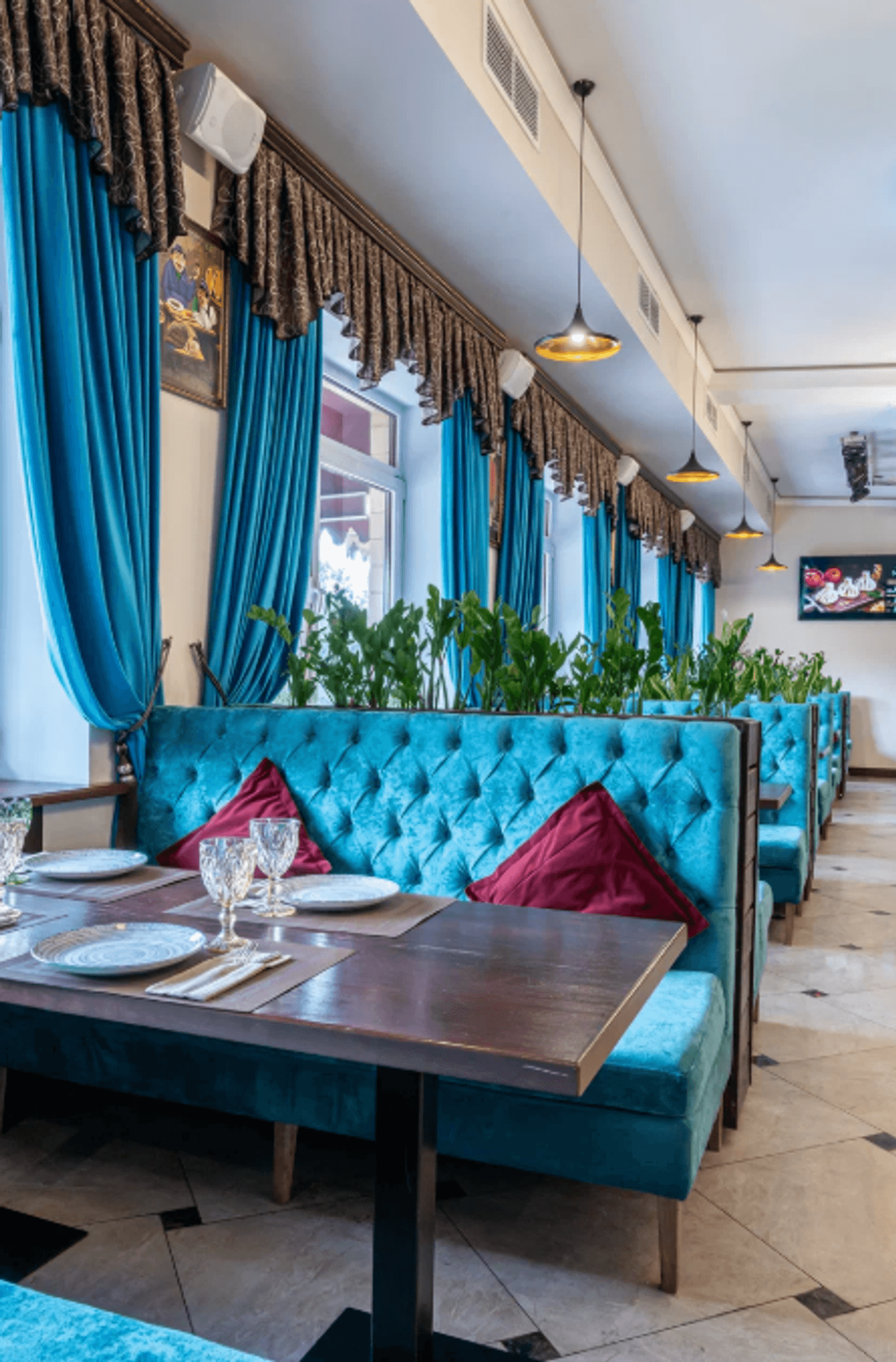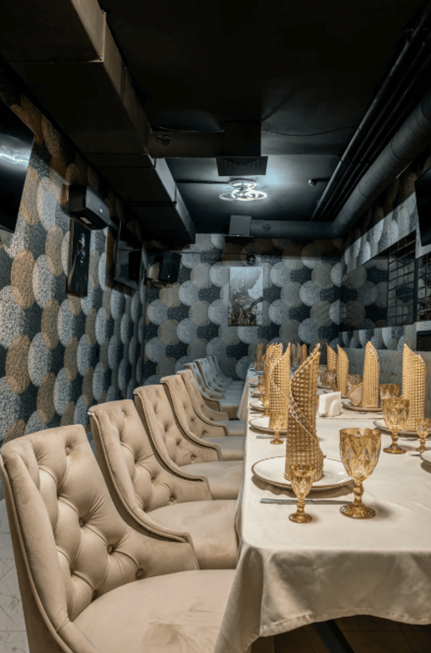Атмосфера. Пространство с грузинским ярким текстилем, деревянной отделкой и декоративными элементами национальной керамики разделено на несколько зон: есть основной зал, банкетные помещения и караоке-комнаты. Интерьер передает национальный колорит, при этом сохраняя возможность для дополнительного декорирования и самых разных форматов мероприятий: от камерных ужинов до масштабных застолий.