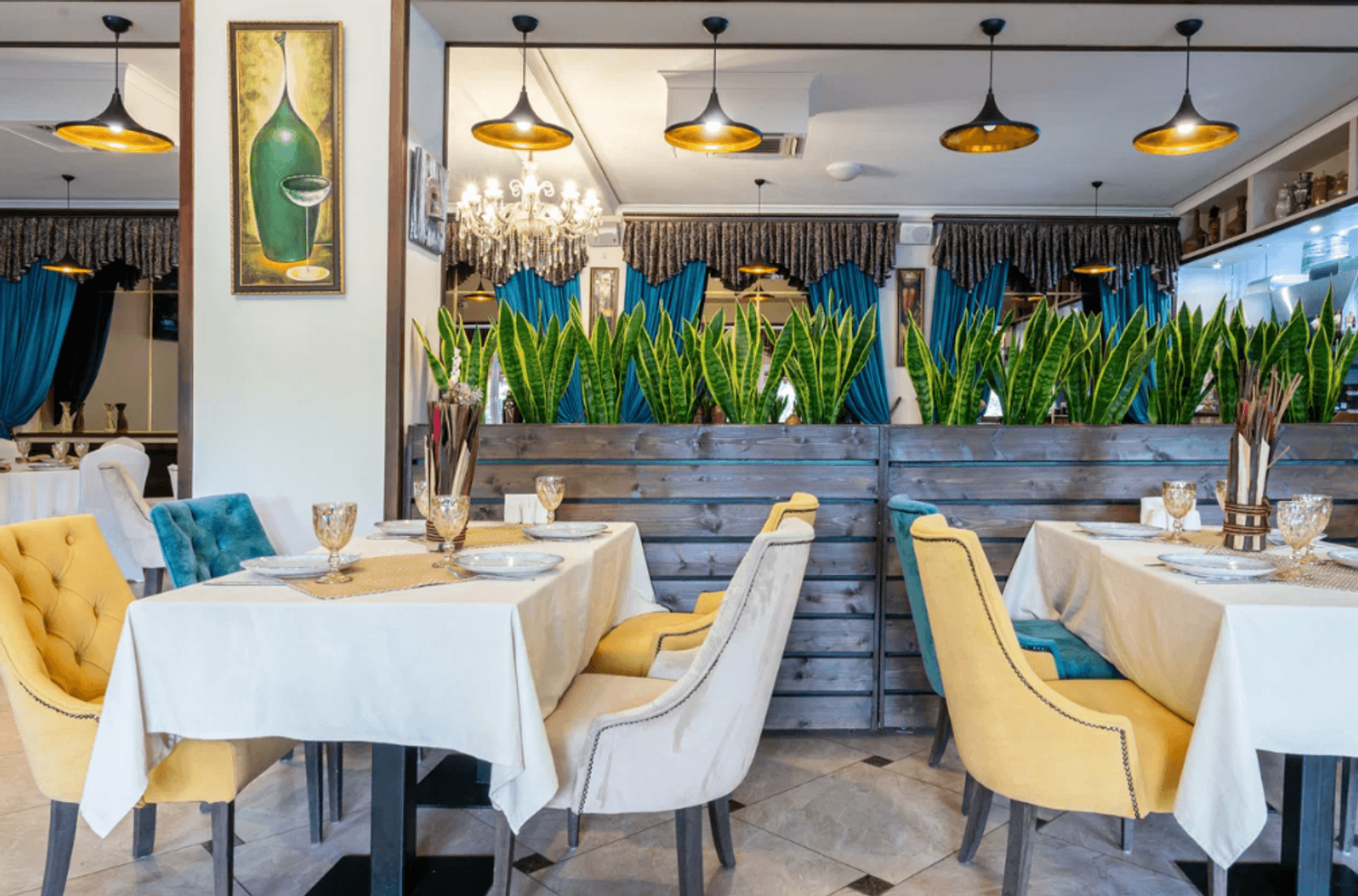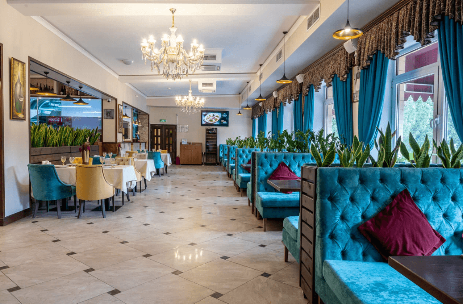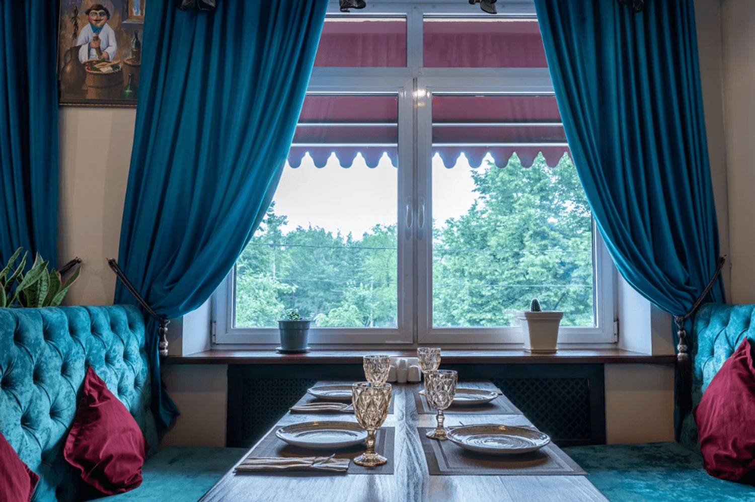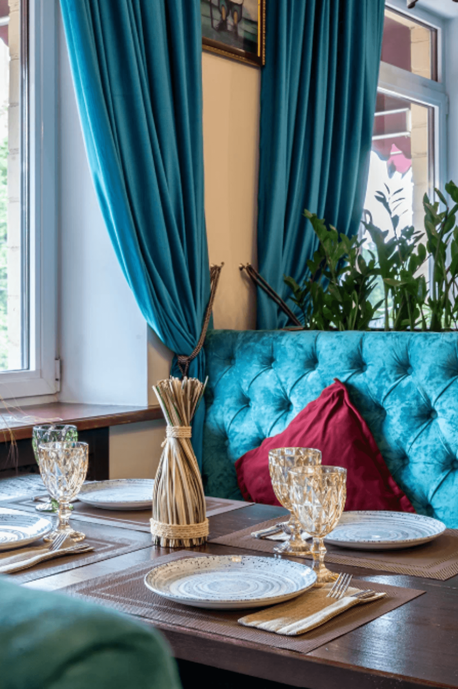 Атмосфера. Пространство с грузинским ярким текстилем, деревянной отделкой и декоративными элементами национальной керамики разделено на несколько зон: есть основной зал, банкетные помещения и караоке-комнаты. Интерьер передает национальный колорит, при этом сохраняя возможность для дополнительного декорирования и самых разных форматов мероприятий: от камерных ужинов до масштабных застолий.