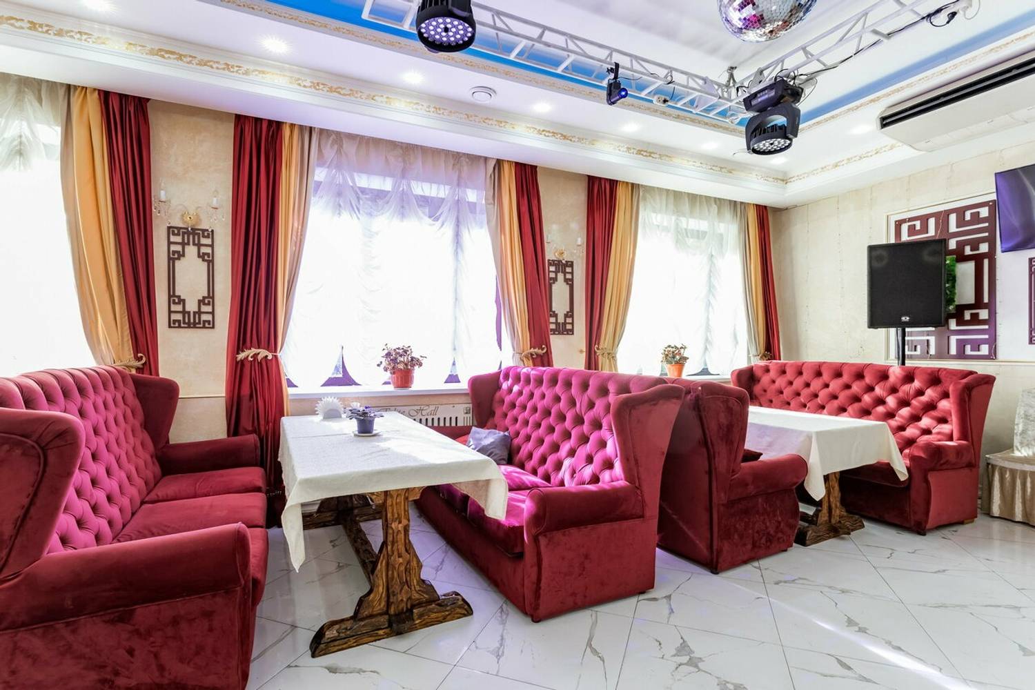 Атмосфера. Стиль динамичный: искусственная трава на стенах, ярко-розовые диваны, а хрустальные люстры и диско-шар создают ощущение постоянного праздника. Есть профессиональное световое оборудование для проведения праздников.