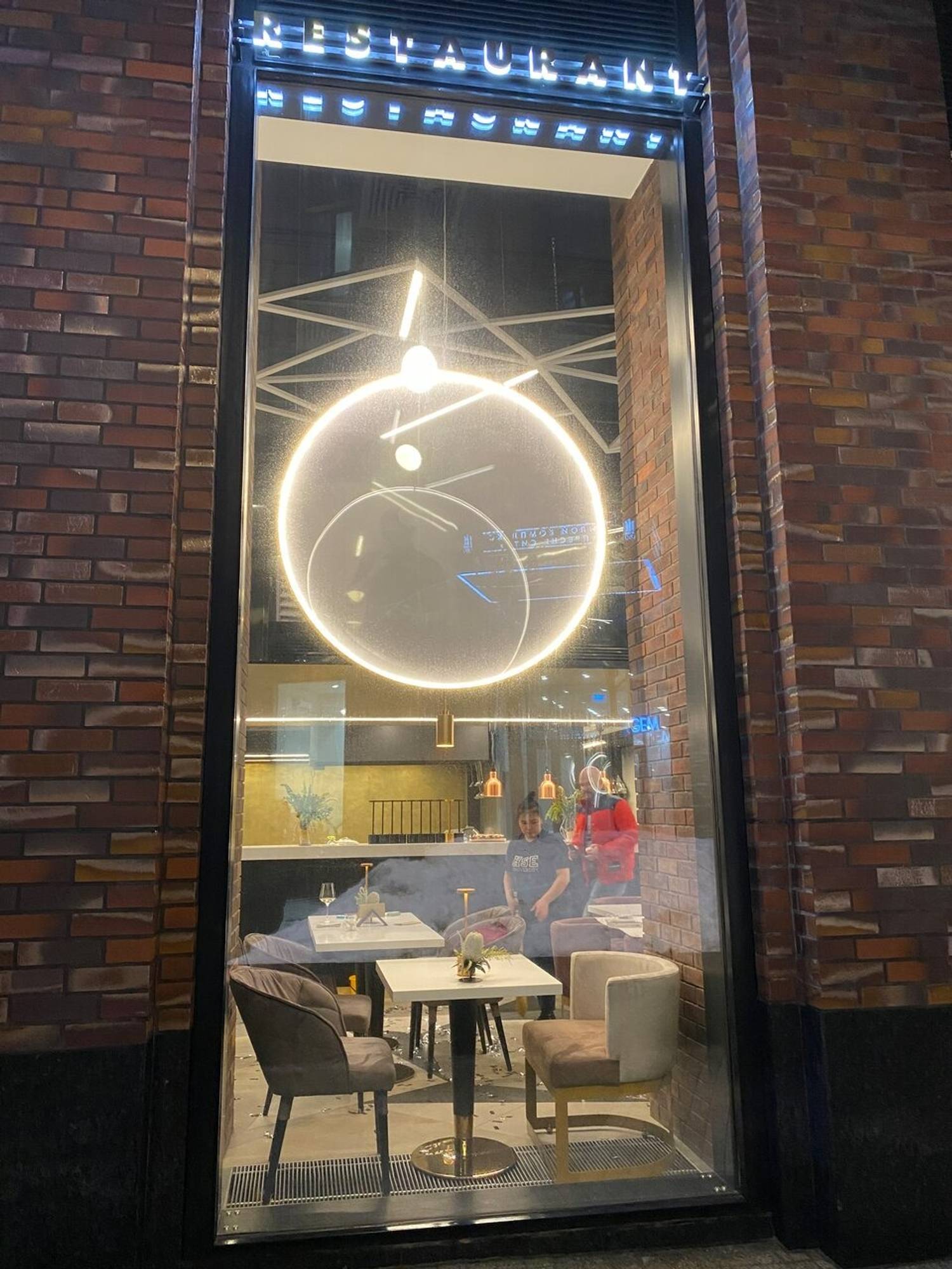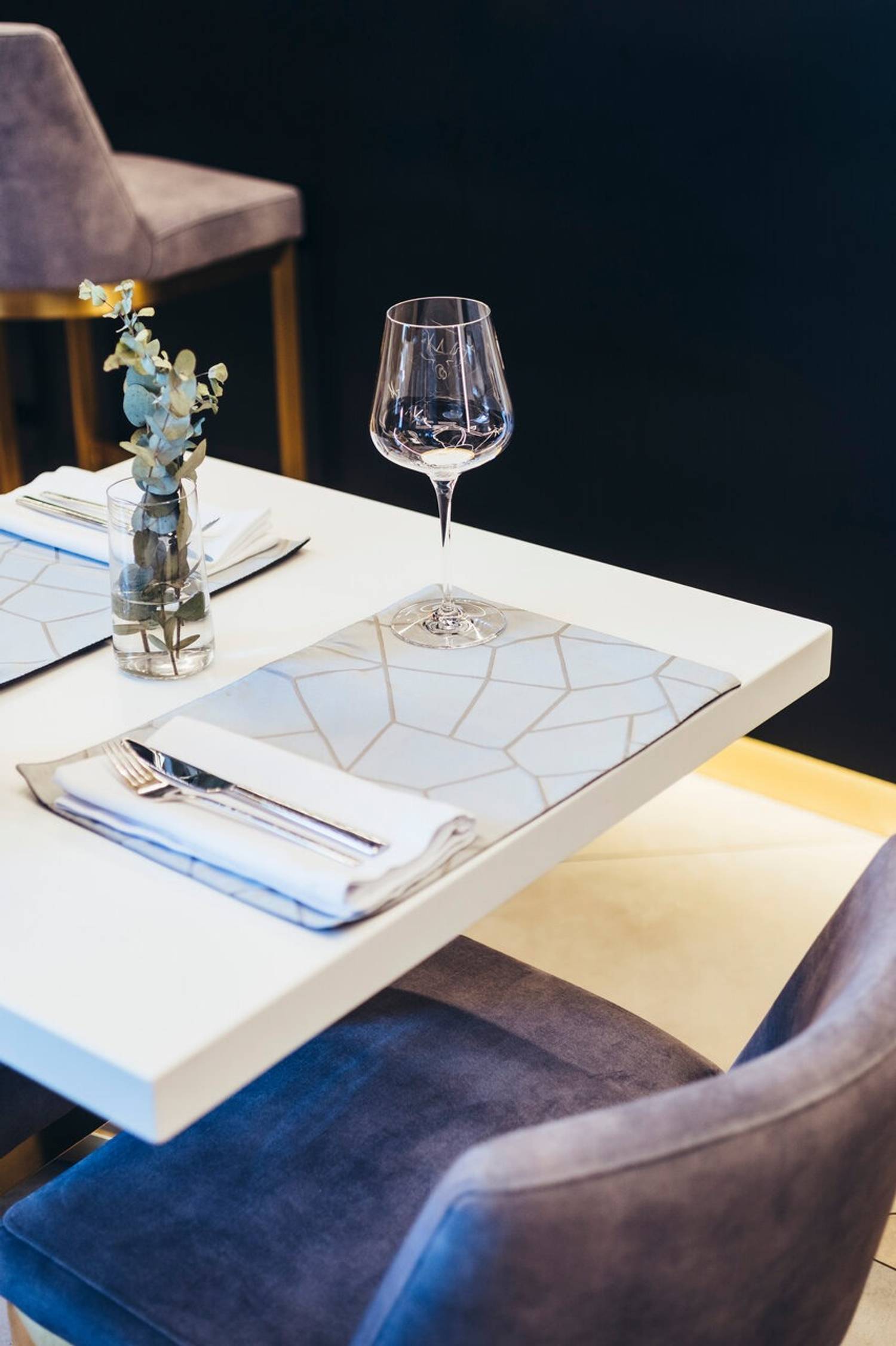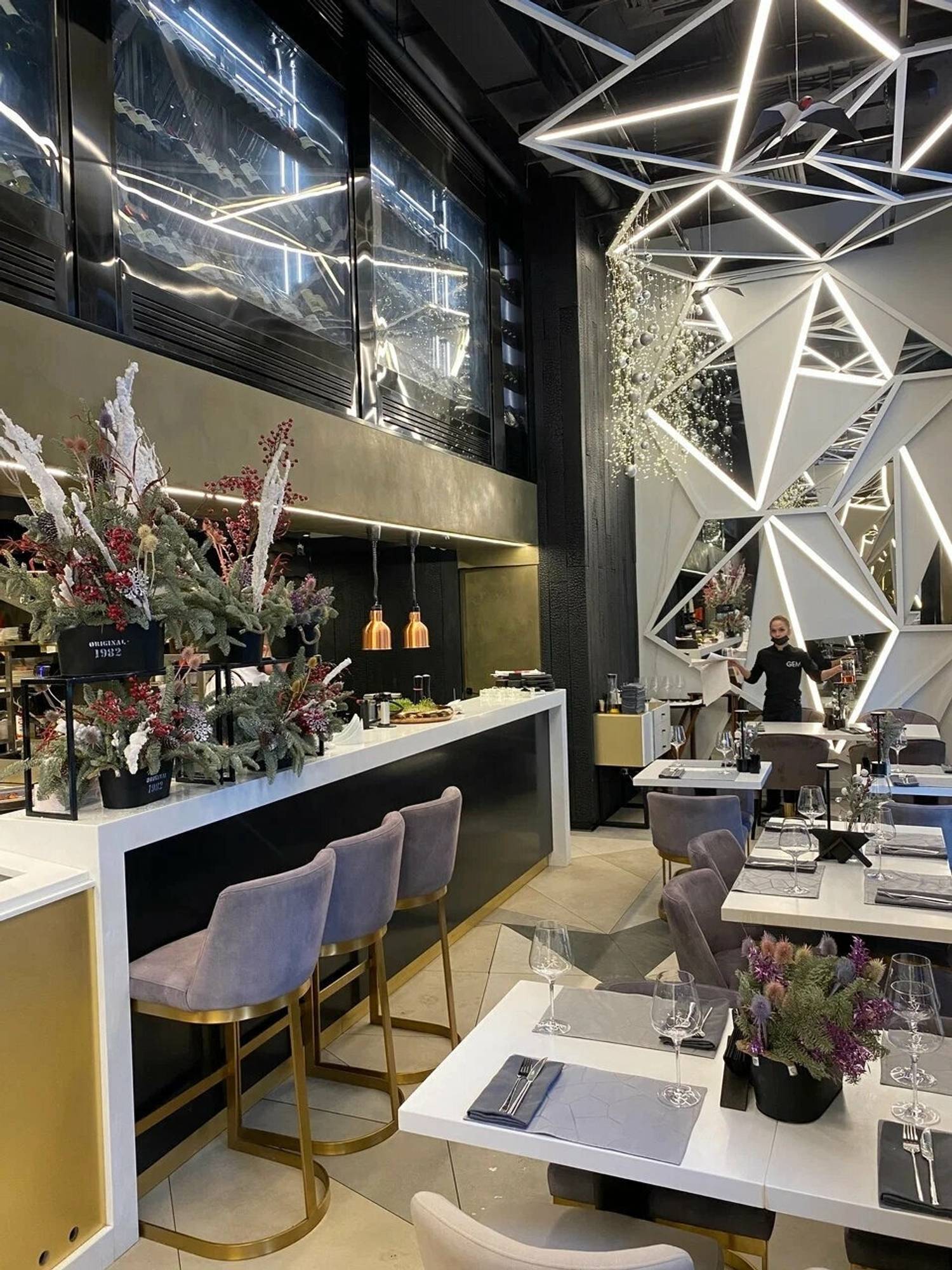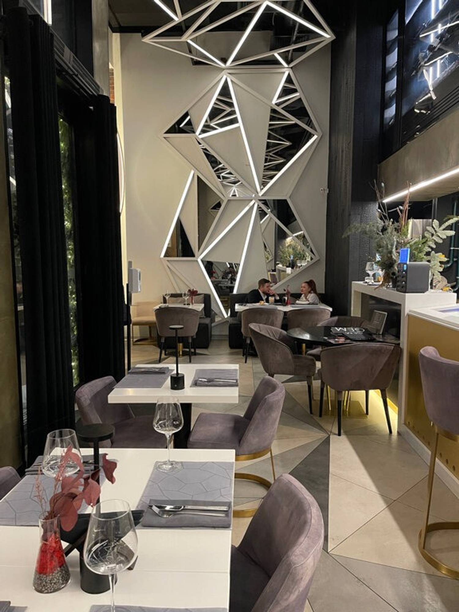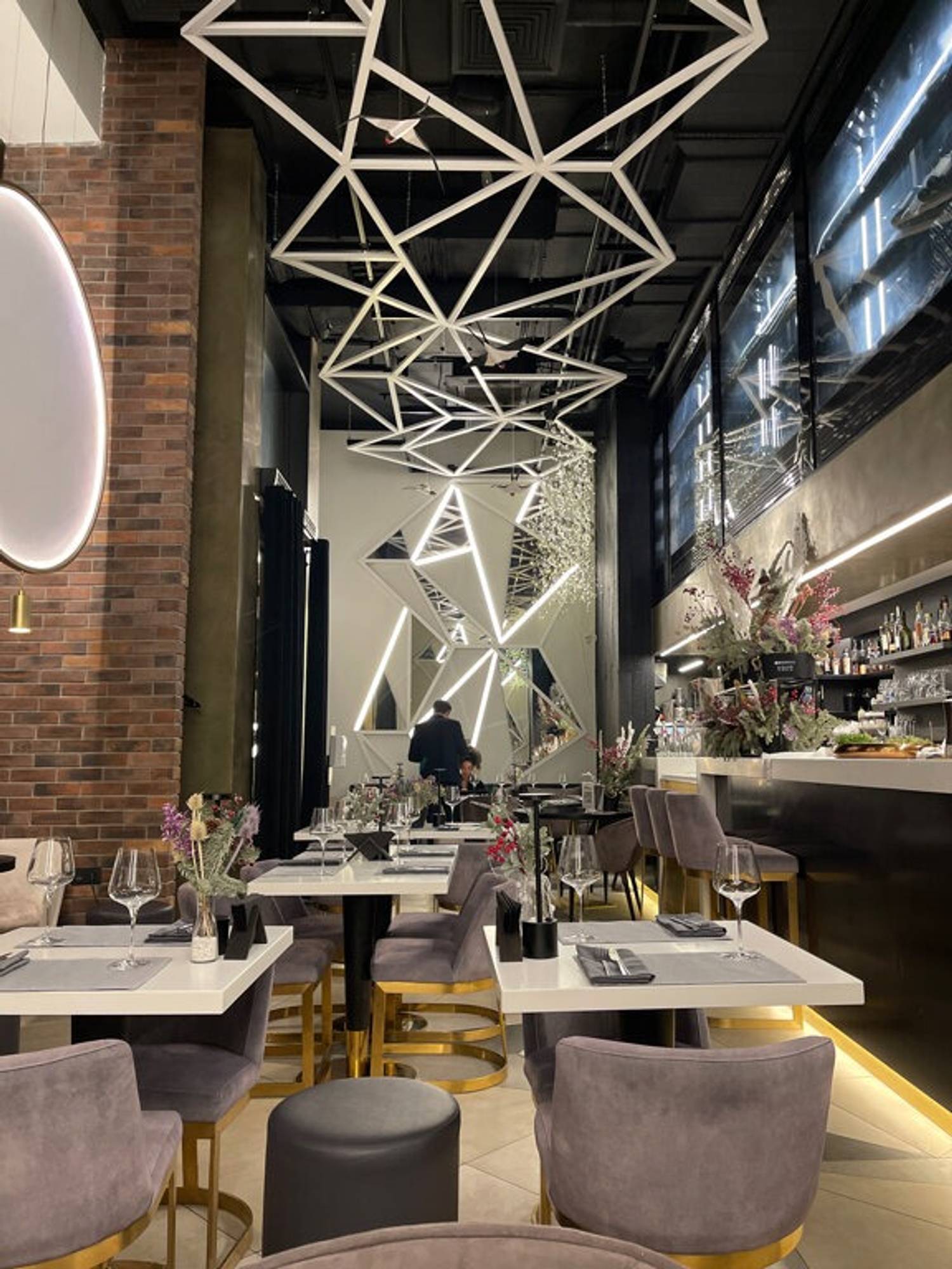 Атмосфера. Здесь открытая кухня и один из самых длинных винных шкафов Москвы. Главная фишка — декоративное украшение стены в виде треугольников с белой подсветкой. Рядом есть парковка, которая работает по предварительному бронированию.