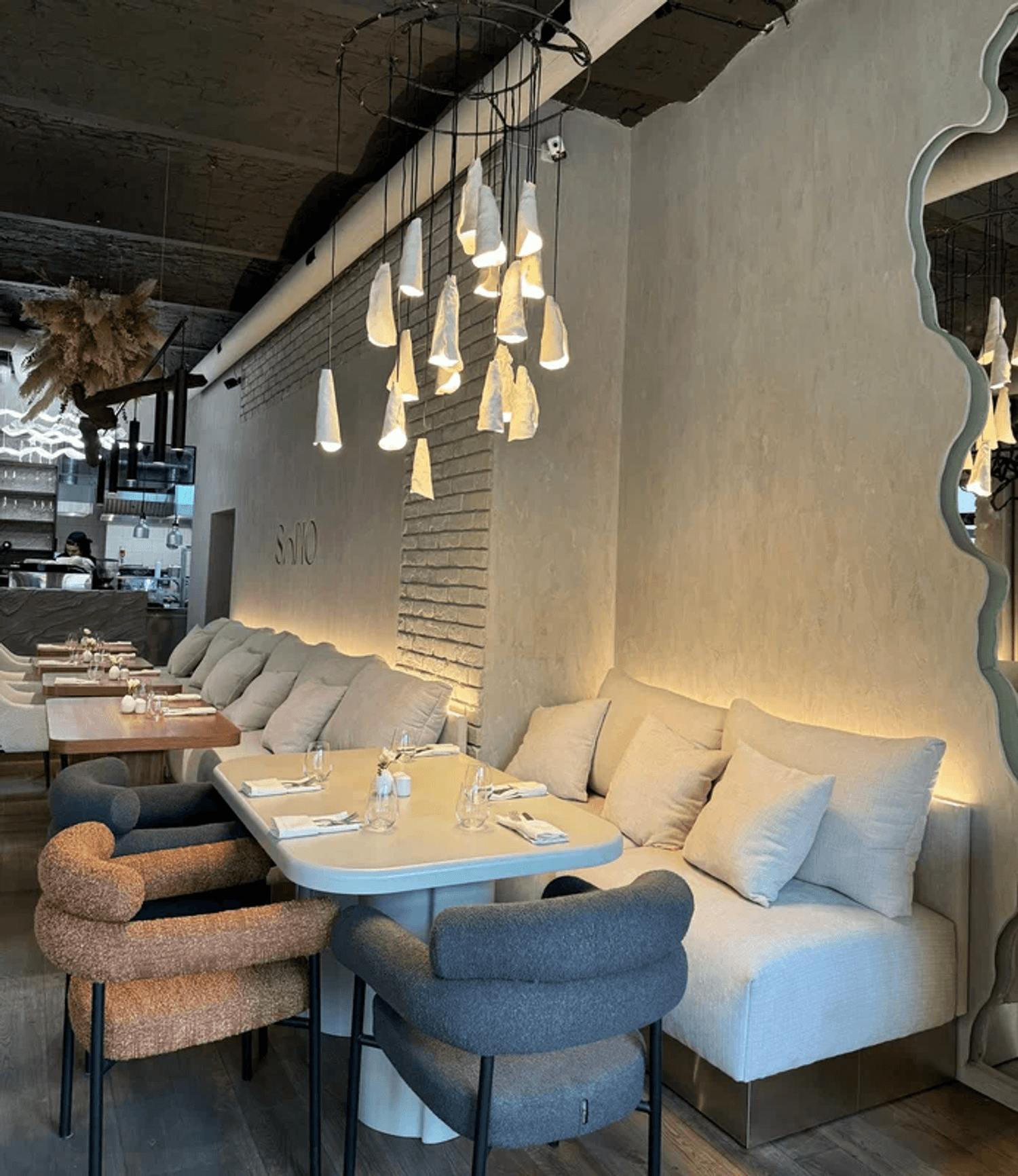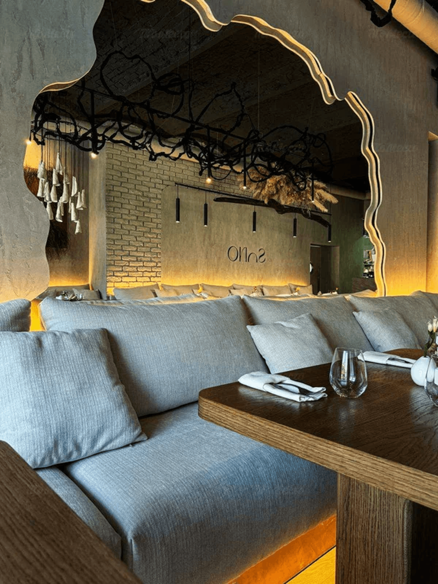 Атмосфера. Интерьер в светлых, умиротворяющих тонах наполнен тщательно подобранными деталями: фантазийные люстры, композиции из сухоцветов и крупные зеркала в фигурных рамах. Теплый точечный свет и продуманное пространство располагают к размеренному общению и отдыху.