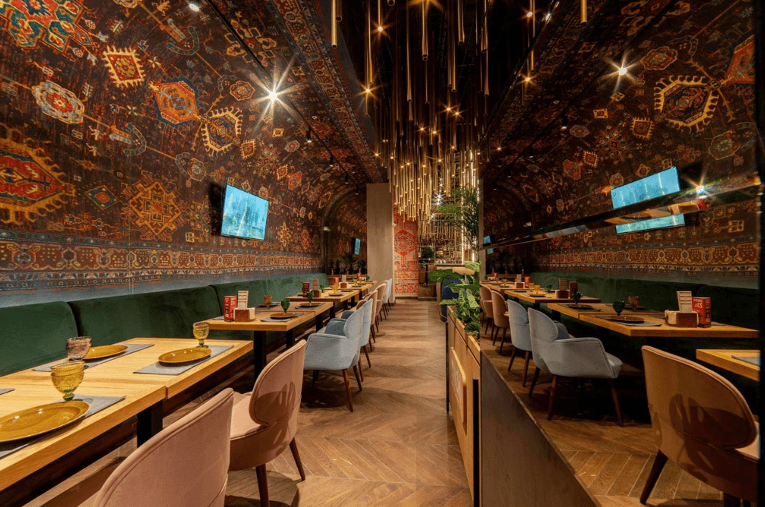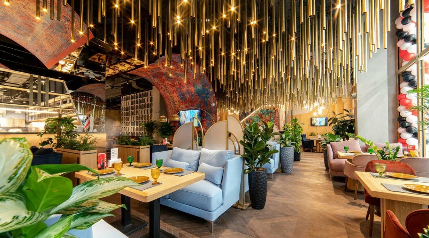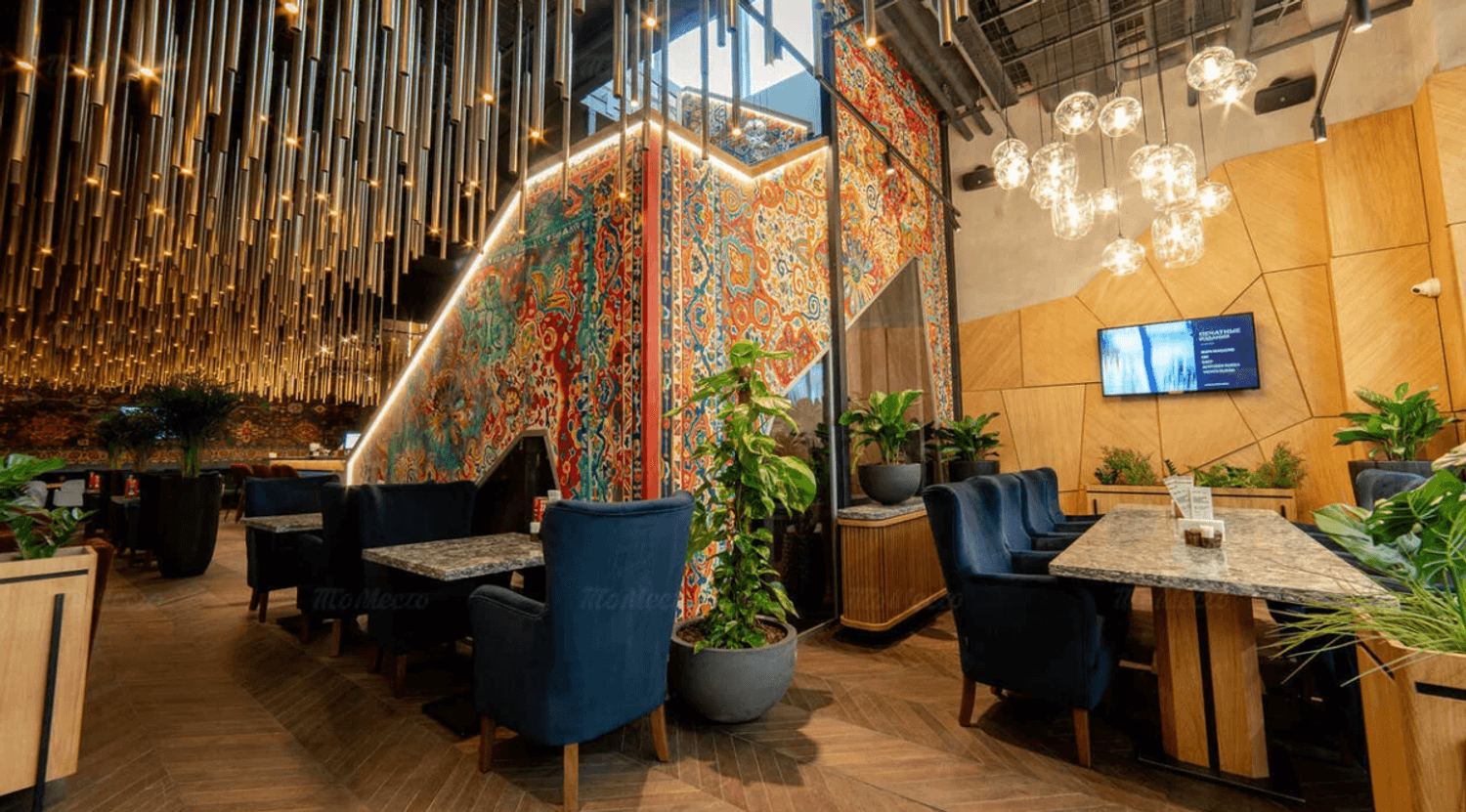 Атмосфера. Интерьер погружает в колорит Востока. Ковровые стены, низкие диваны с узорчатыми подушками, медные акценты и приглушенный свет создают ощущение традиционной чайханы.