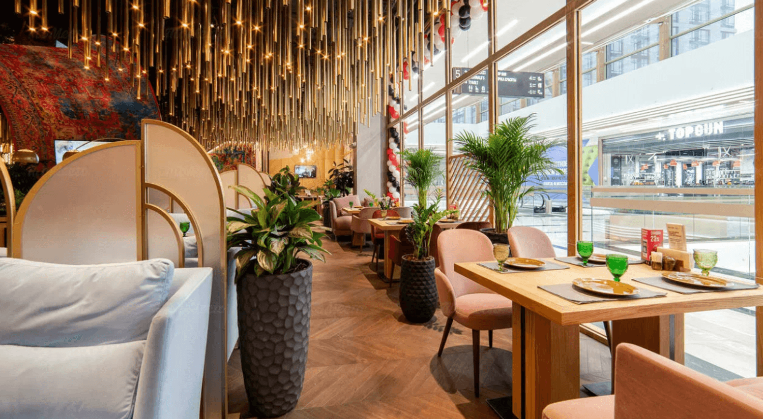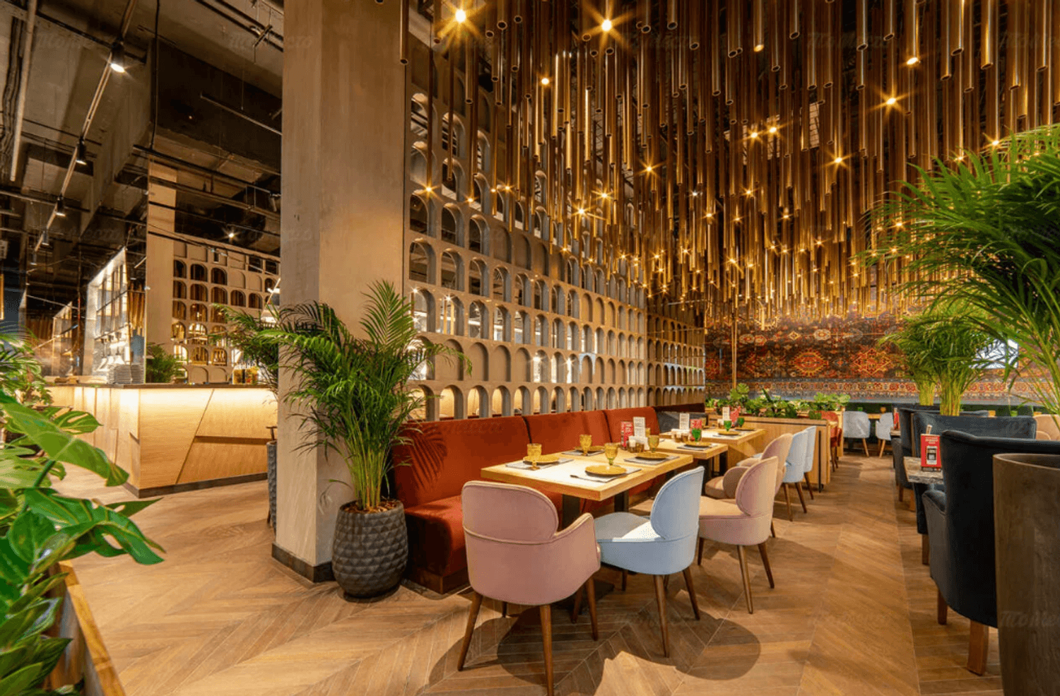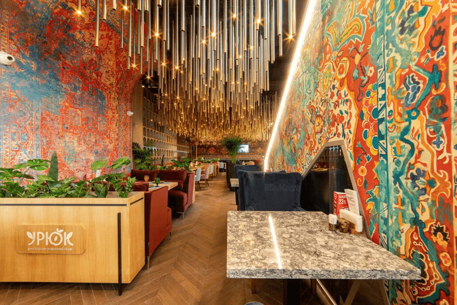 Атмосфера. Интерьер погружает в колорит Востока. Ковровые стены, низкие диваны с узорчатыми подушками, медные акценты и приглушенный свет создают ощущение традиционной чайханы.