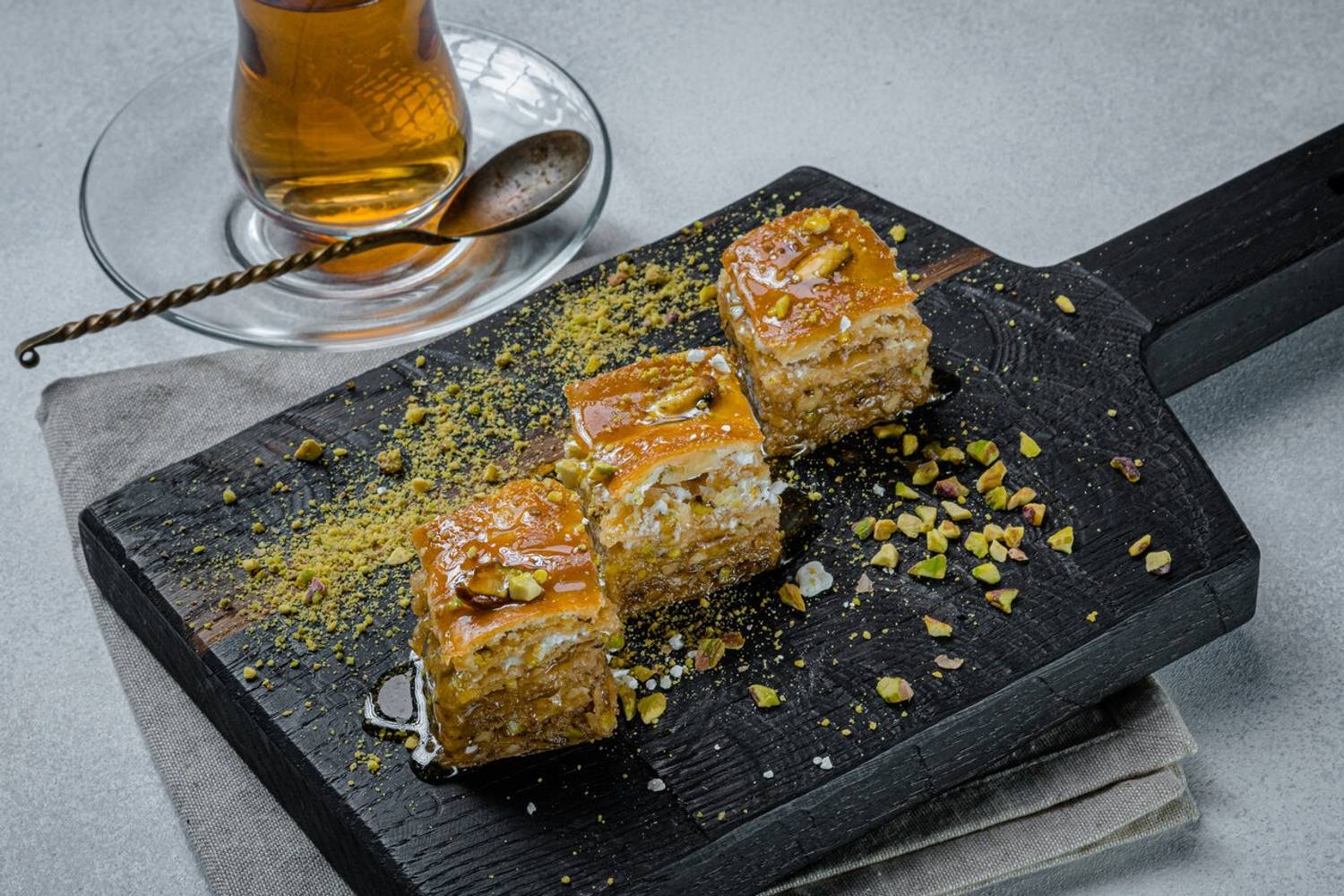 Еда и напитки. В меню — бараньи тибончики, каре ягненка, плов от шефа и долма с аджикой. А на десерт подают фисташковый рулет, дубайский чизкейк и пахлава.