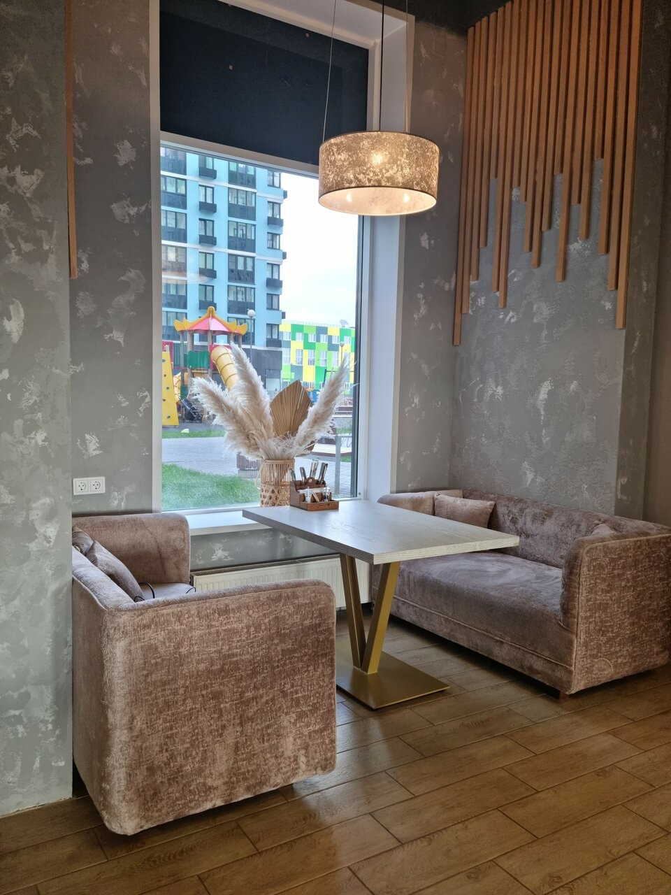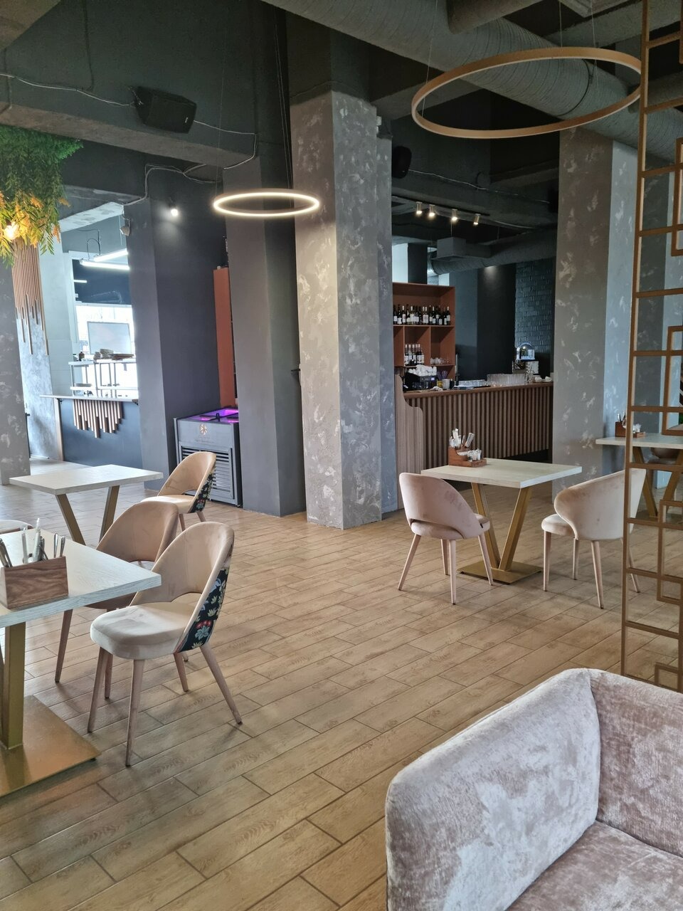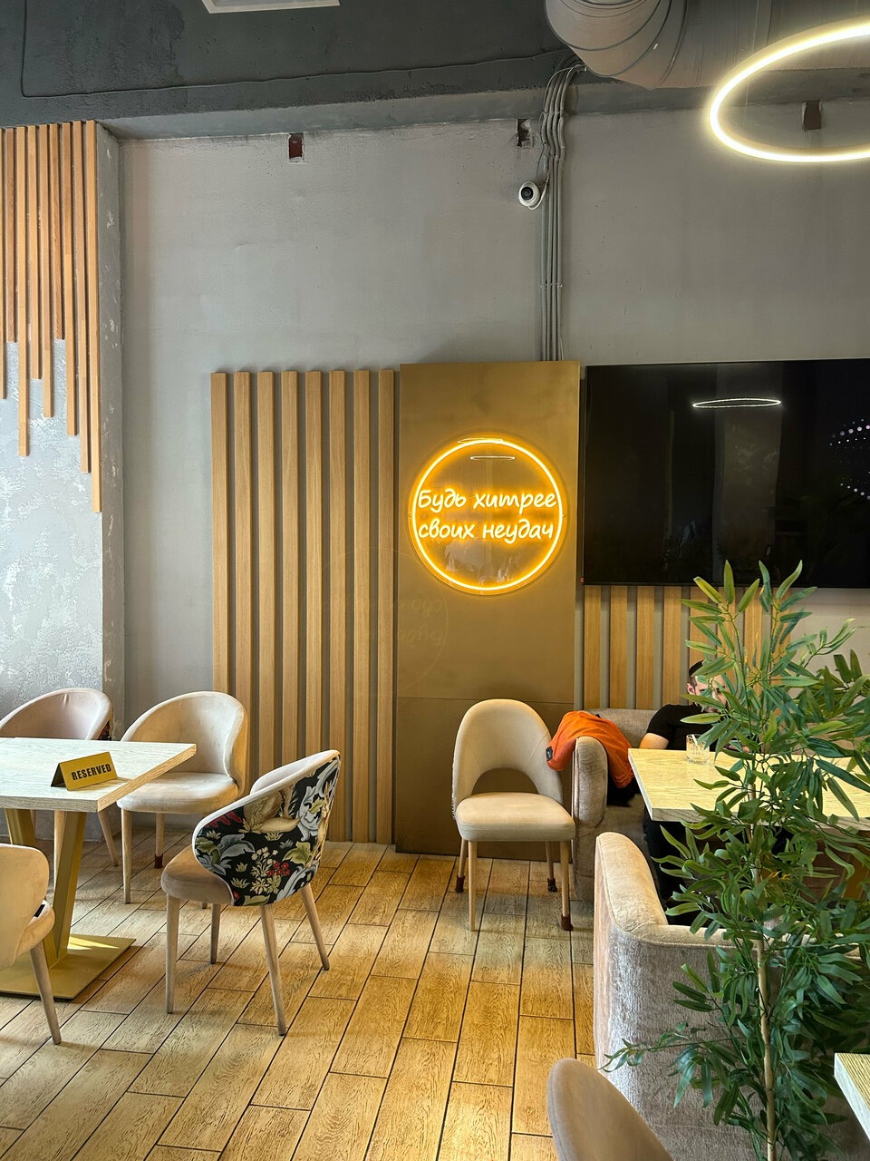 Атмосфера. Кафе в светлых тонах с акцентами рыжего. Серые колонны и люстры в форме нимбов добавляют интерьеру лаконичности. Улыбку вызывает неоновая надпись «будь хитрее своих неудач» в круглом обрамлении, которая отсылает к названию. Для детей есть игровая зона с домиком и лестницей.