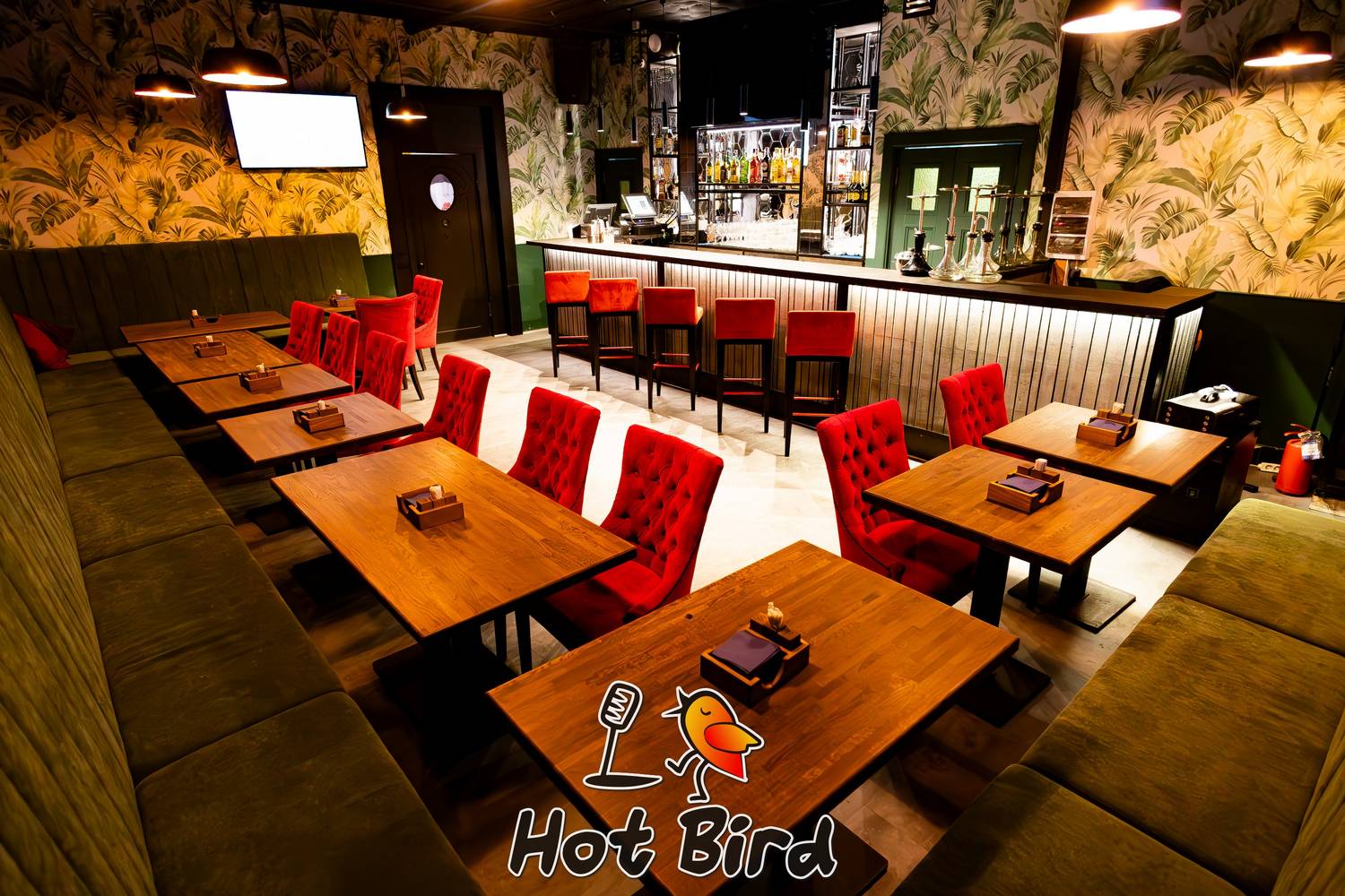 Атмосфера. Здесь сочетается индустриальный шарм кирпичных стен с элегантными обоями, мягким освещением и яркой мебелью. Основной зал с барной стойкой и диванами соседствует с четырьмя вип-комнатами в индивидуальной цветовой гамме — от глубокого синего до теплого янтарного. В Hot Bird созданы условия как для публичных выступлений, так и для приватных мероприятий.