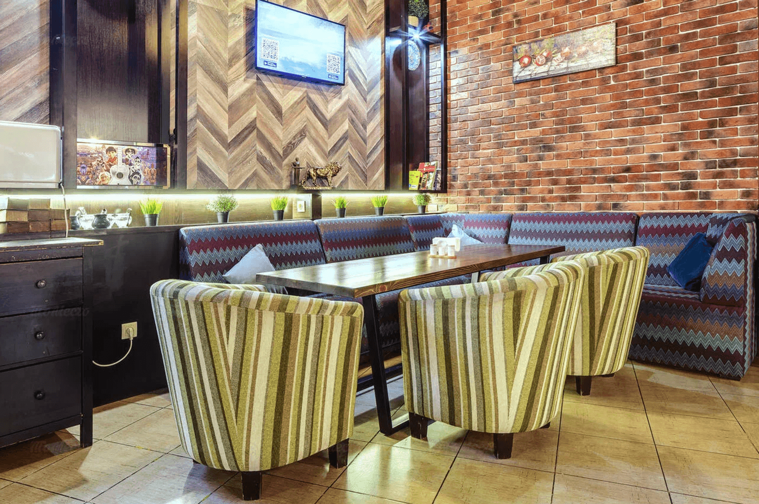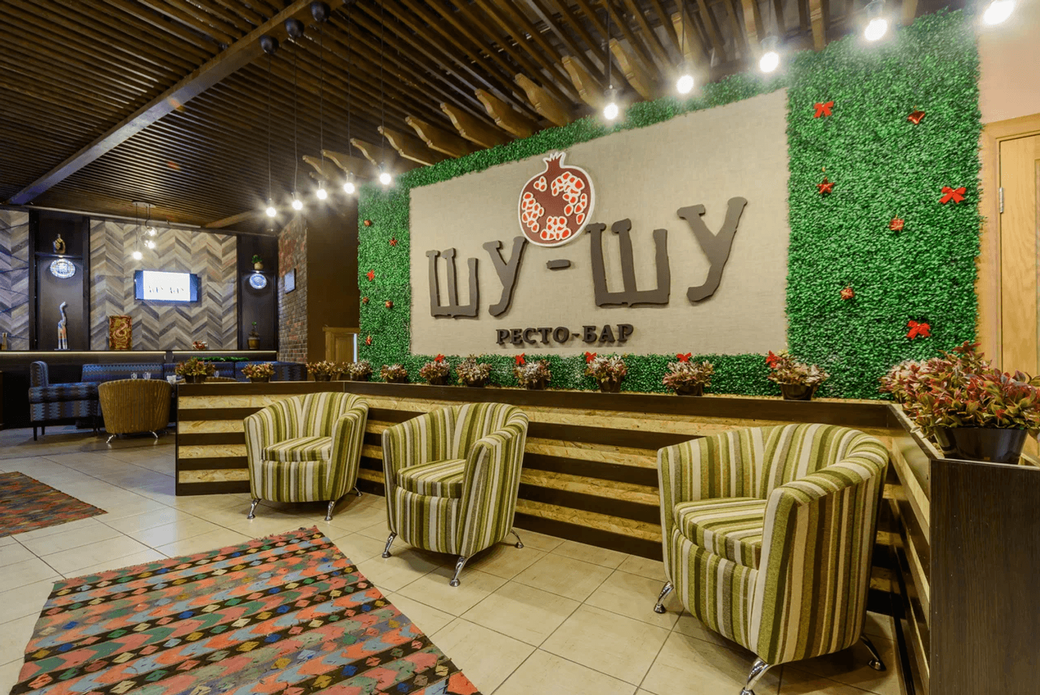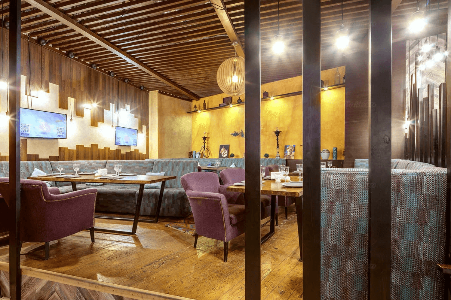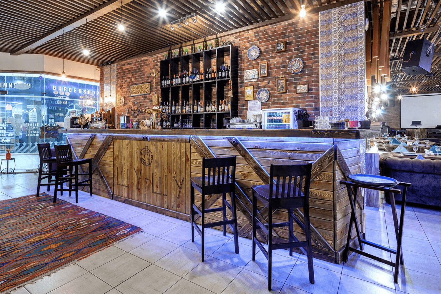 Атмосфера. Пространство сочетает европейский комфорт и восточный колорит: удобные диваны, пышная зелень, яркие ковры и расписные декоративные элементы. Барная стойка из массива дерева стилизована под старинный трактир.