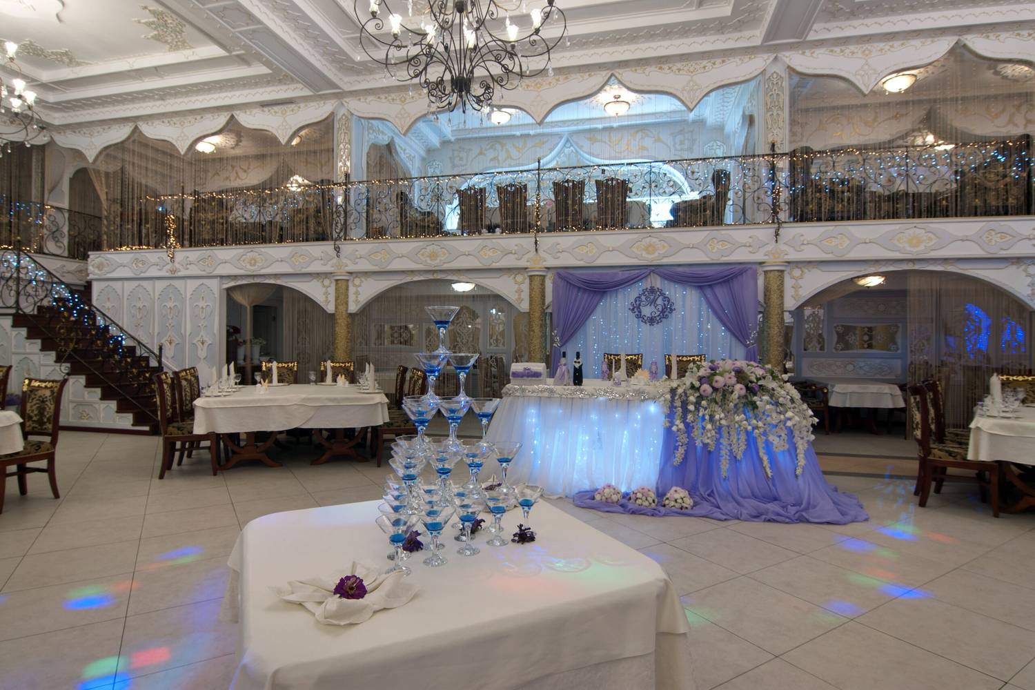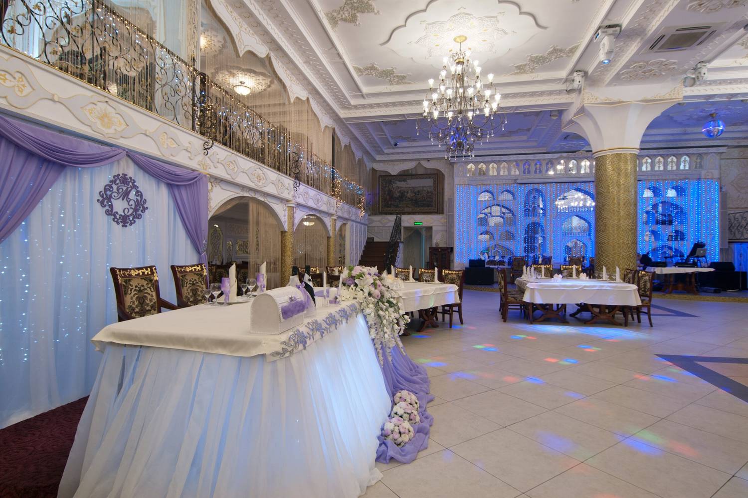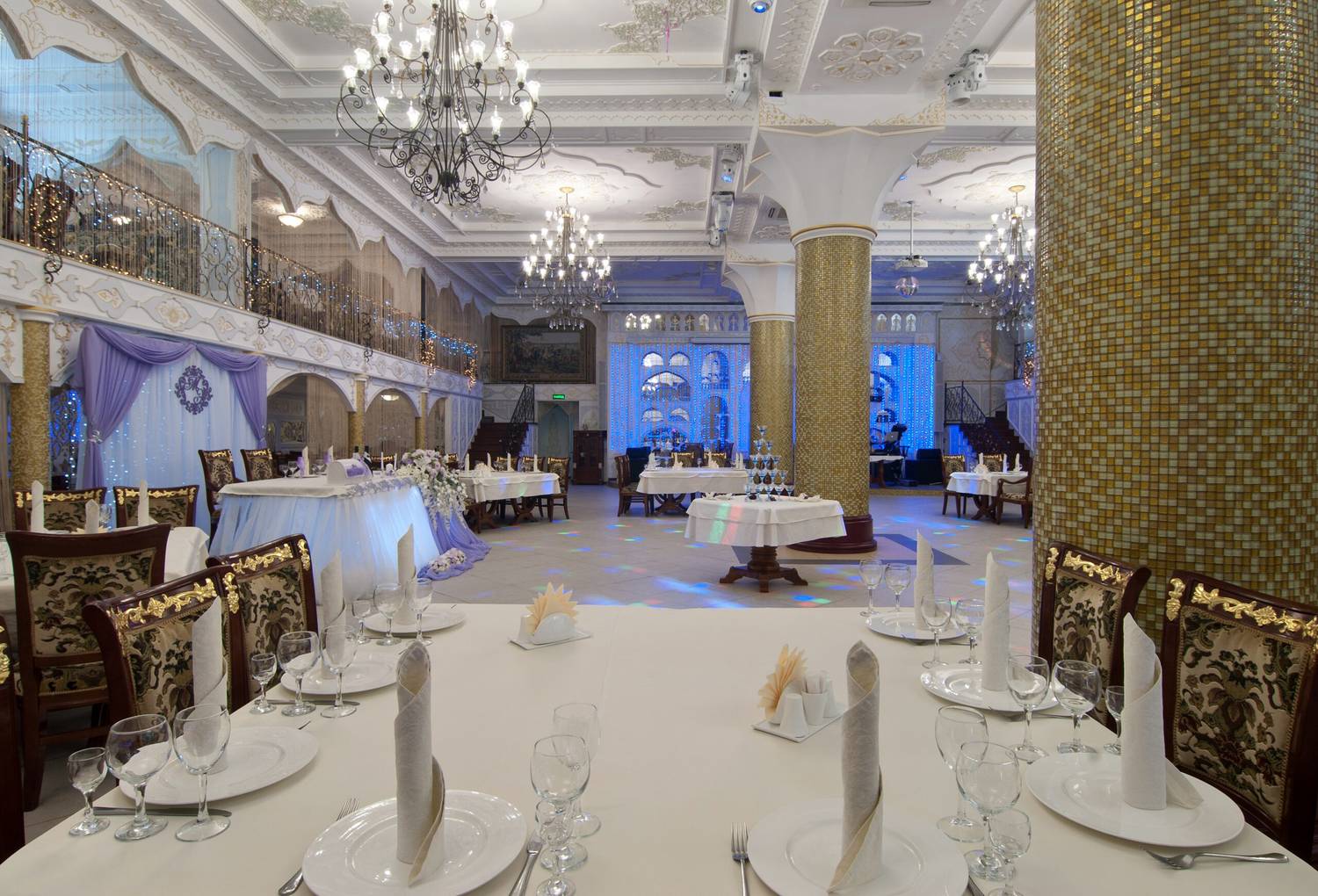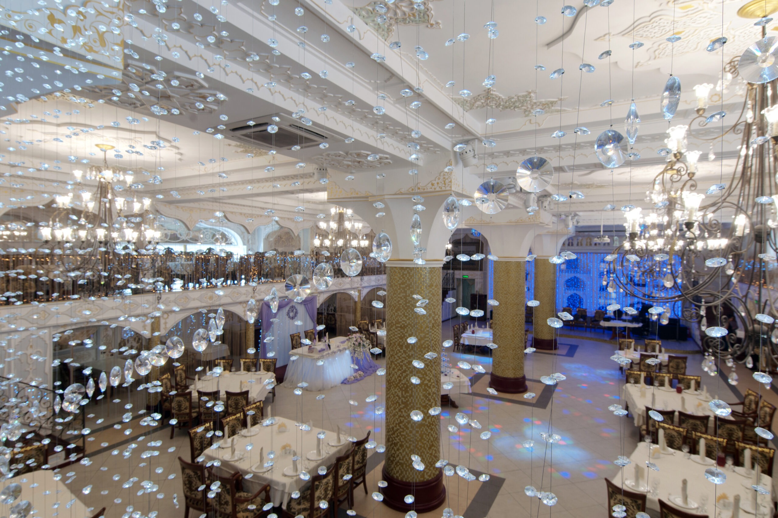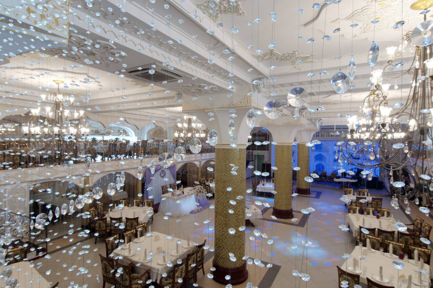 Атмосфера. Торжественный тон в интерьере задают витые колонны и роскошные хрустальные люстры. Здесь проводят праздники в основном зале с танцполом и сценой, а в камерных помещениях на втором этаже и балконах отдыхают компаниями поменьше.