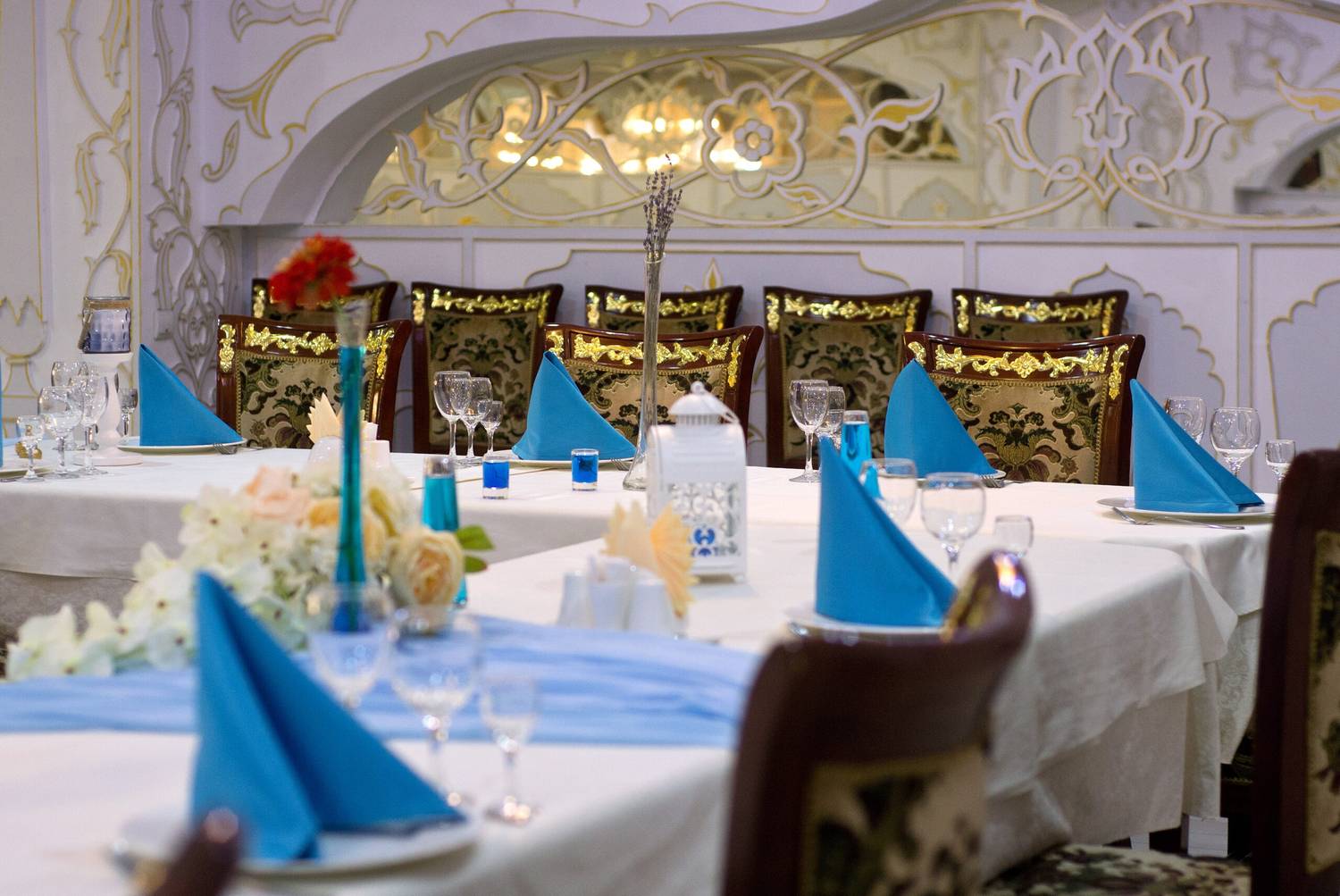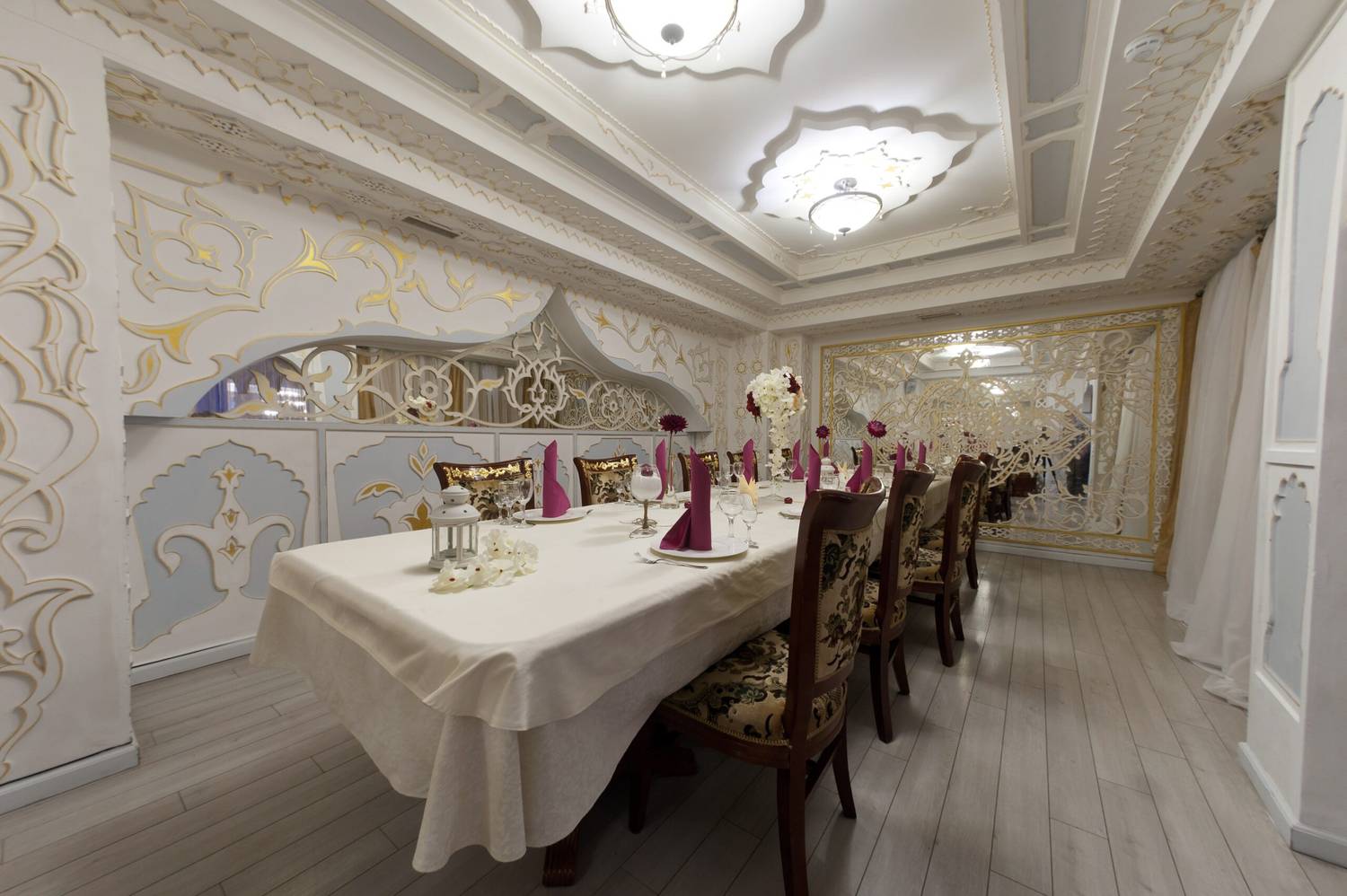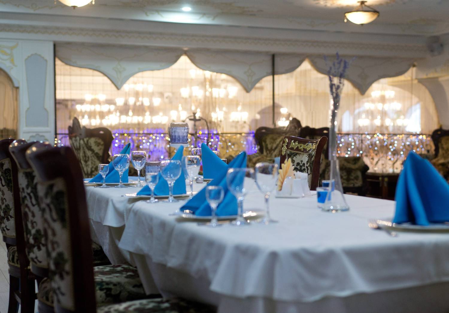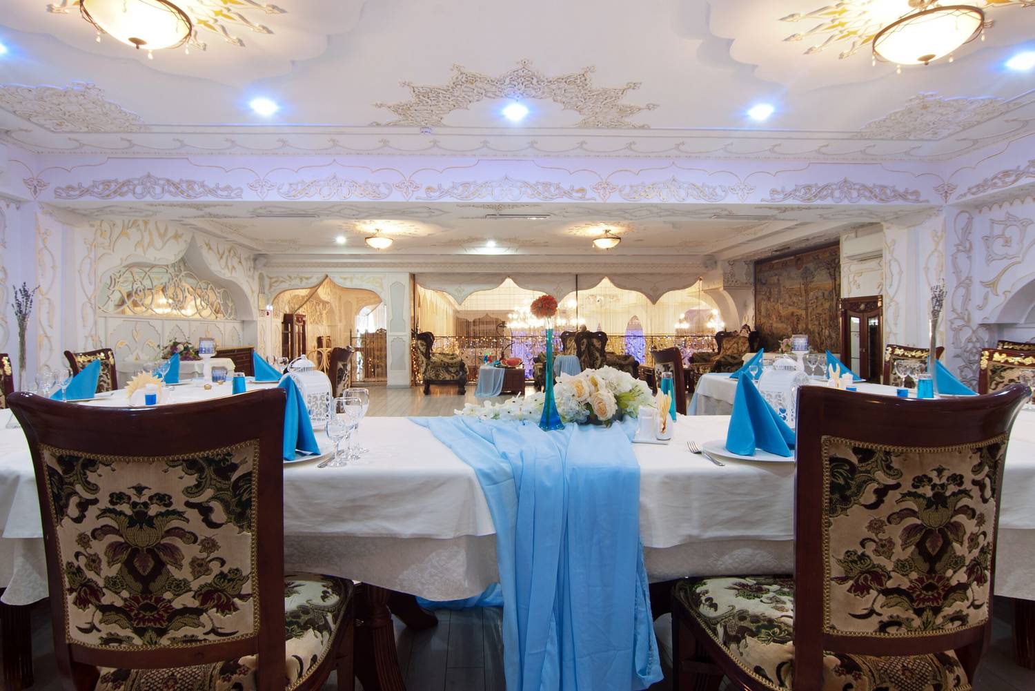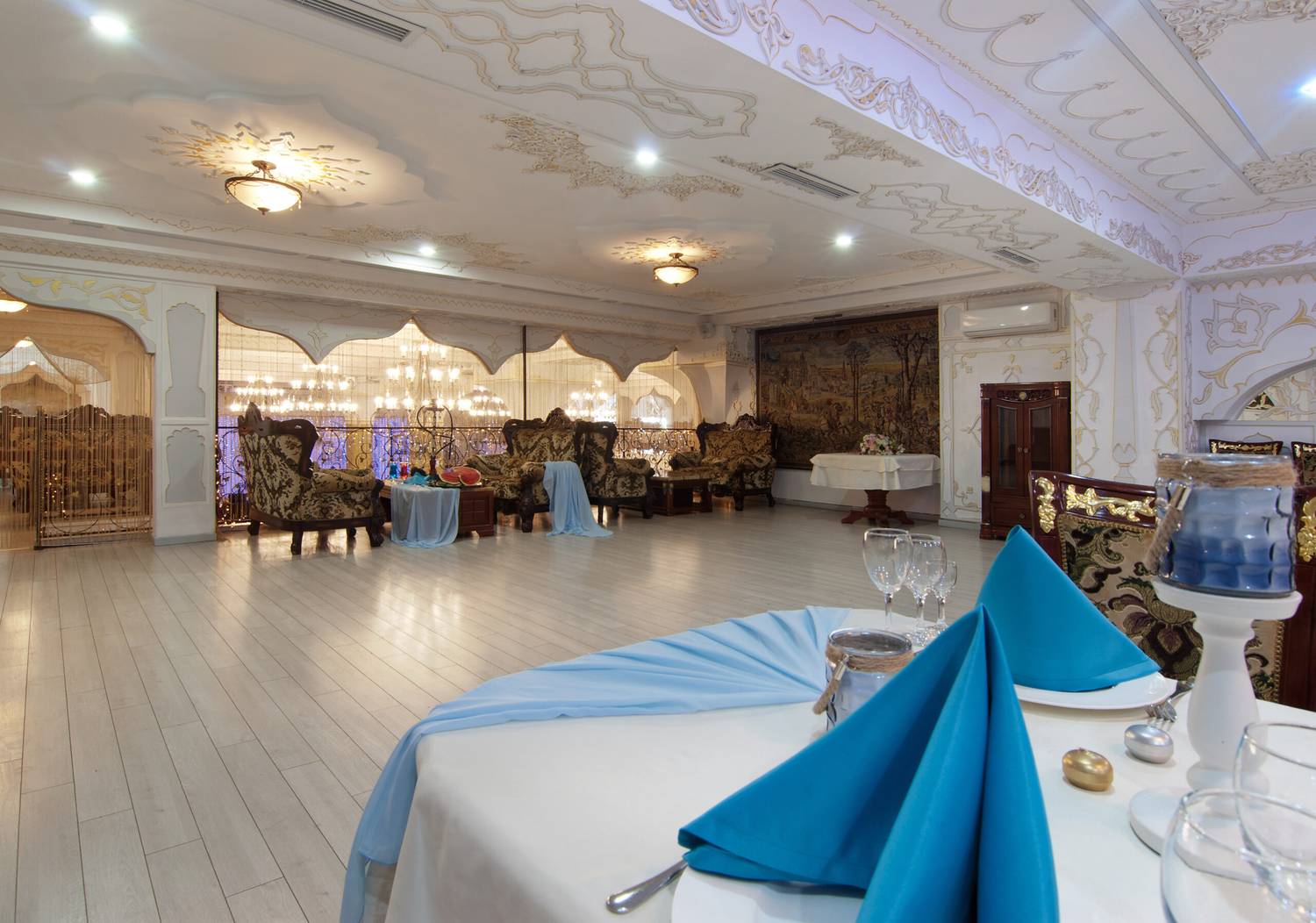 Атмосфера. Торжественный тон в интерьере задают витые колонны и роскошные хрустальные люстры. Здесь проводят праздники в основном зале с танцполом и сценой, а в камерных помещениях на втором этаже и балконах отдыхают компаниями поменьше.