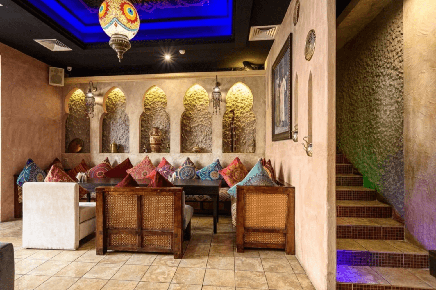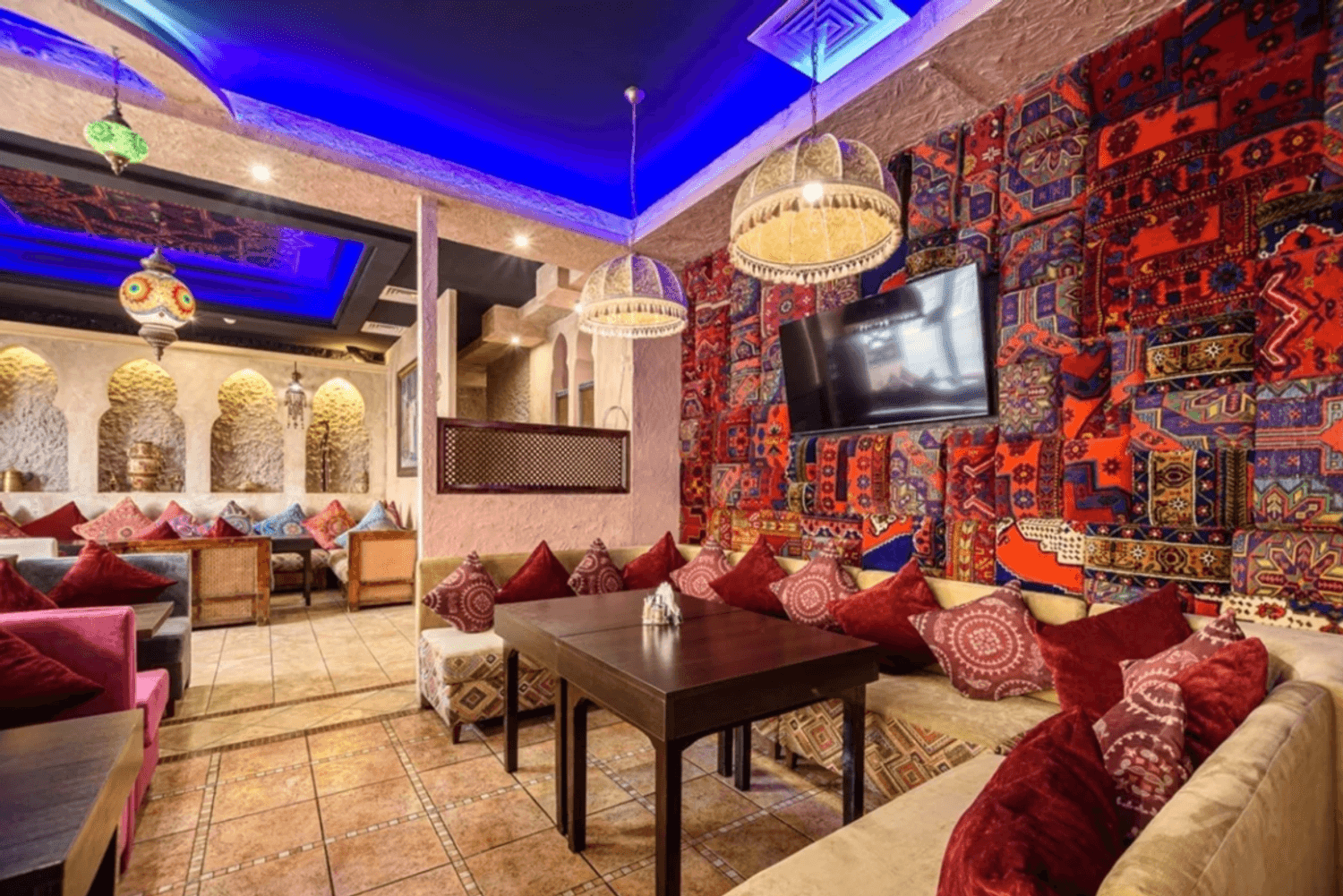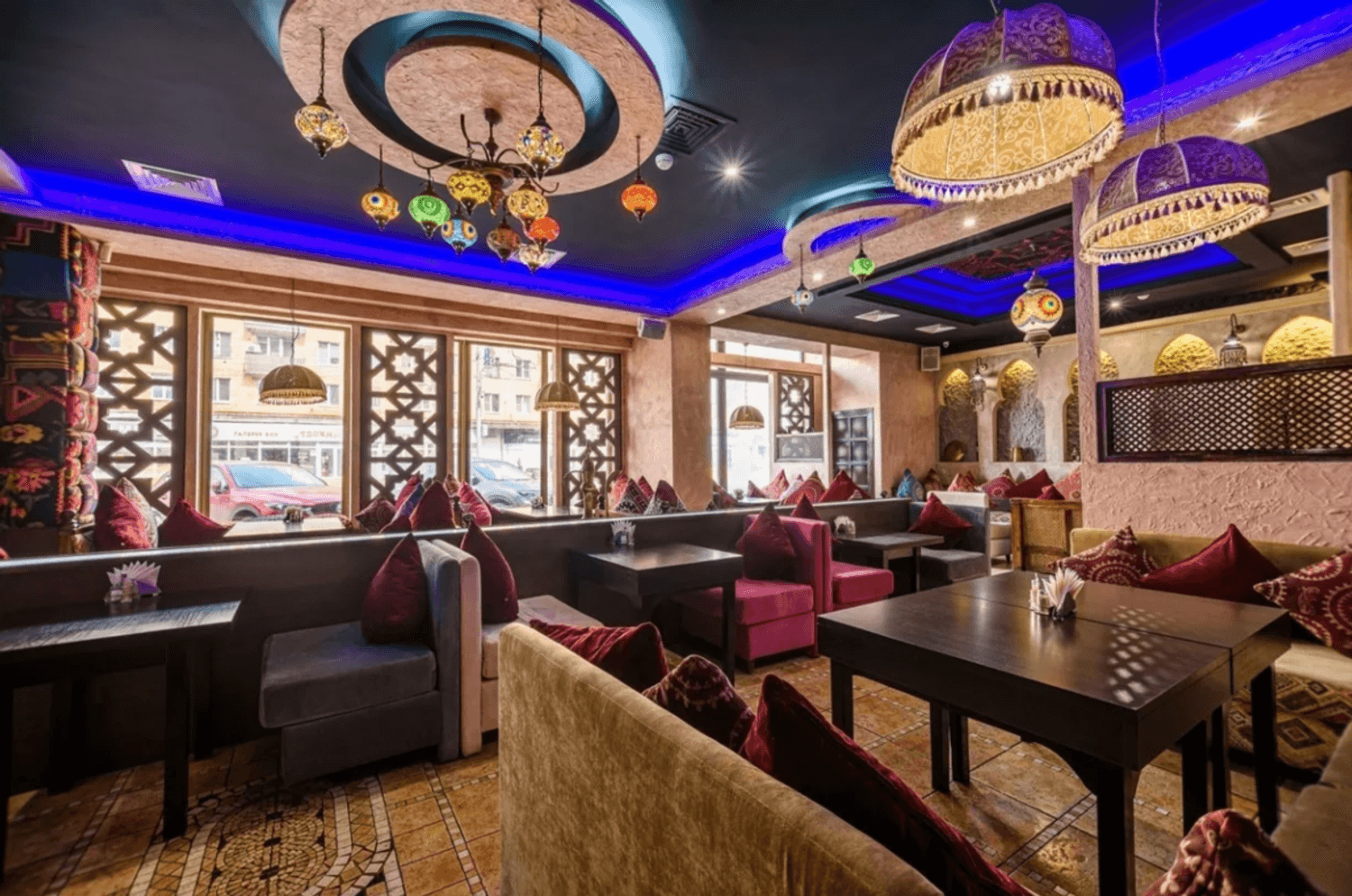 Атмосфера. Интерьер выполнен в арабском стиле: яркие декоративные элементы, живые растения, подсветка и уютные зоны для гостей. Есть вип-комната для приватных встреч и пространство для шоу-программ с танцами живота.