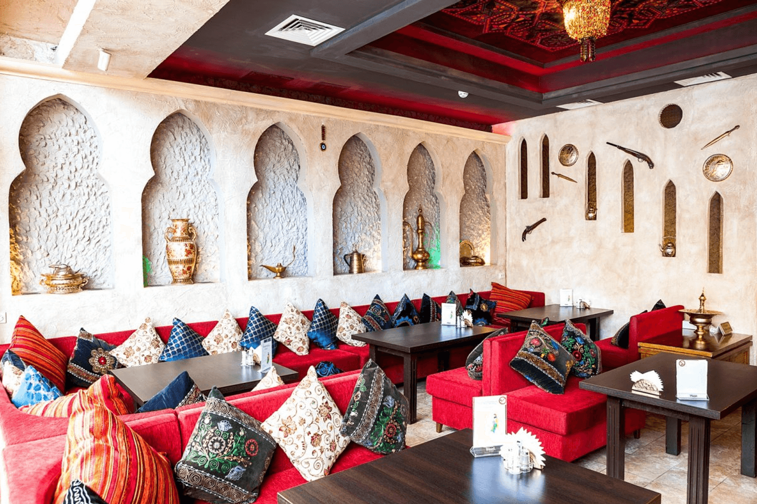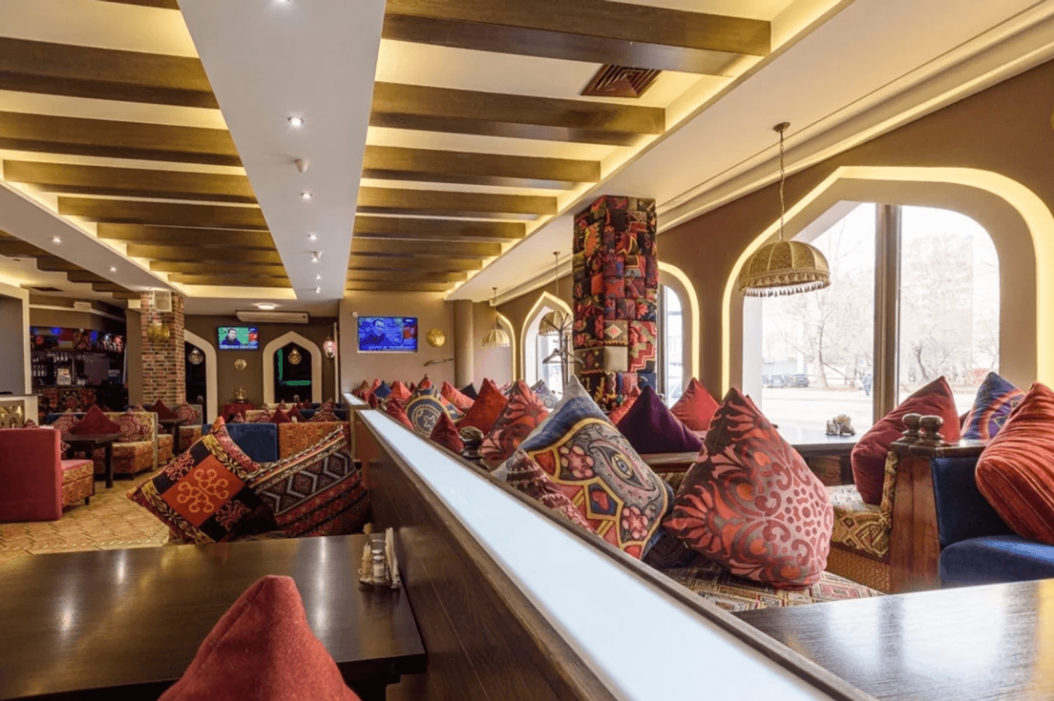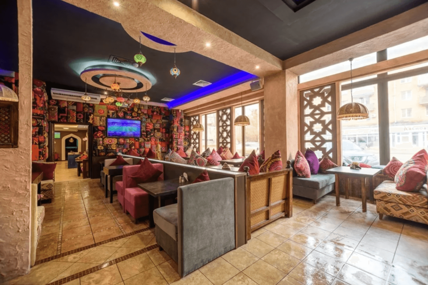 Атмосфера. Интерьер выполнен в арабском стиле: яркие декоративные элементы, живые растения, подсветка и уютные зоны для гостей. Есть вип-комната для приватных встреч и пространство для шоу-программ с танцами живота.