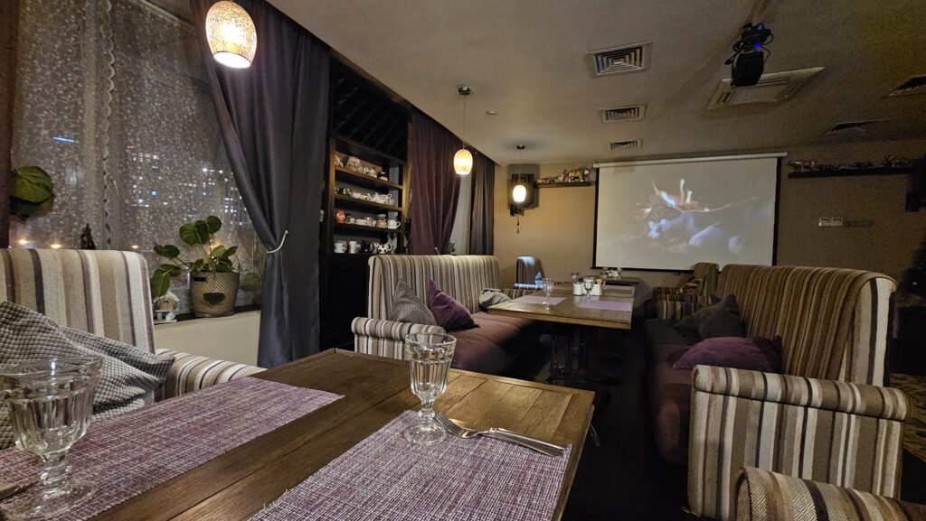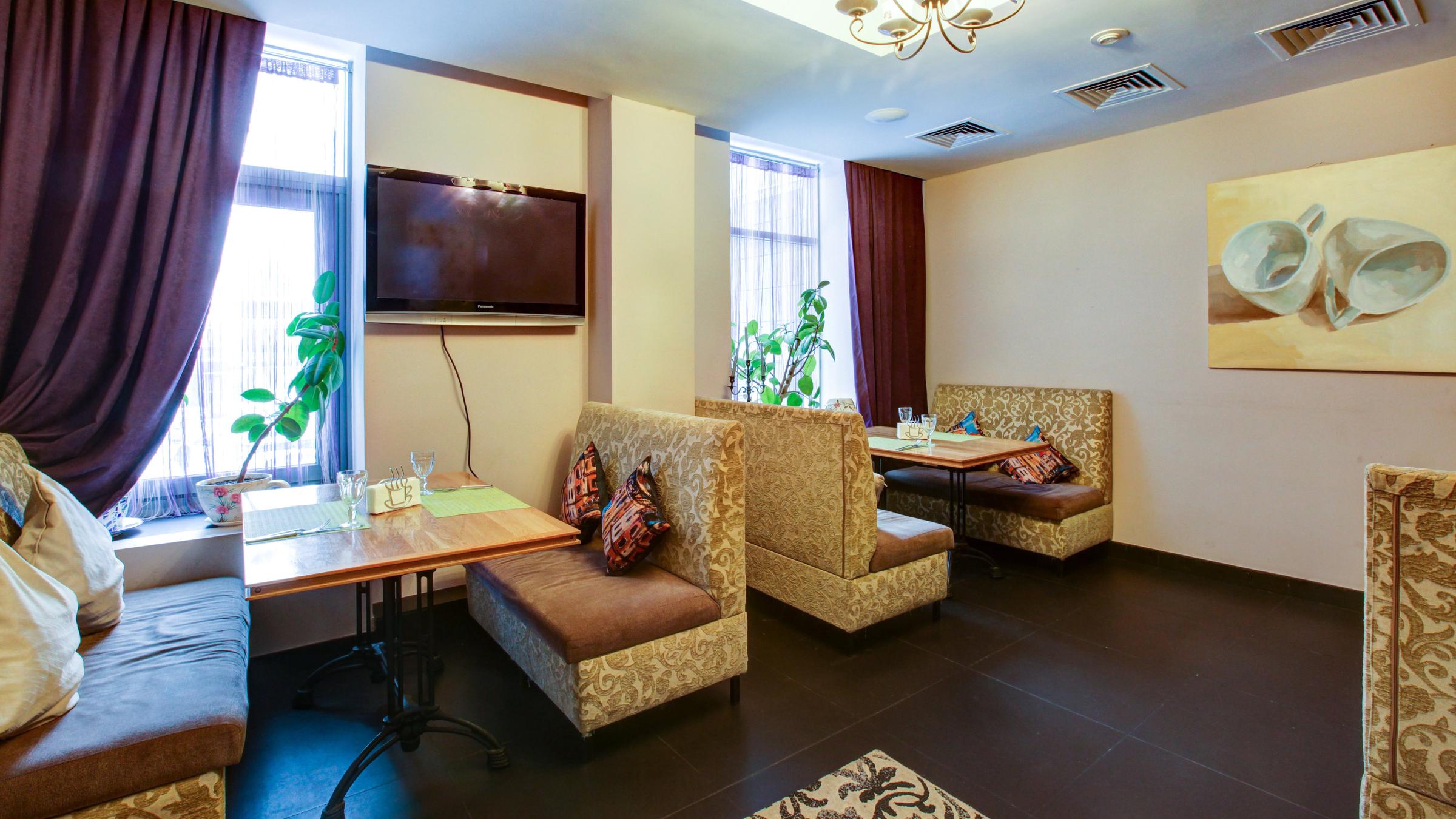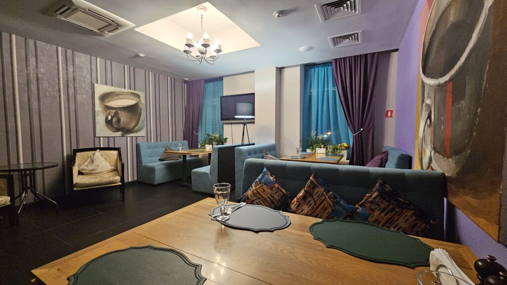 Атмосфера. Пространство с мягким освещением, деревянными столами и текстильным декором напоминает гостиную дружелюбного дома. Здесь царит спокойная обстановка, где можно уединиться за чашкой кофе или собраться компанией в банкетной зоне.