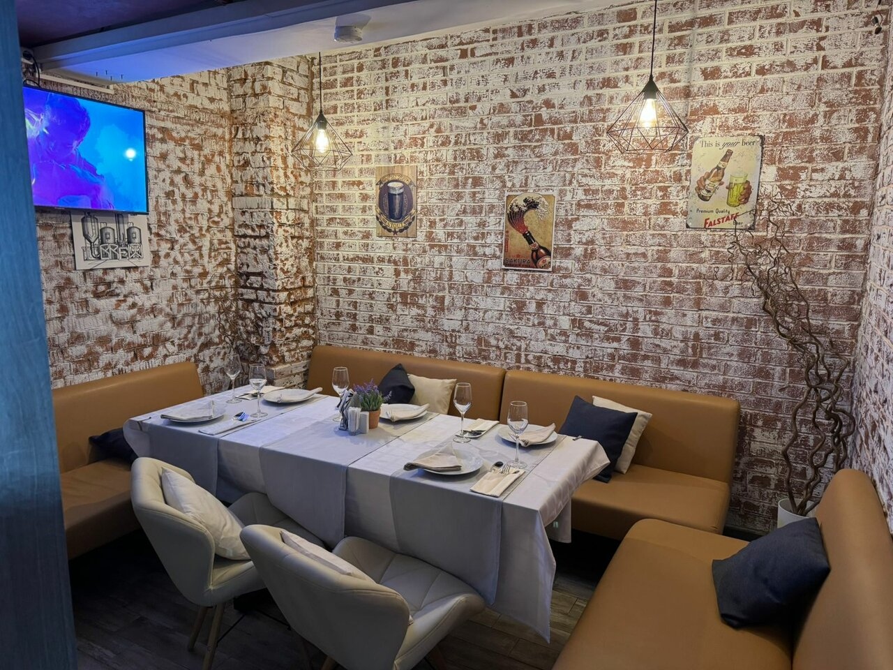 Атмосфера. Пространство оформлено в теплой коричнево-бежевой гамме и сочетает кирпичные стены с морскими акцентами: штурвалы, спасательные круги и канаты, которые создают намек на атмосферу портового паба. Приглушенный свет и деревянная мебель добавляют уюта, располагая к долгим застольям и душевным посиделкам.
