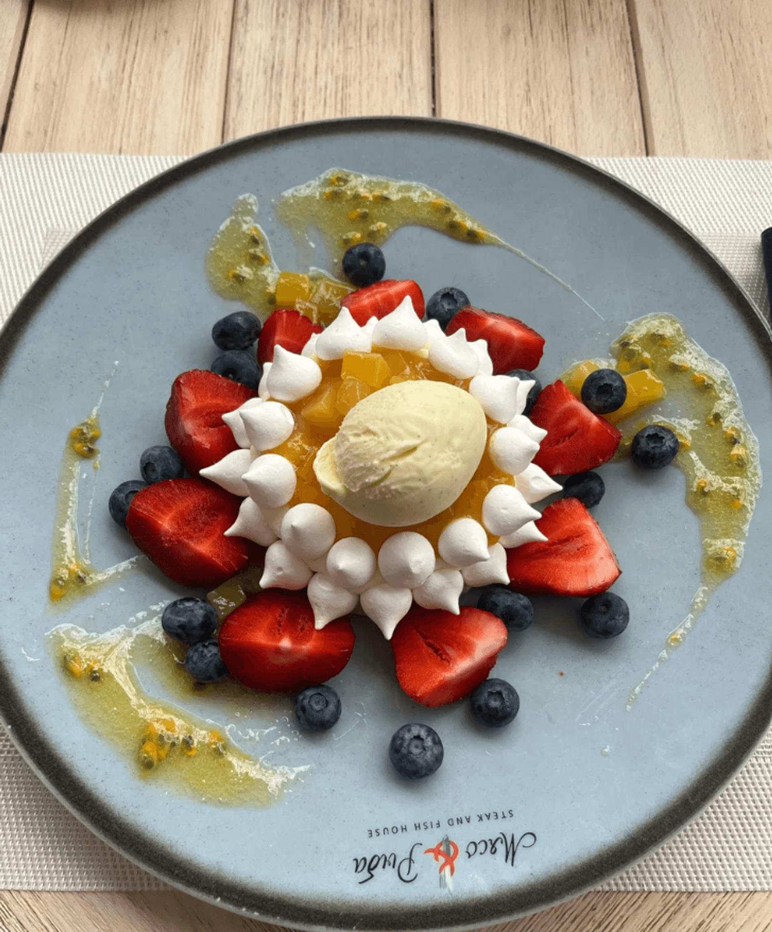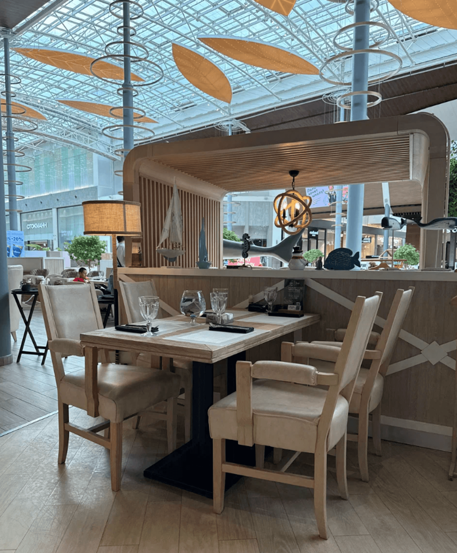 Еда и напитки. В заведении классическое для сети меню с акцентом на стейки из отечественной говядины и морепродукты с Дальнего Востока. Есть и редкие позиции: вонголе, фаланги краба, гребешки и осетрина. Особенность — специальные сет-меню для компаний и увеличенные семейные порции популярных блюд: специально для тех, кто пришел в торговый центр всей семьей.