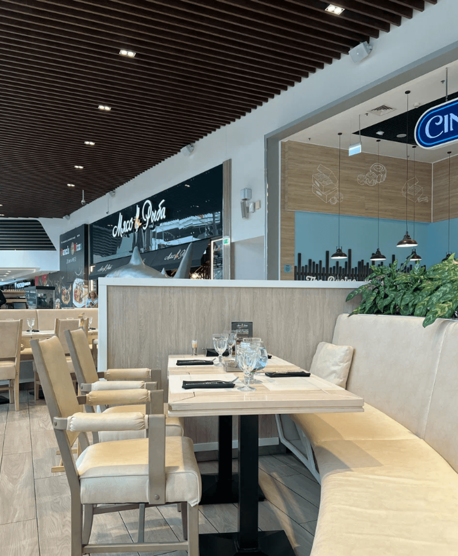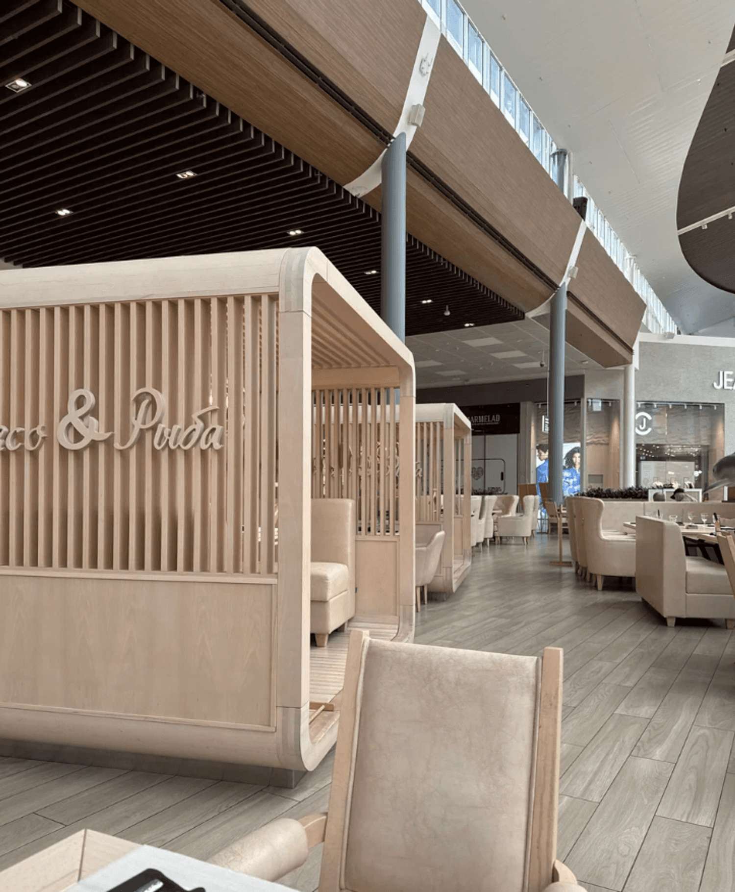 Атмосфера. Пространство на первом этаже торгового центра спроектировано как универсальная зона отдыха: просторные диваны, нейтральная отделка и панорамное остекление. Все это создает комфортную среду для посетителей любого возраста, а необычные кабинки из деревянных реек позволяют уединиться и отдохнуть даже в центре шумного ТРЦ.