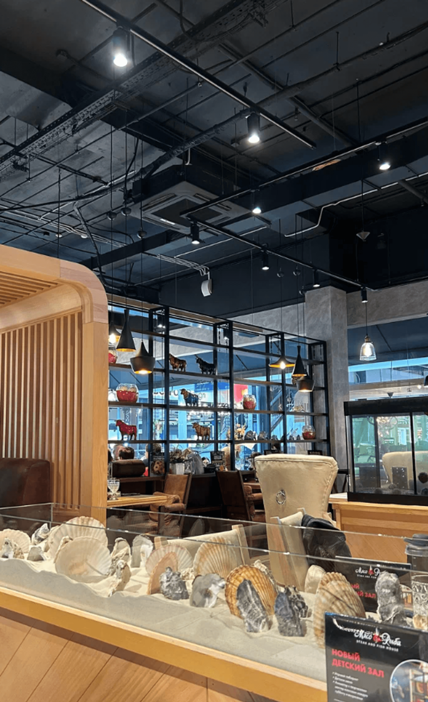 Атмосфера. Просторный зал с современным интерьером и стильными акцентами, выверенными до мелочей, создает атмосферу для любого случая — от семейных ужинов до деловых встреч. Здесь приятно провести время, наслаждаясь не только едой, но и светлой, уютной атмосферой.