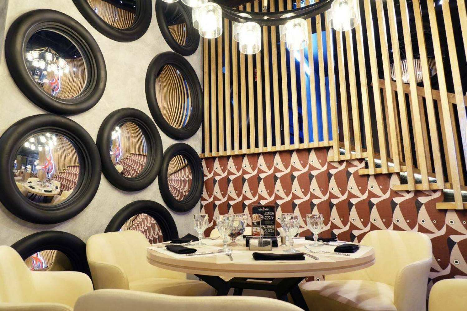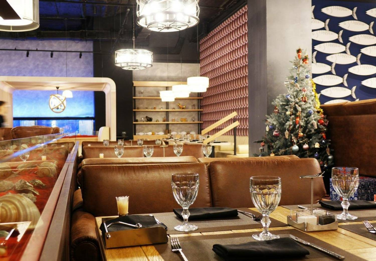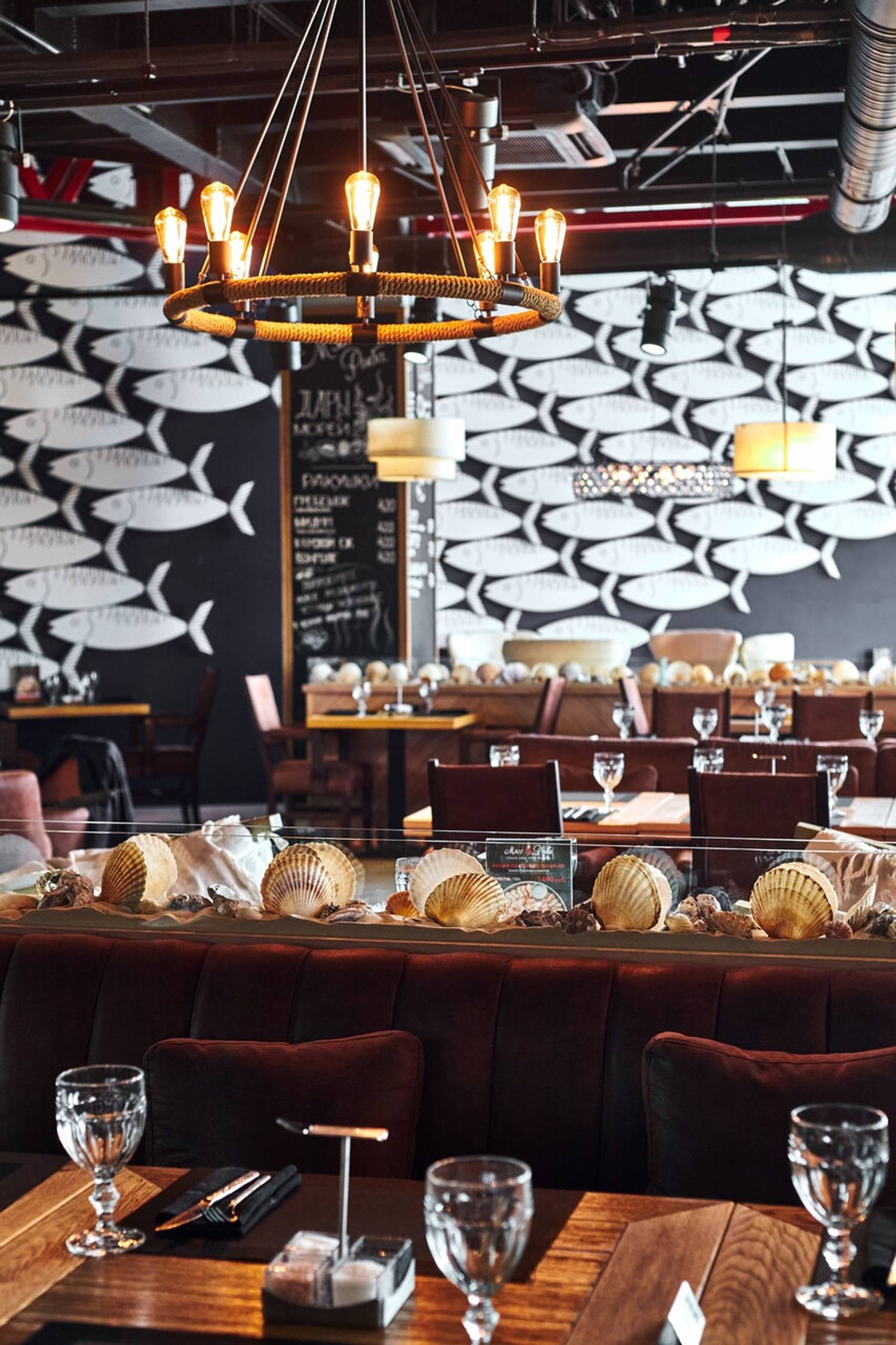 Атмосфера. Двухэтажное пространство разделено на контрастные зоны: светлую «морскую» с аквариумами и рыбками на стенах, и темную «мясную» с винно-красными акцентами. Интересной особенностью заведения являются 5 террариумов с обезьянками-игрунками, хамелеонами и сурикатами, за которыми особенно интересно понаблюдать детям.
