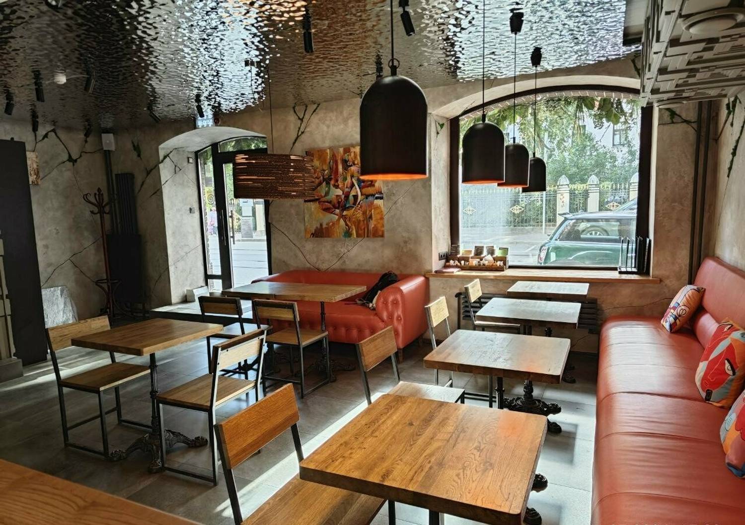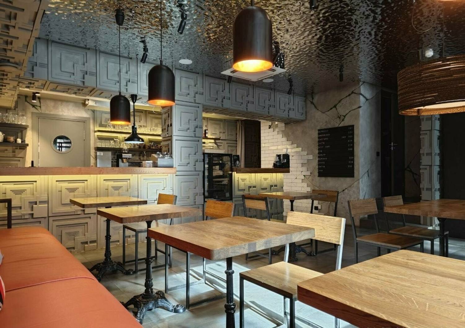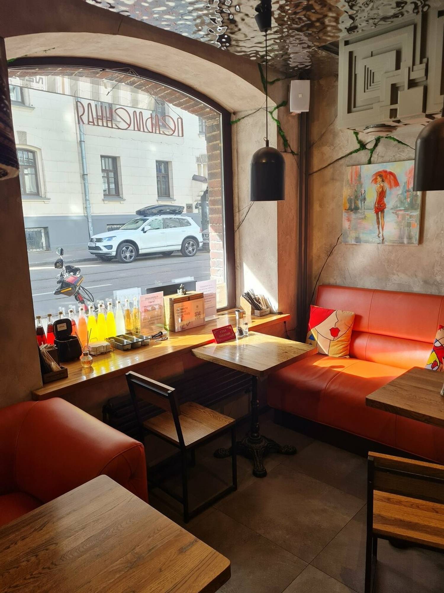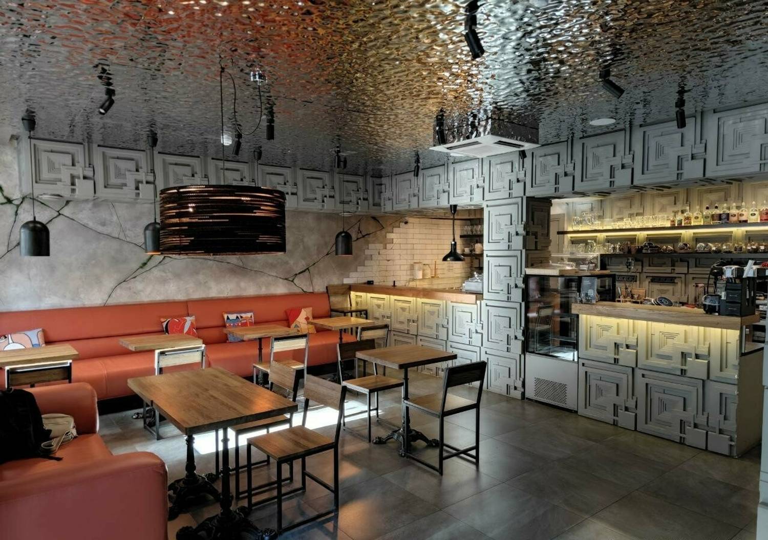 Атмосфера. Небольшое заведение с оранжевыми кожаными диванами и деревянными столами. Серебристый потолок с волнообразной текстурой напоминает рябь на поверхности воды и барная стойка серого цвета с геометрическими узорами подчеркивает современный подход к классическому формату.
