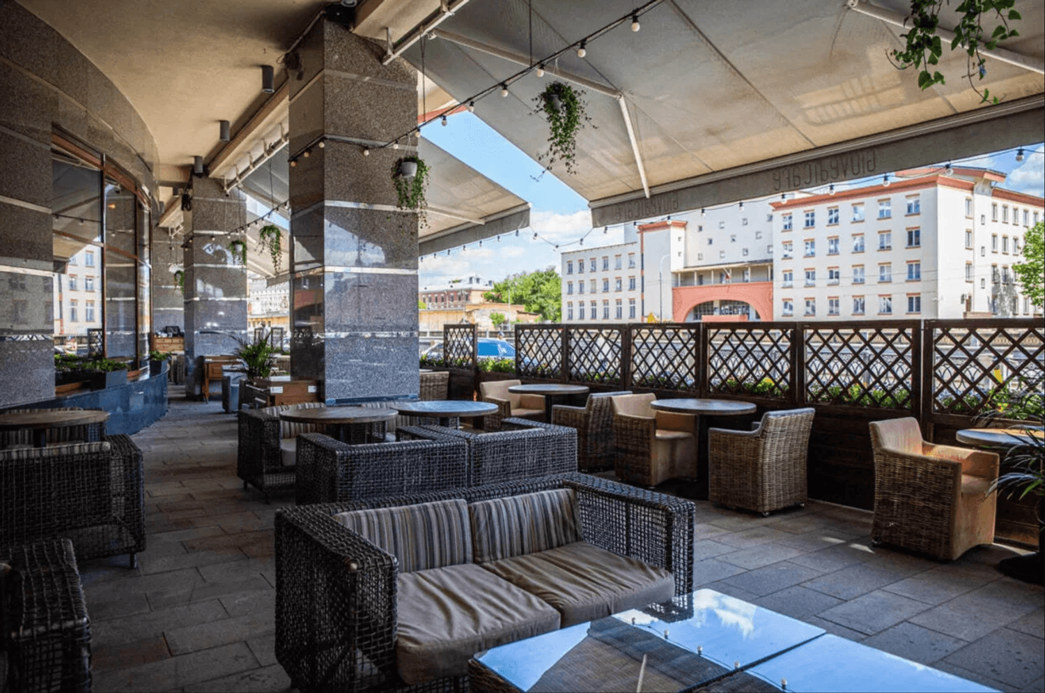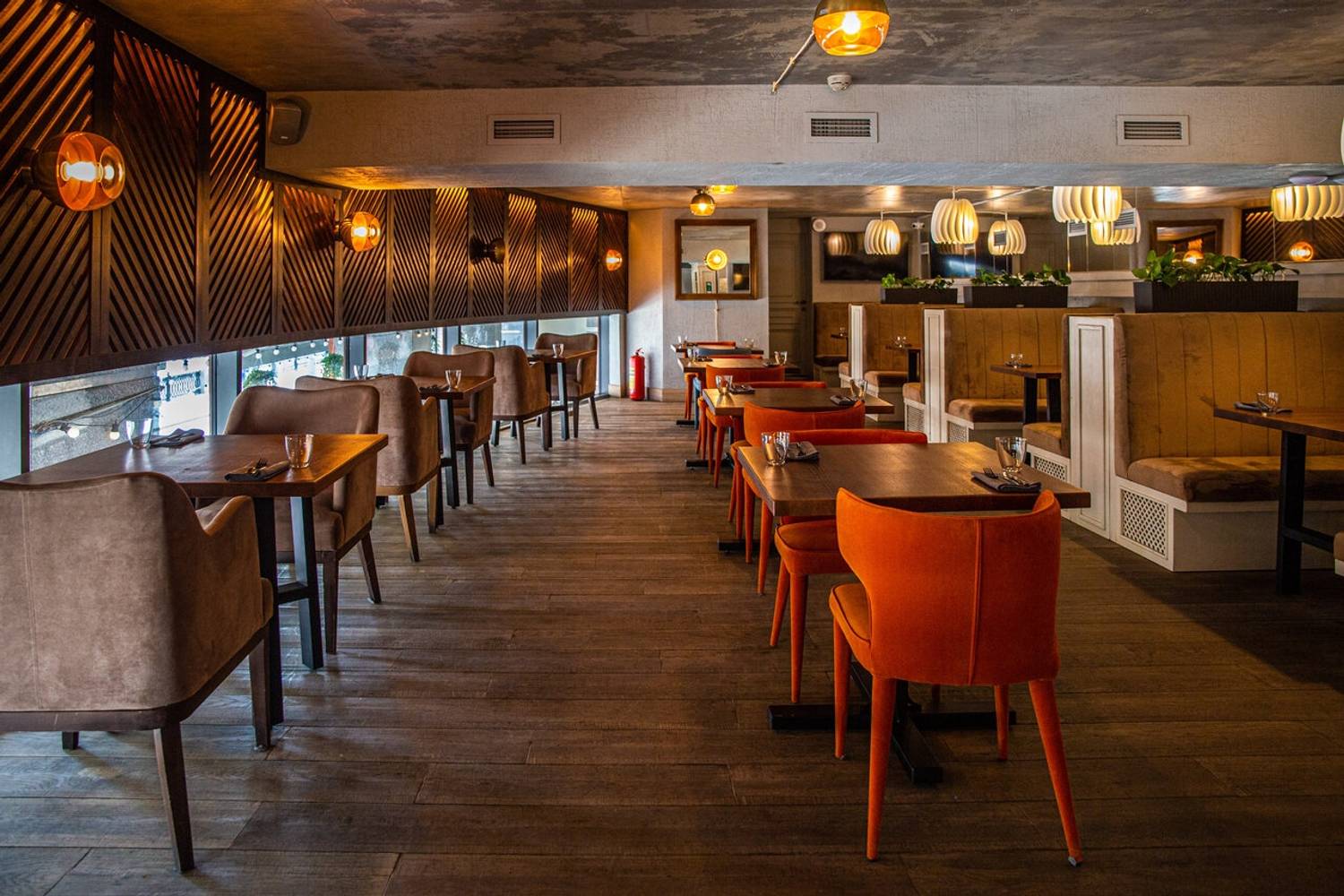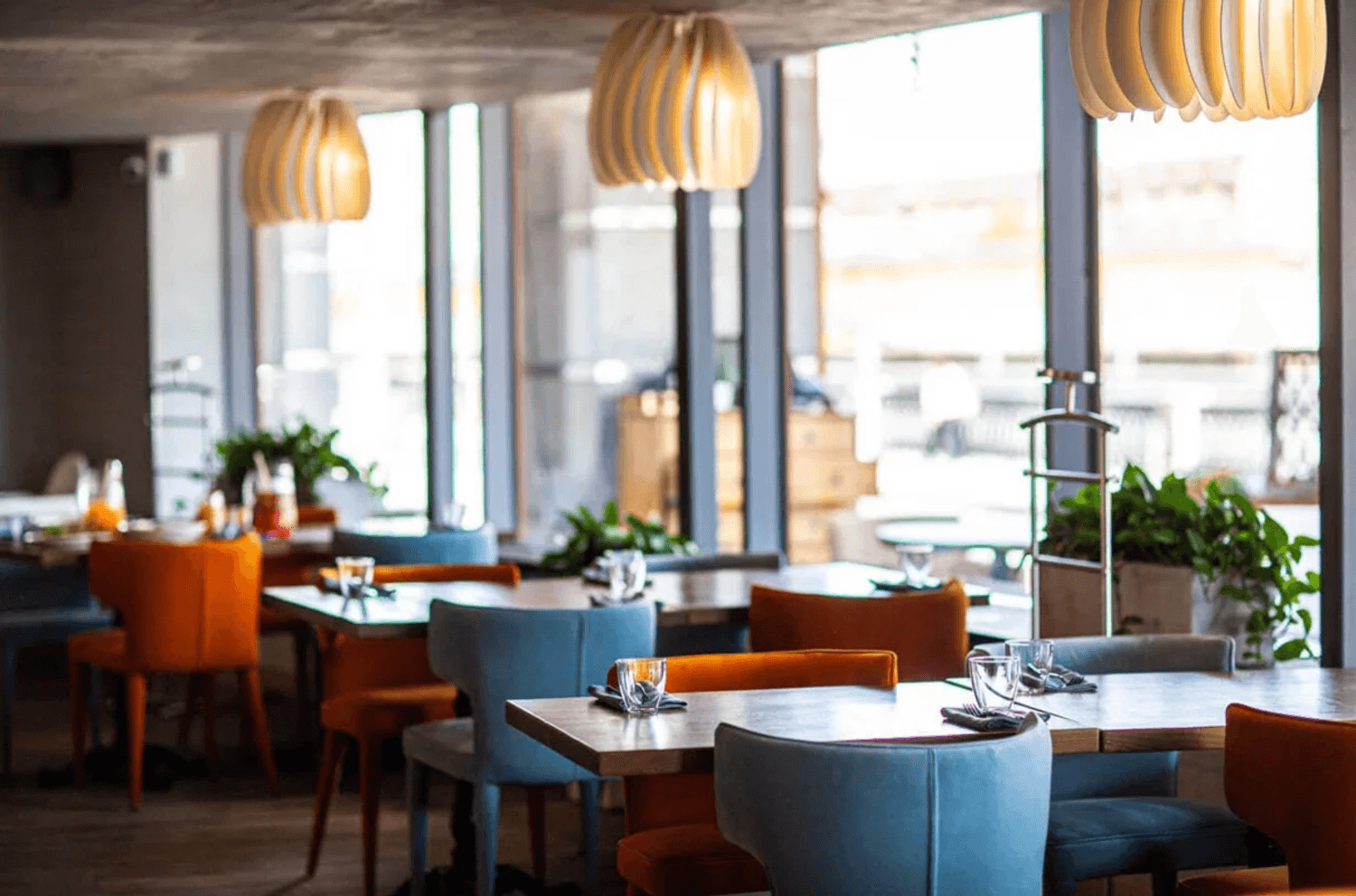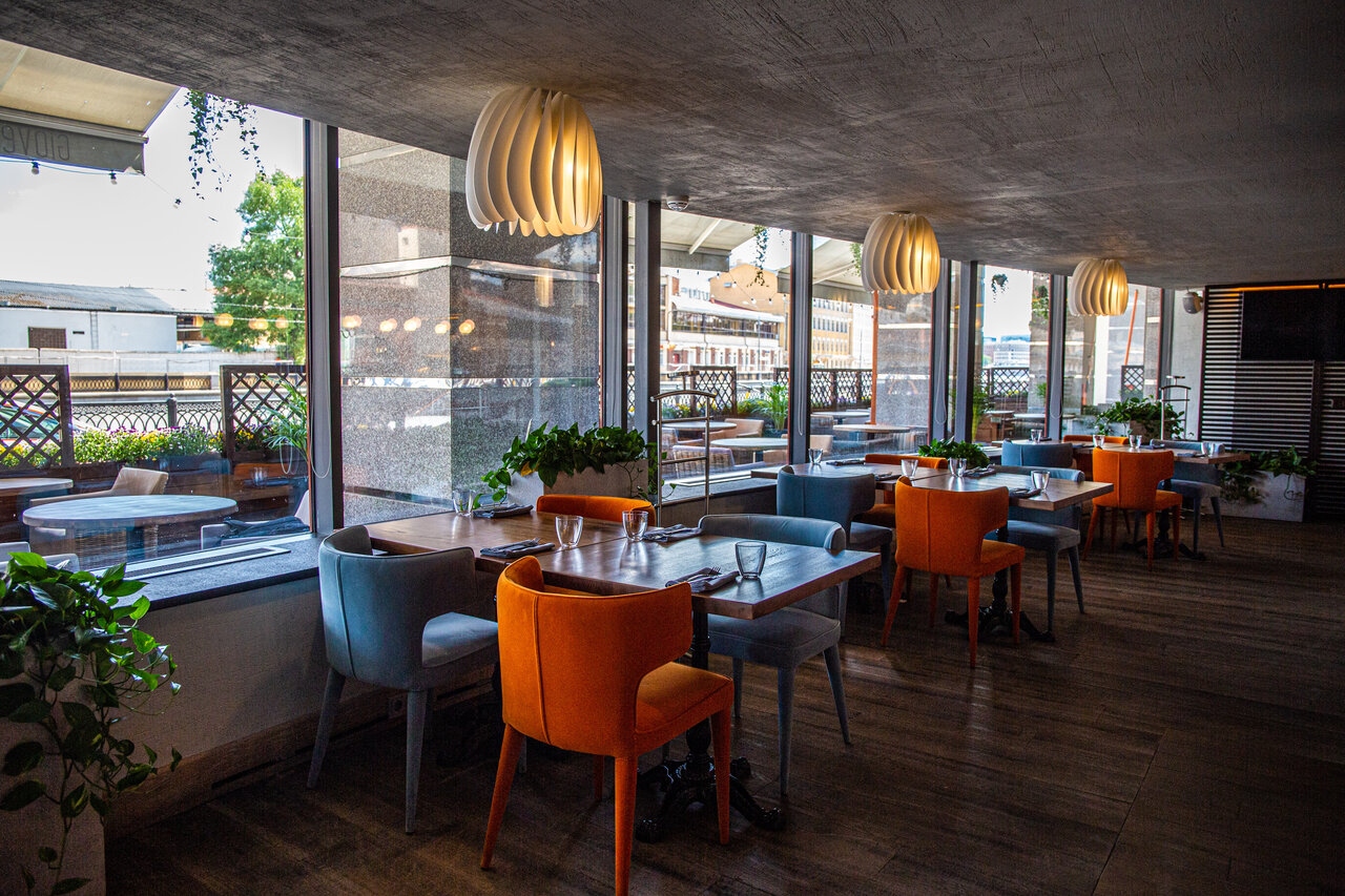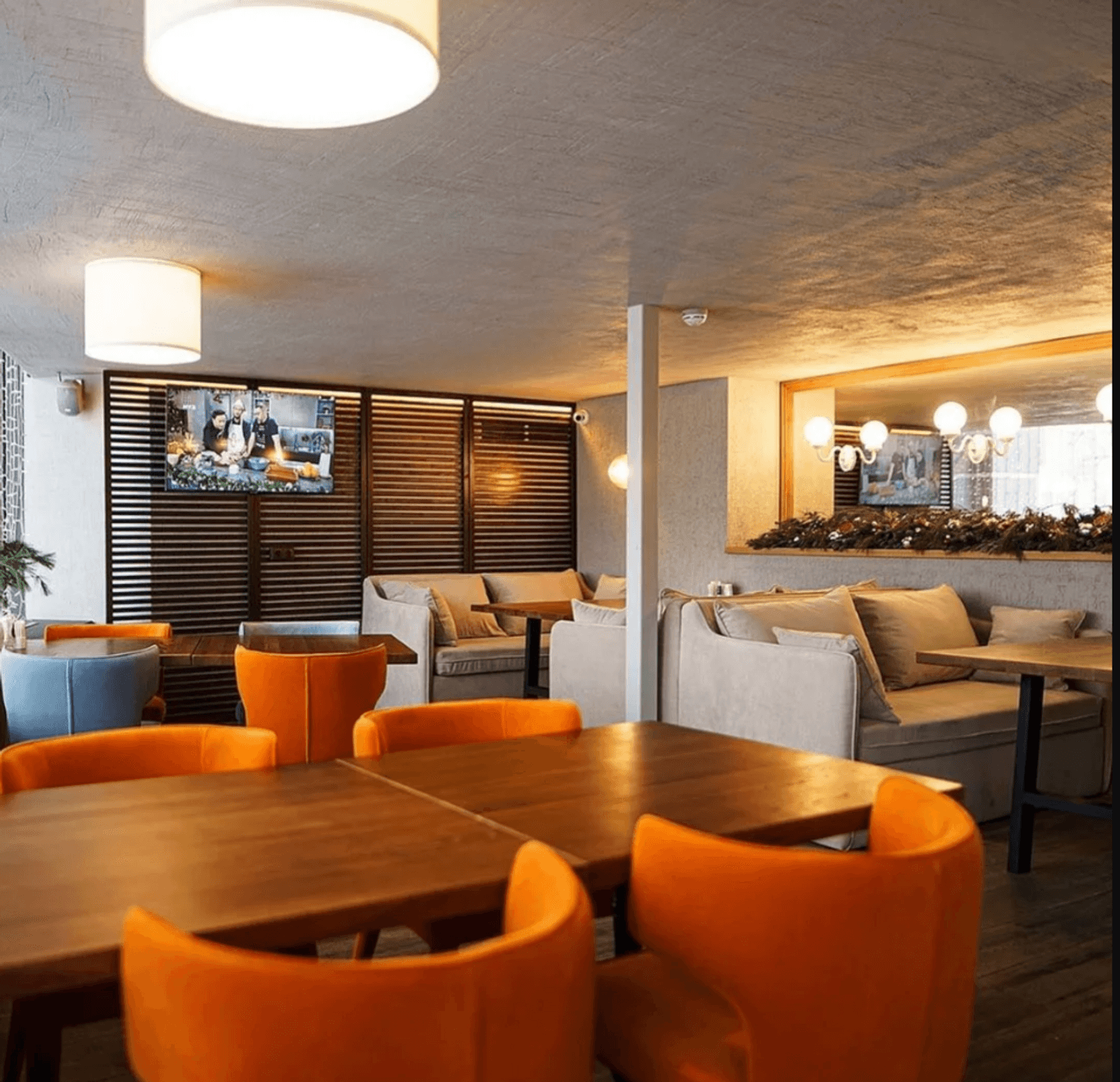 Атмосфера. Пространство оформлено светло и современно: мягкие диваны, теплое освещение, зелень и фантазийные светильники. Акцент на естественном свете и минималистичных деталях делает зал уютным и располагающим.