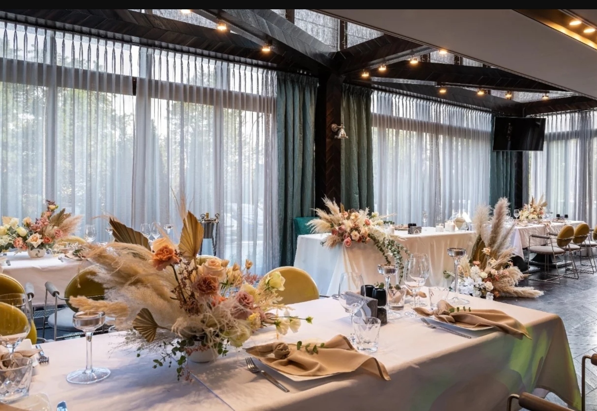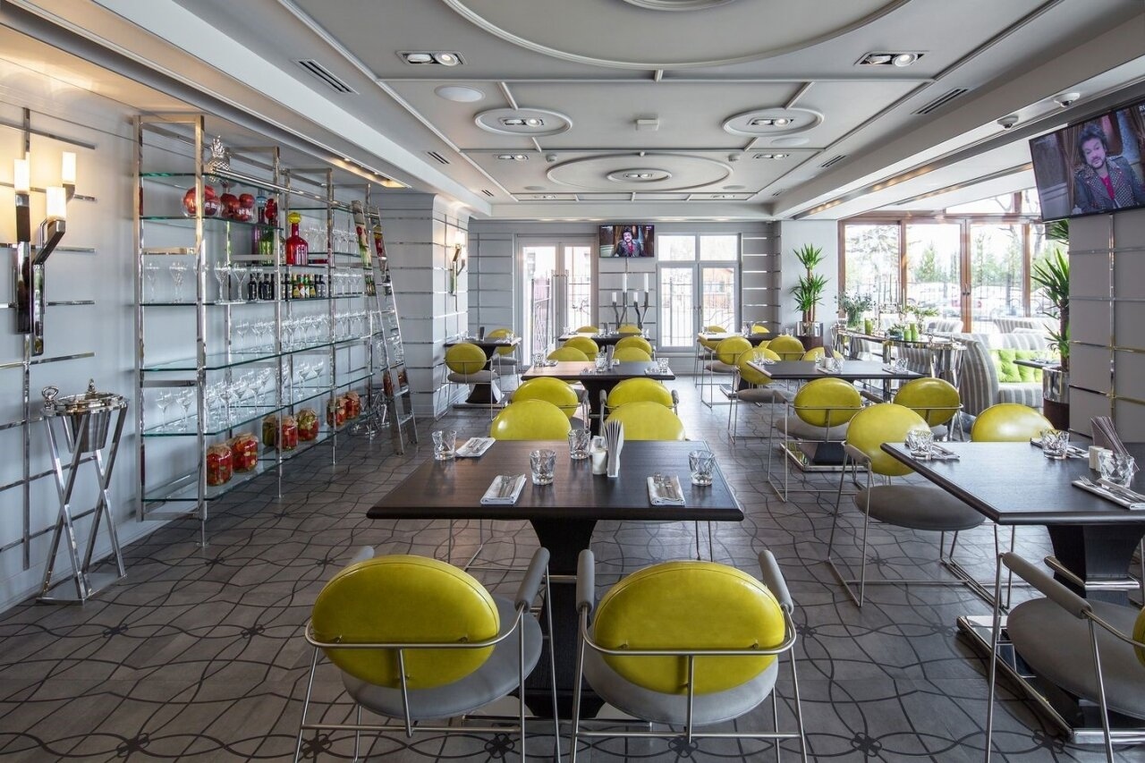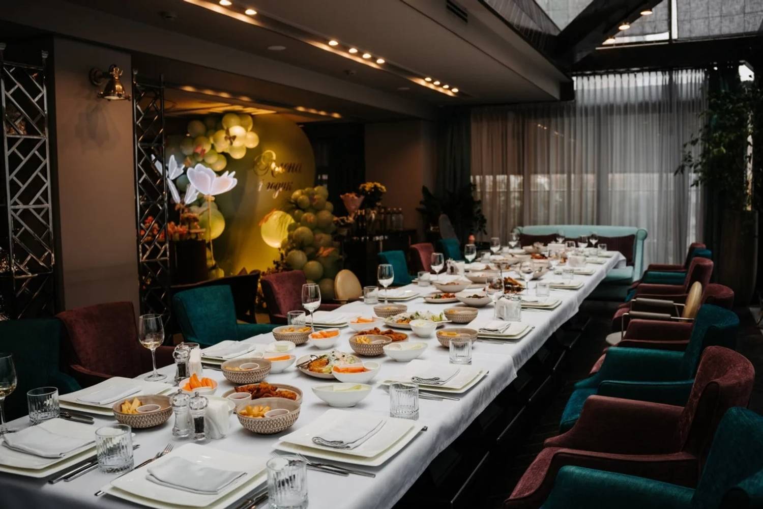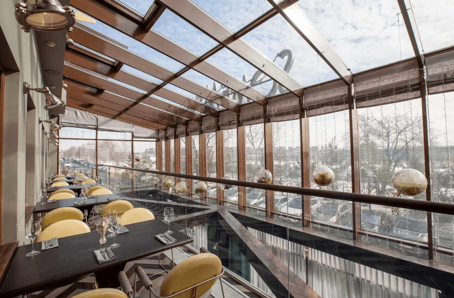 Атмосфера. Пространство сочетает минимализм с элементами ар-деко: лаконичная мебель, изящные зеркала и приглушенная палитра создают современную элегантность. Два зала, балкон и террасы с панорамным остеклением позволяют выбрать обстановку под настроение — от камерного ужина до праздника на свежем воздухе.
