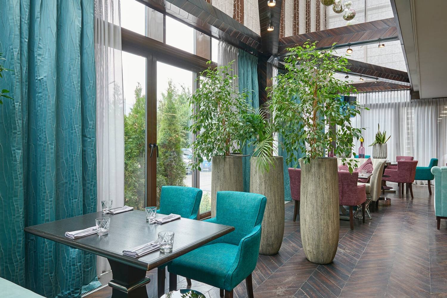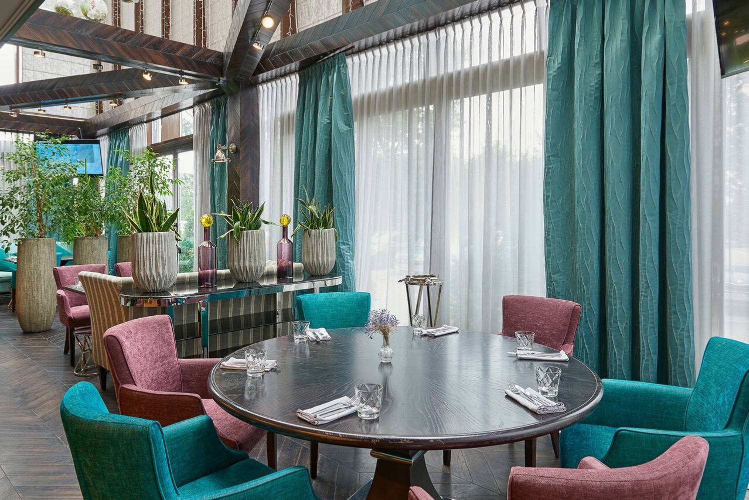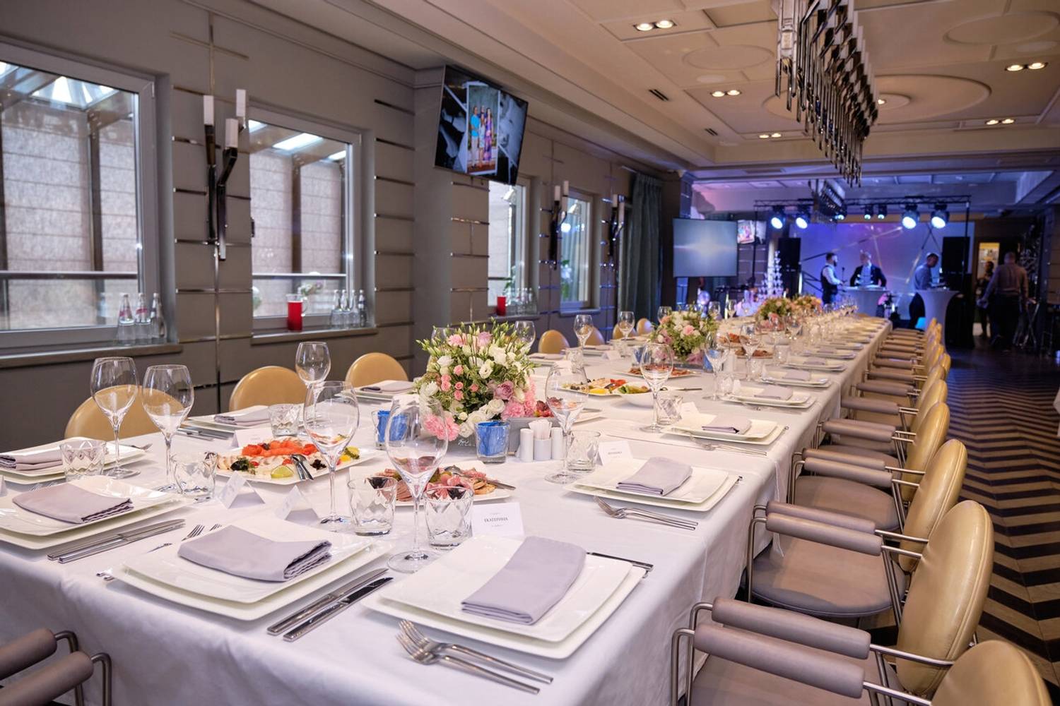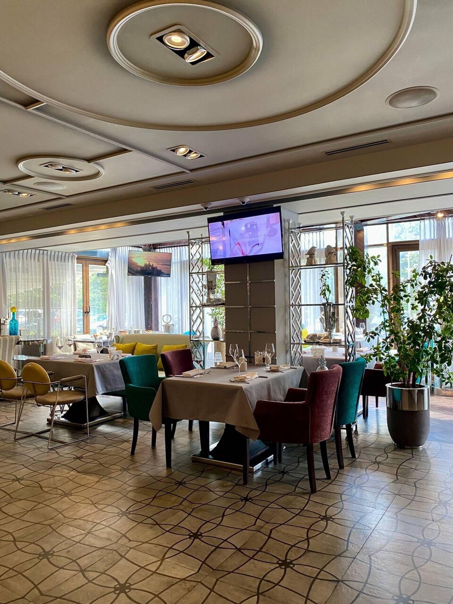 Атмосфера. Пространство сочетает минимализм с элементами ар-деко: лаконичная мебель, изящные зеркала и приглушенная палитра создают современную элегантность. Два зала, балкон и террасы с панорамным остеклением позволяют выбрать обстановку под настроение — от камерного ужина до праздника на свежем воздухе.