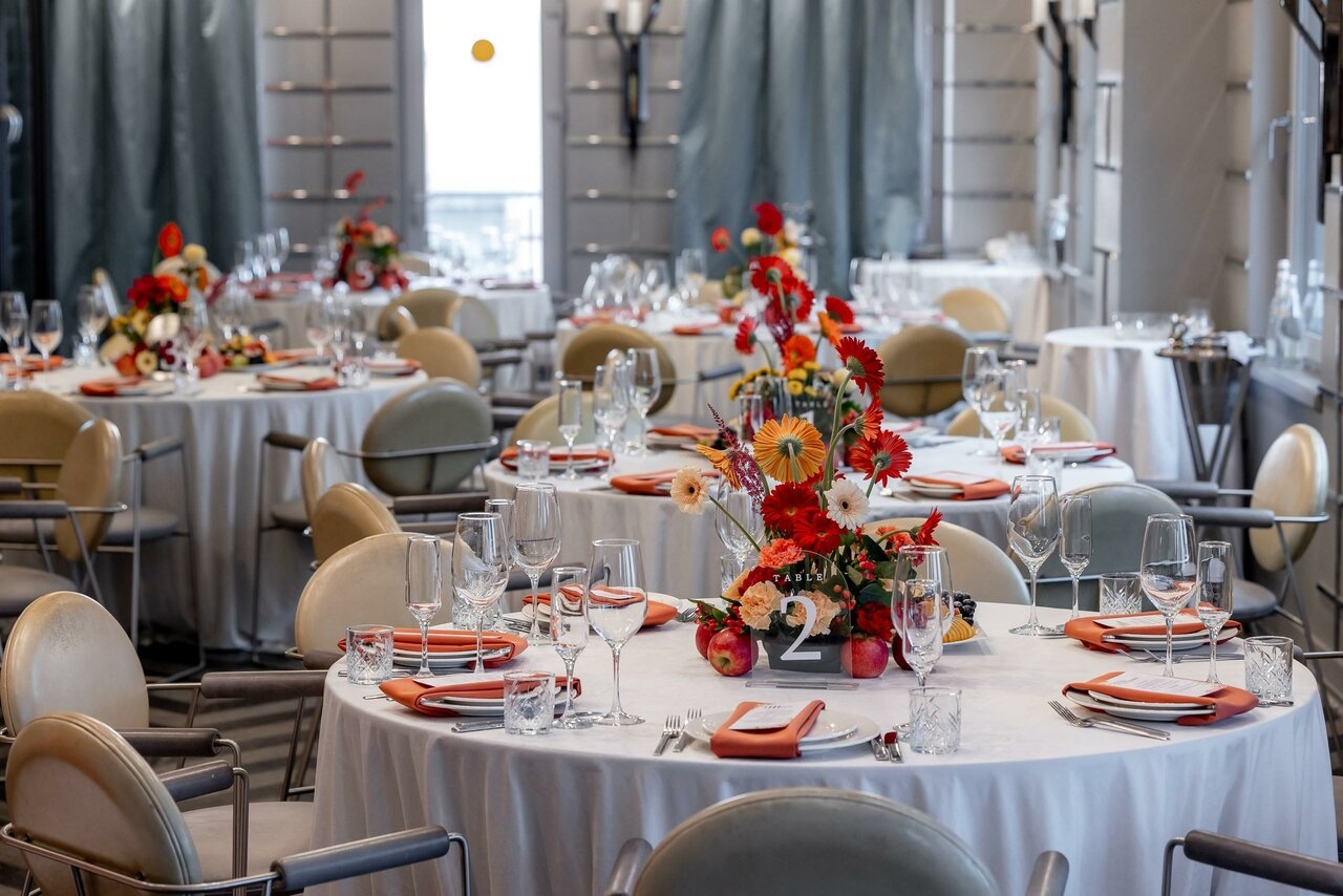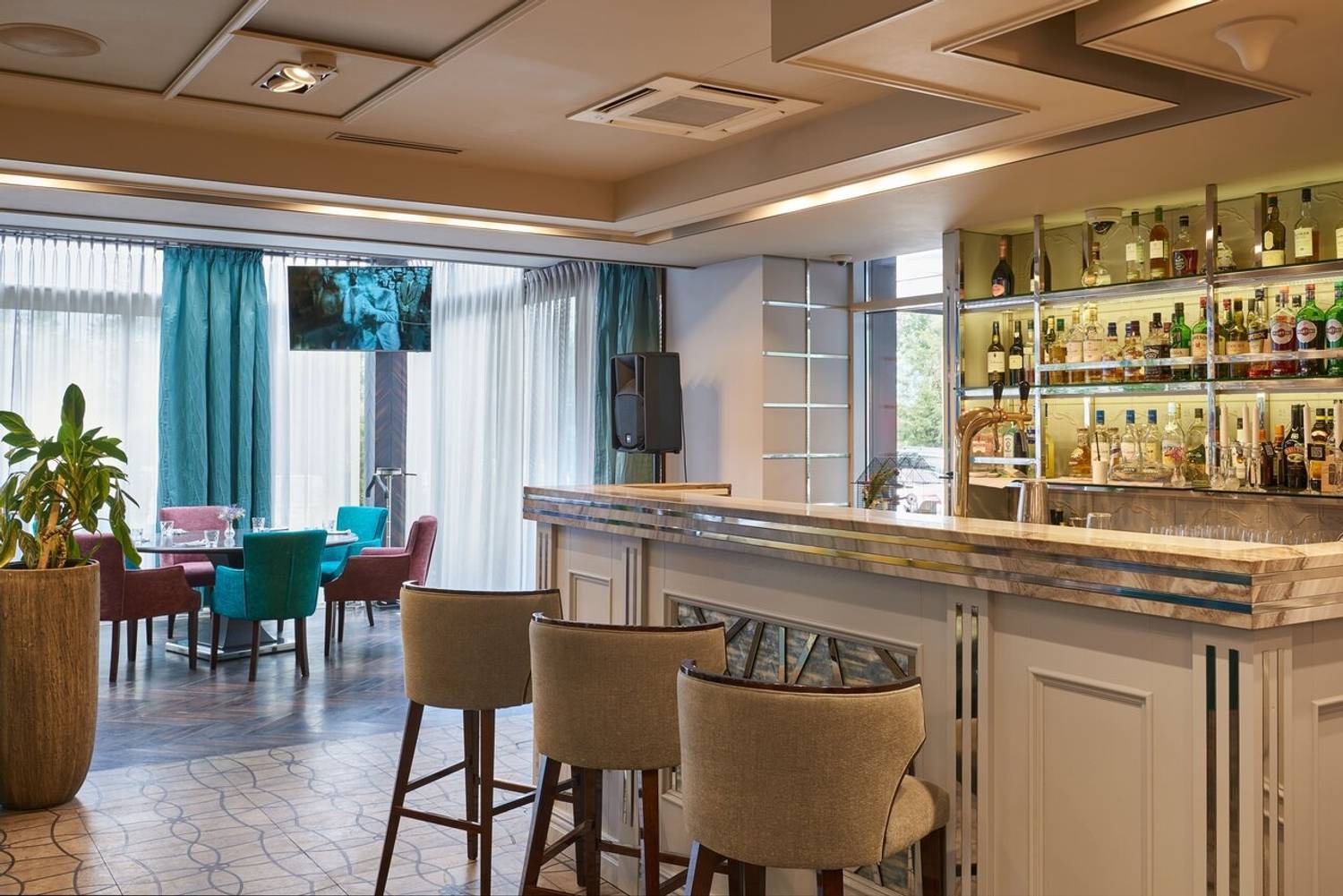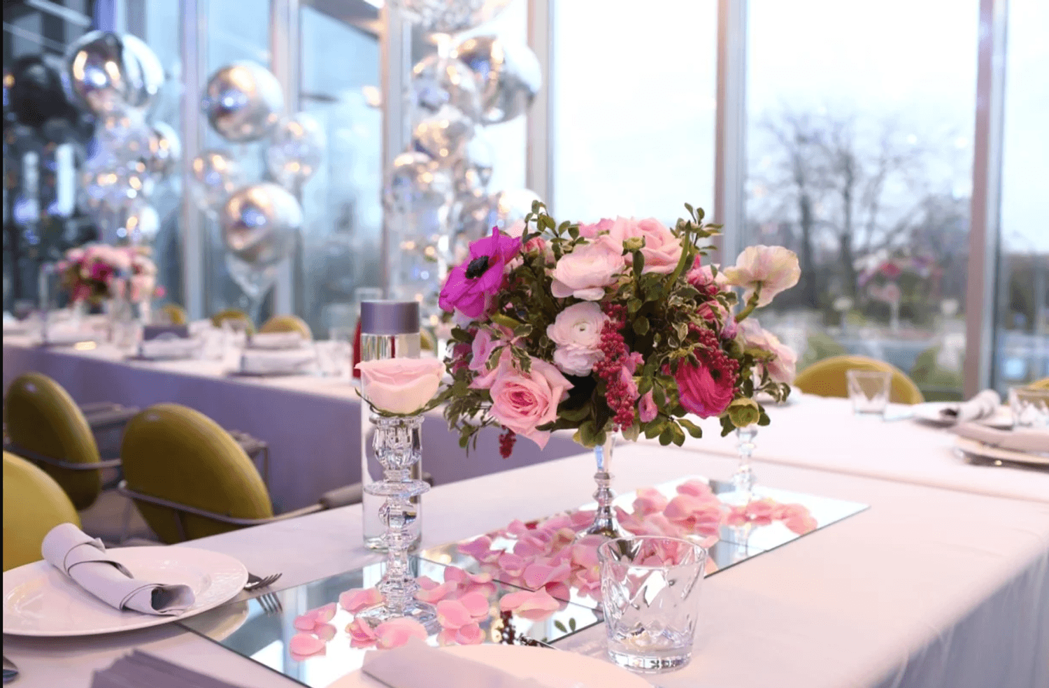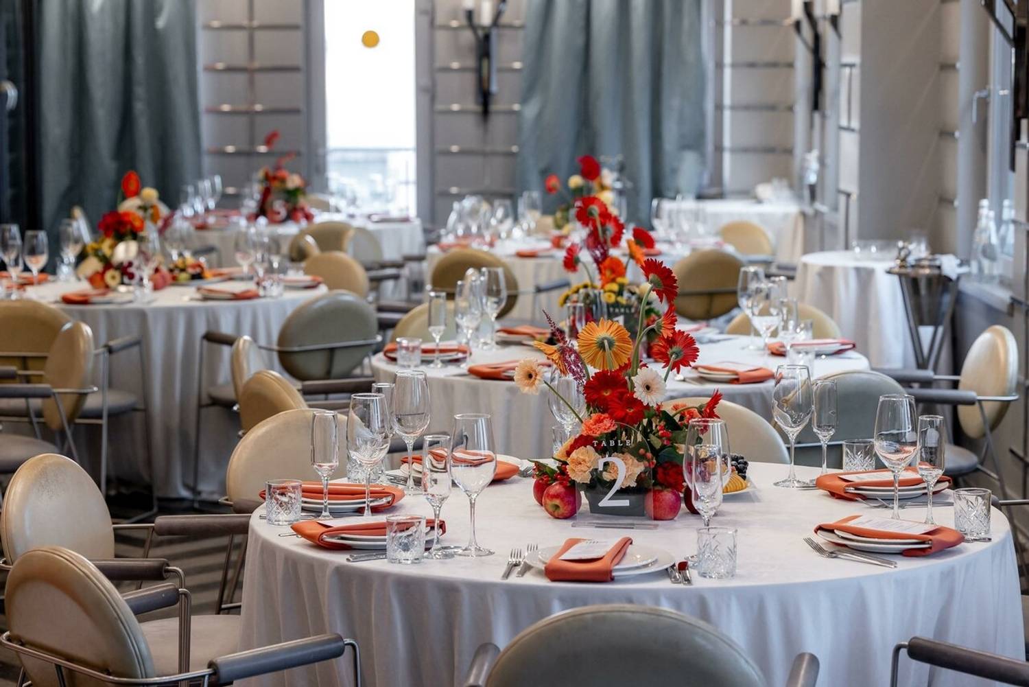 Атмосфера. Пространство сочетает минимализм с элементами ар-деко: лаконичная мебель, изящные зеркала и приглушенная палитра создают современную элегантность. Два зала, балкон и террасы с панорамным остеклением позволяют выбрать обстановку под настроение — от камерного ужина до праздника на свежем воздухе.