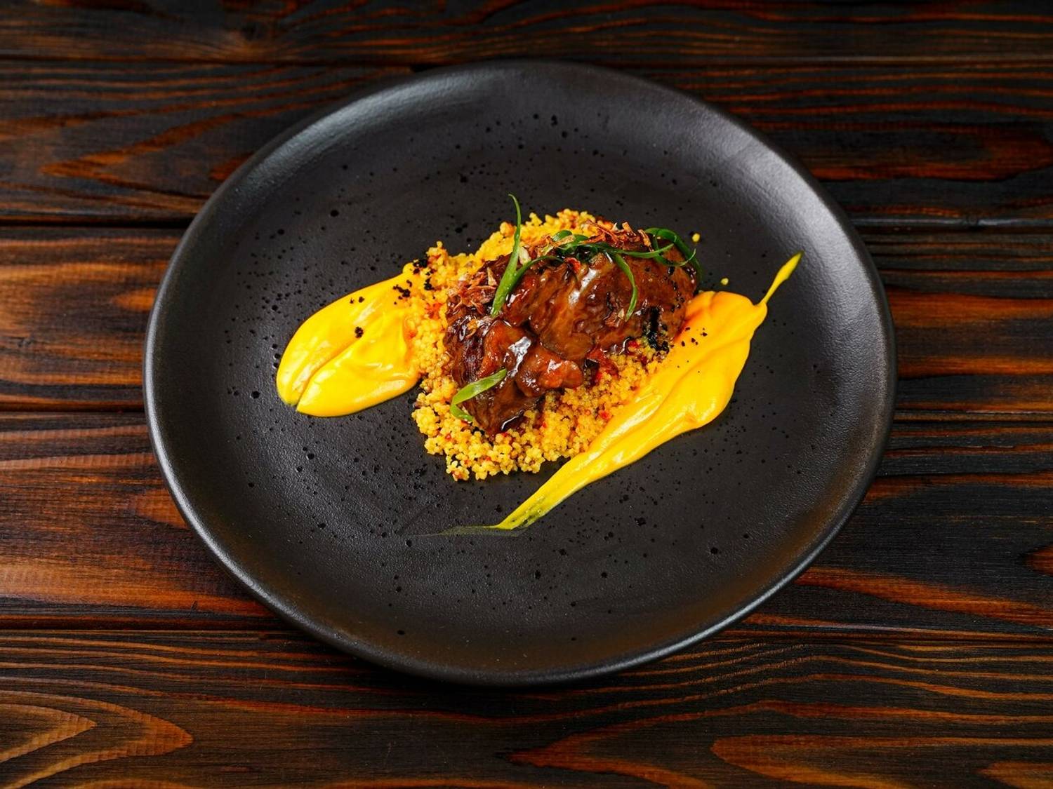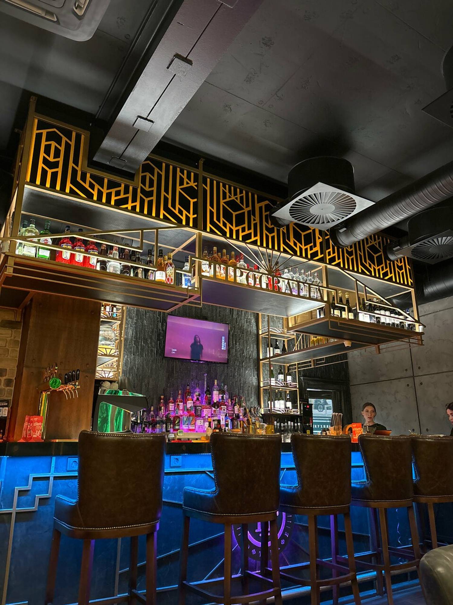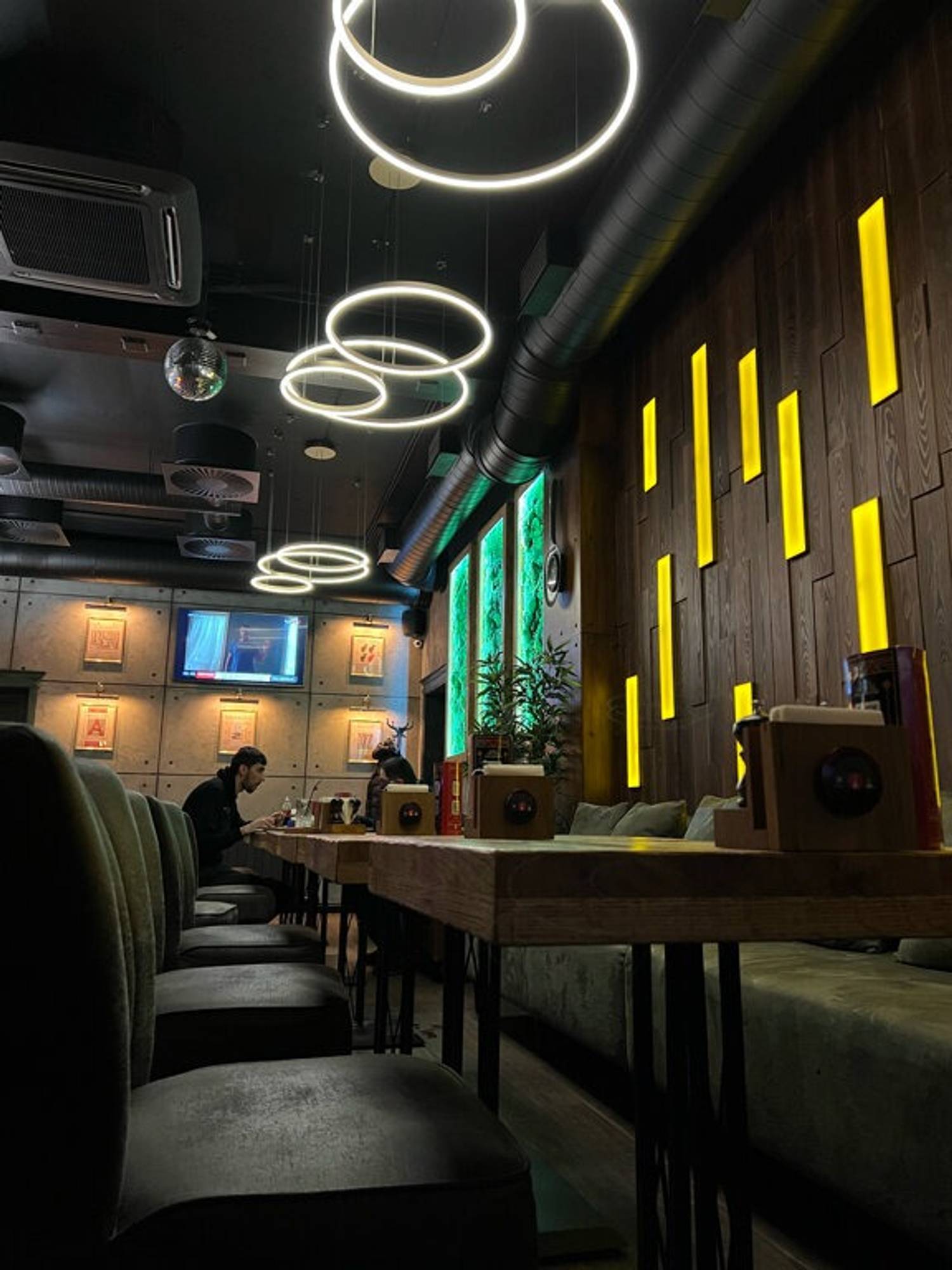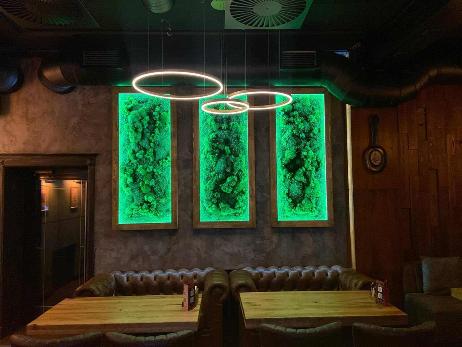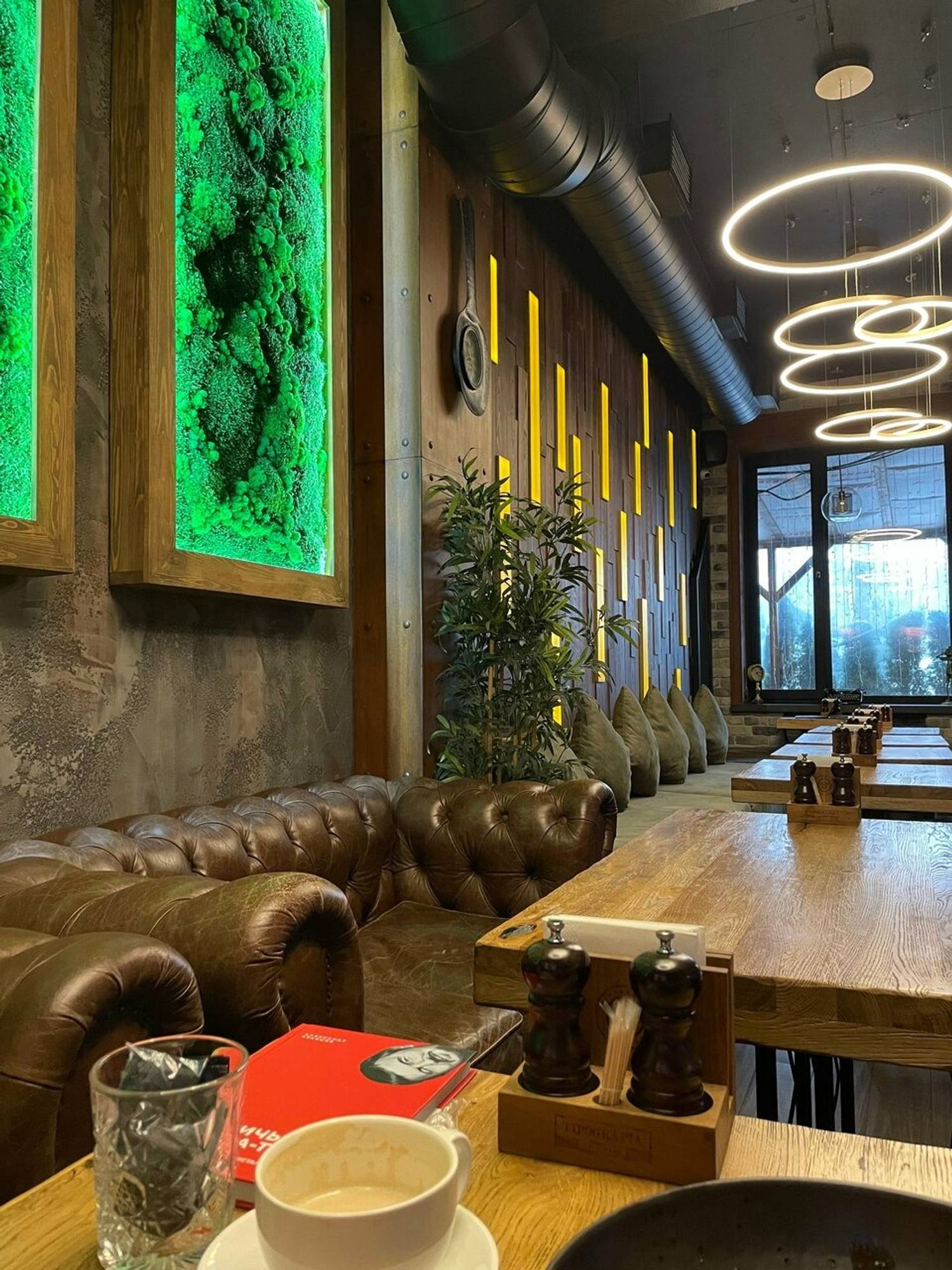 Атмосфера. Здесь несколько залов: центральный зал с барной стойкой, второй этаж и закрытую веранду-дворик, которая работает даже зимой. Интерьер лаконичный с кольцевыми люстрами, темно-коричневые стенами. Добавили и декорации в природном стиле: прямоугольные панно с искусственной травой и подсветкой, подвесные кресла и декоративная гигантская ложка с интегрированными часами.