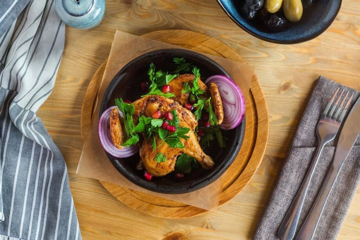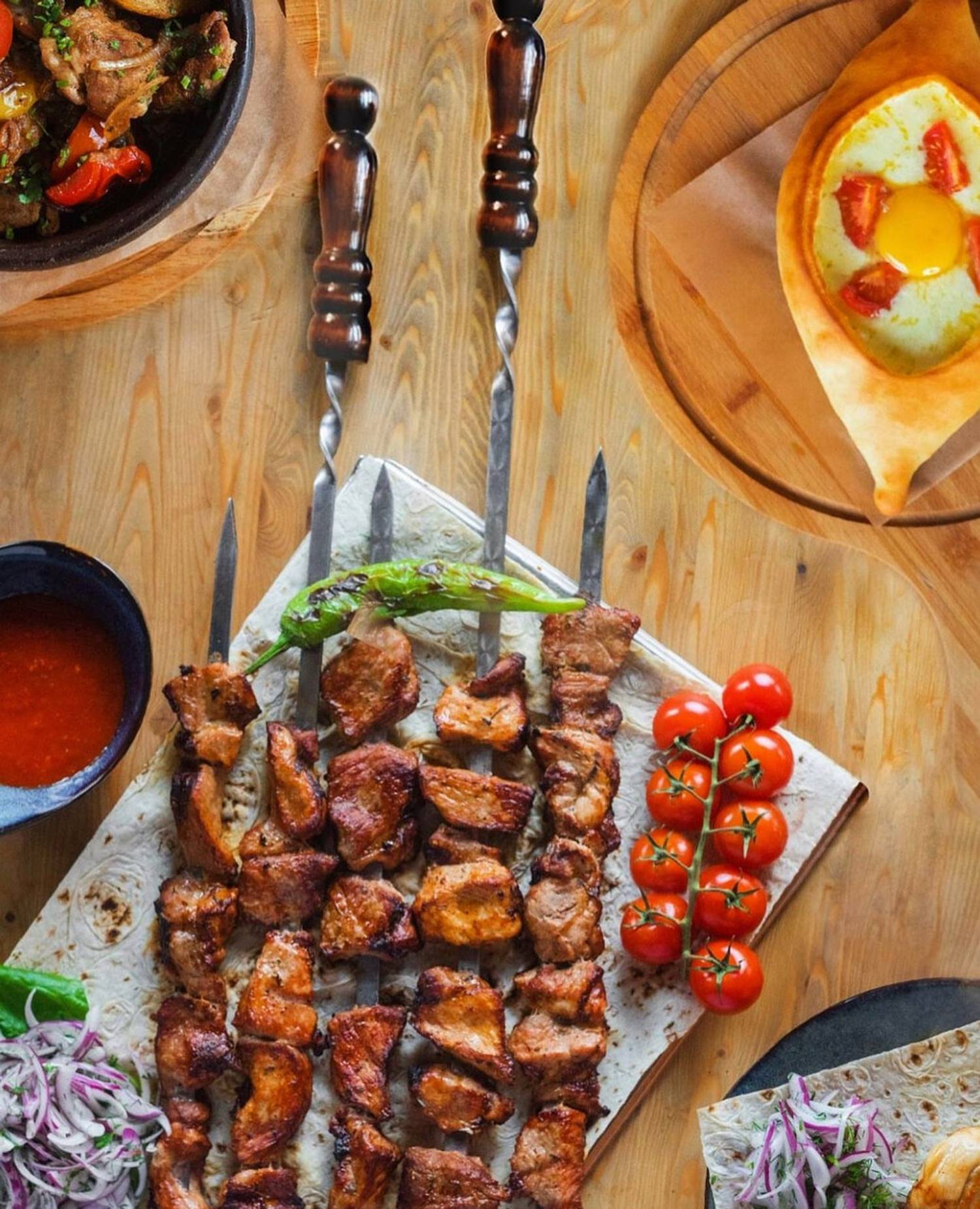 Еда и напитки. В меню классические грузинские блюда — сулугуни в кляре, баранья голень под соусом демиглас, форель в лаваше, хачапури по-аджарски с помидорами. Также в основе блюда на углях: мякоть свинины, лангустины на мангале и корейка из баранины. На десерт готовят пахлаву и яблочный штрудель.