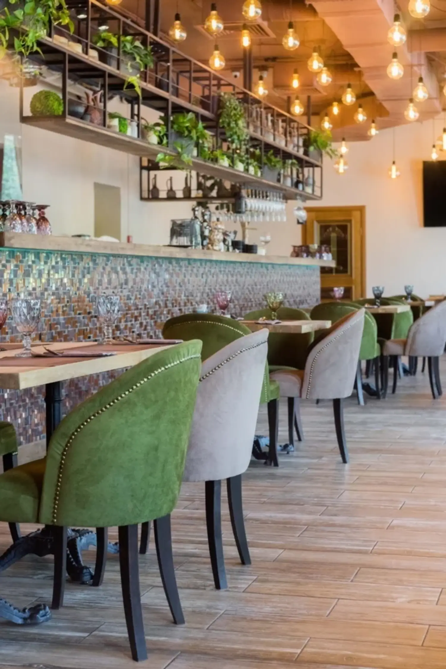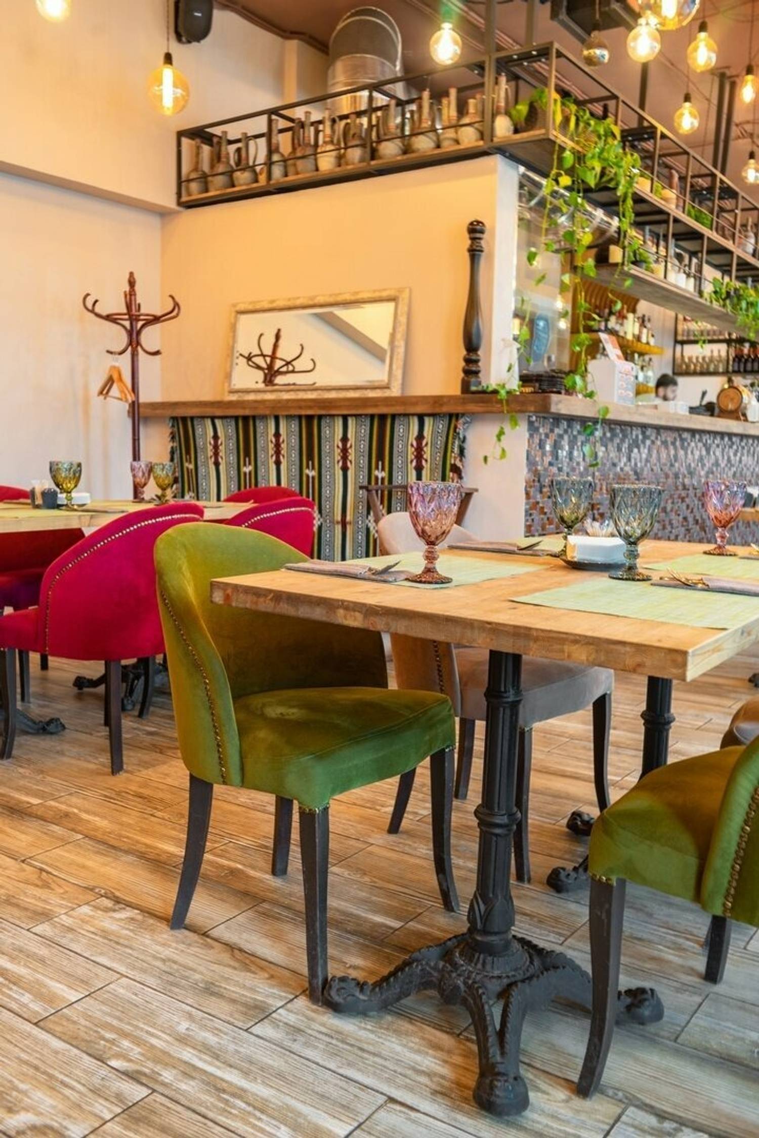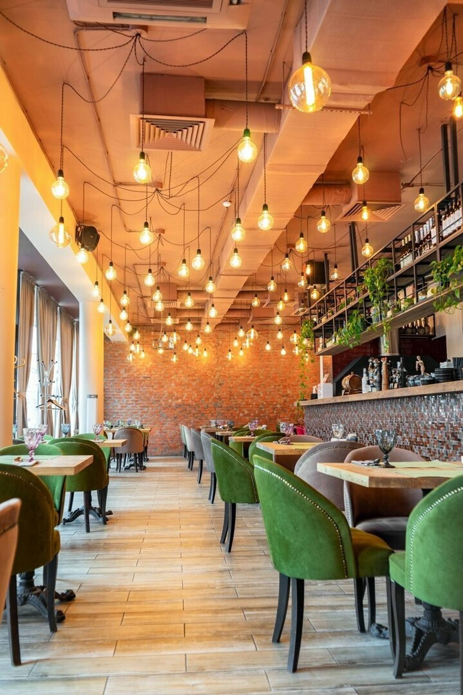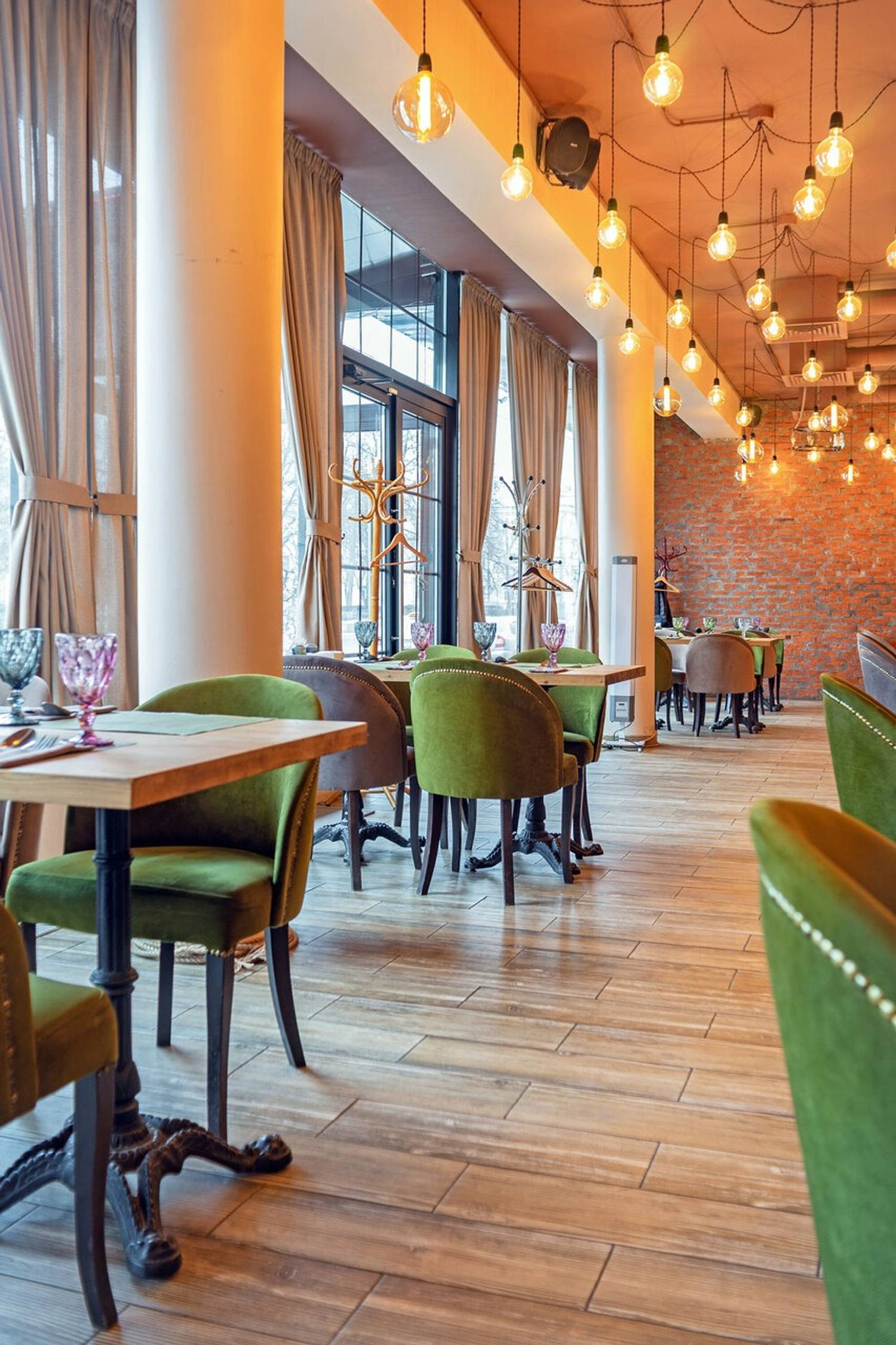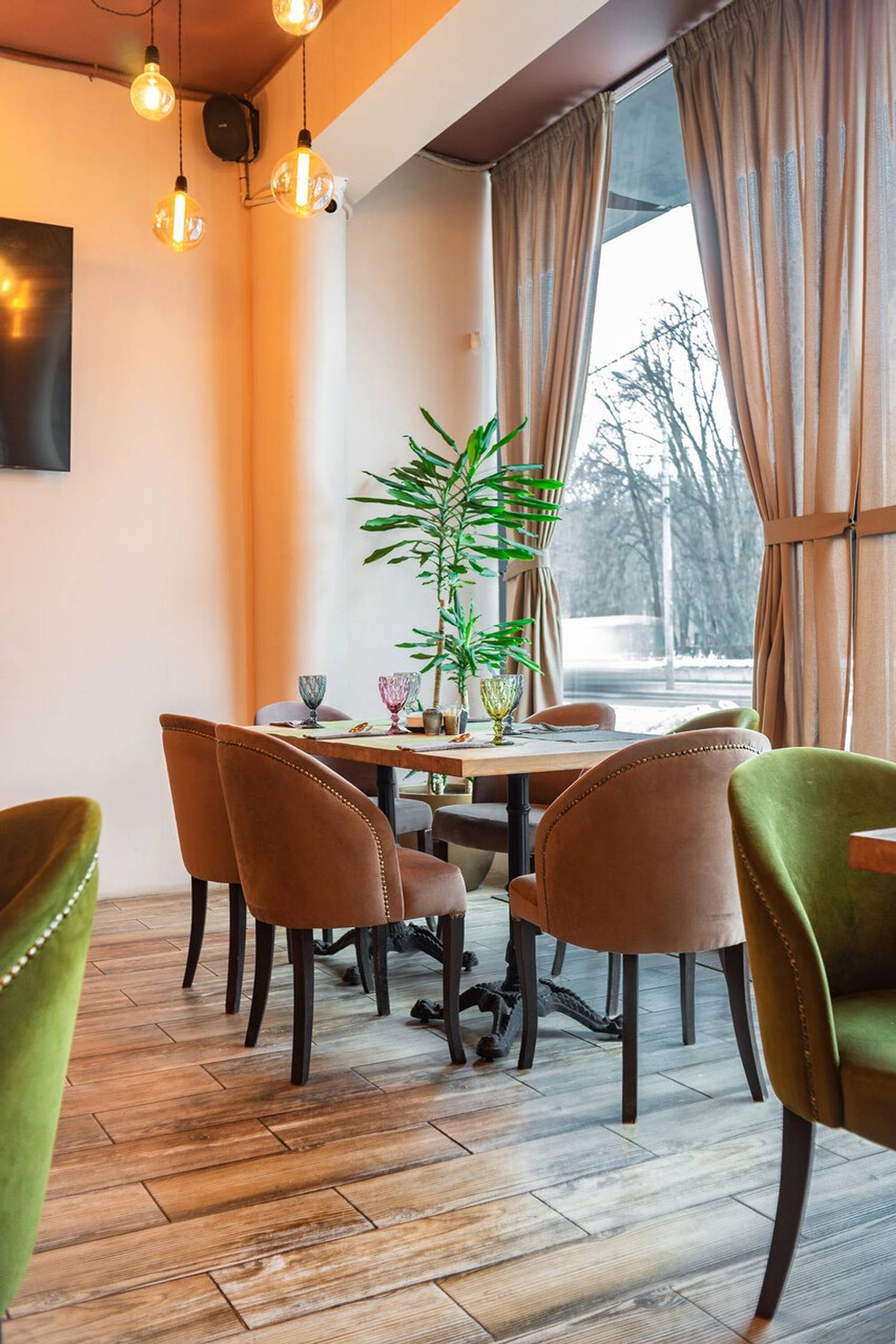 Атмосфера. Небольшое, но уютное помещение в стиле лофт: кирпичные стены, светлые тона, яркие бархатные стулья. Здесь проводят банкеты, где гости чувствуют себя как дома.