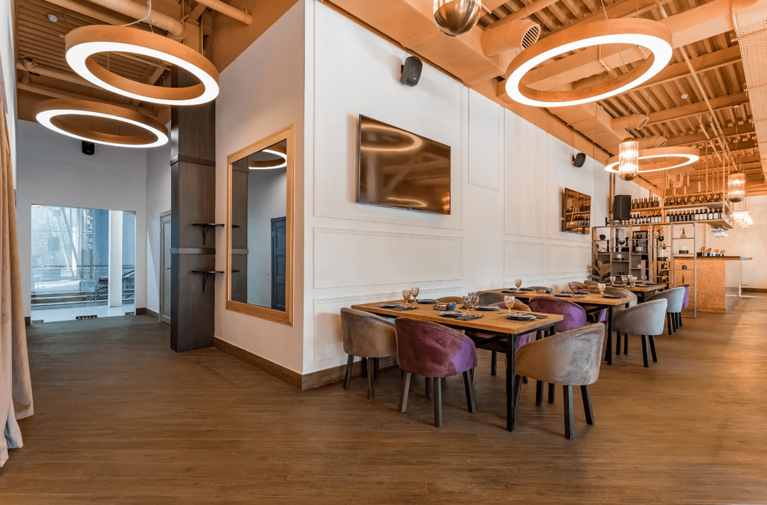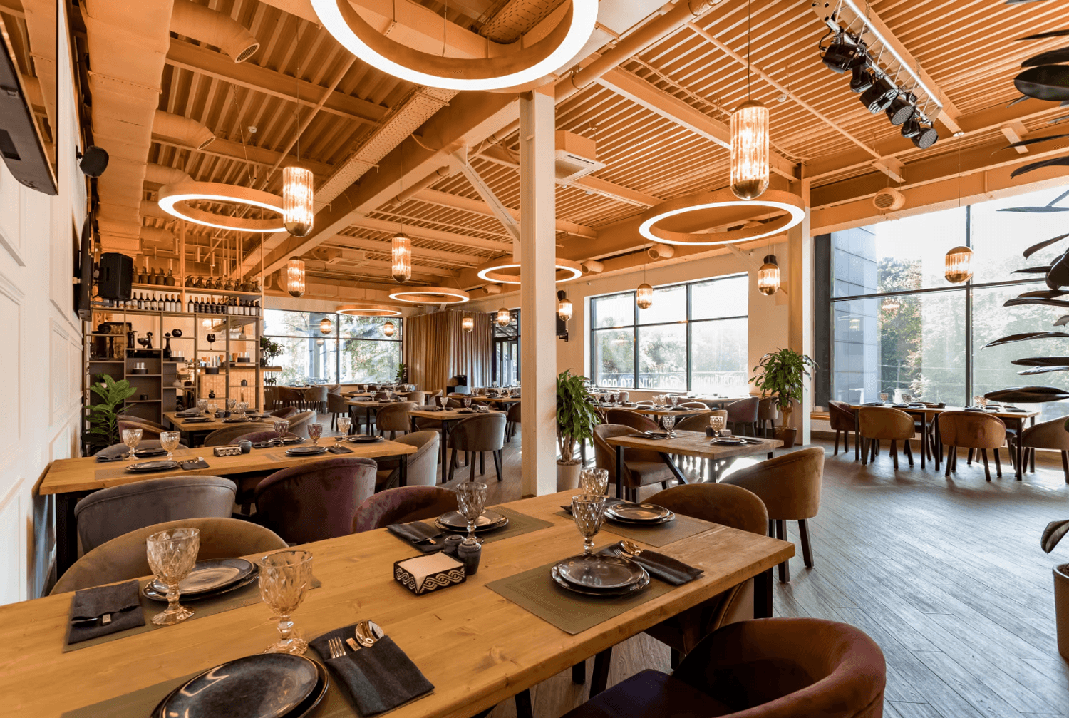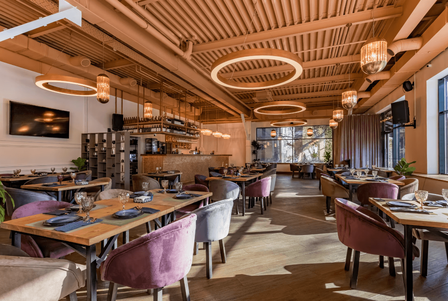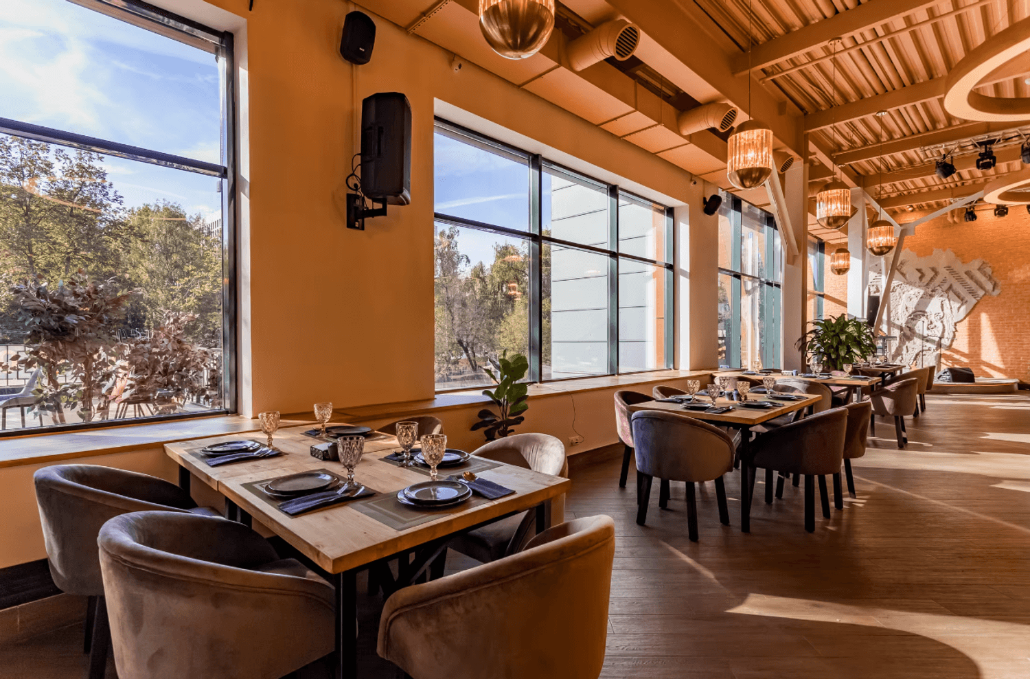 Атмосфера. Кирпичные стены и коричневые шторы создают теплую основу, которую дополняют эффектные детали — большие круглые люстры-нимбы с деревянной рамой, барная стойка со слегка мерцающим покрытием и зеркало в золотой раме. На небольшой сцене регулярно выступают музыканты, а летом работает терраса.