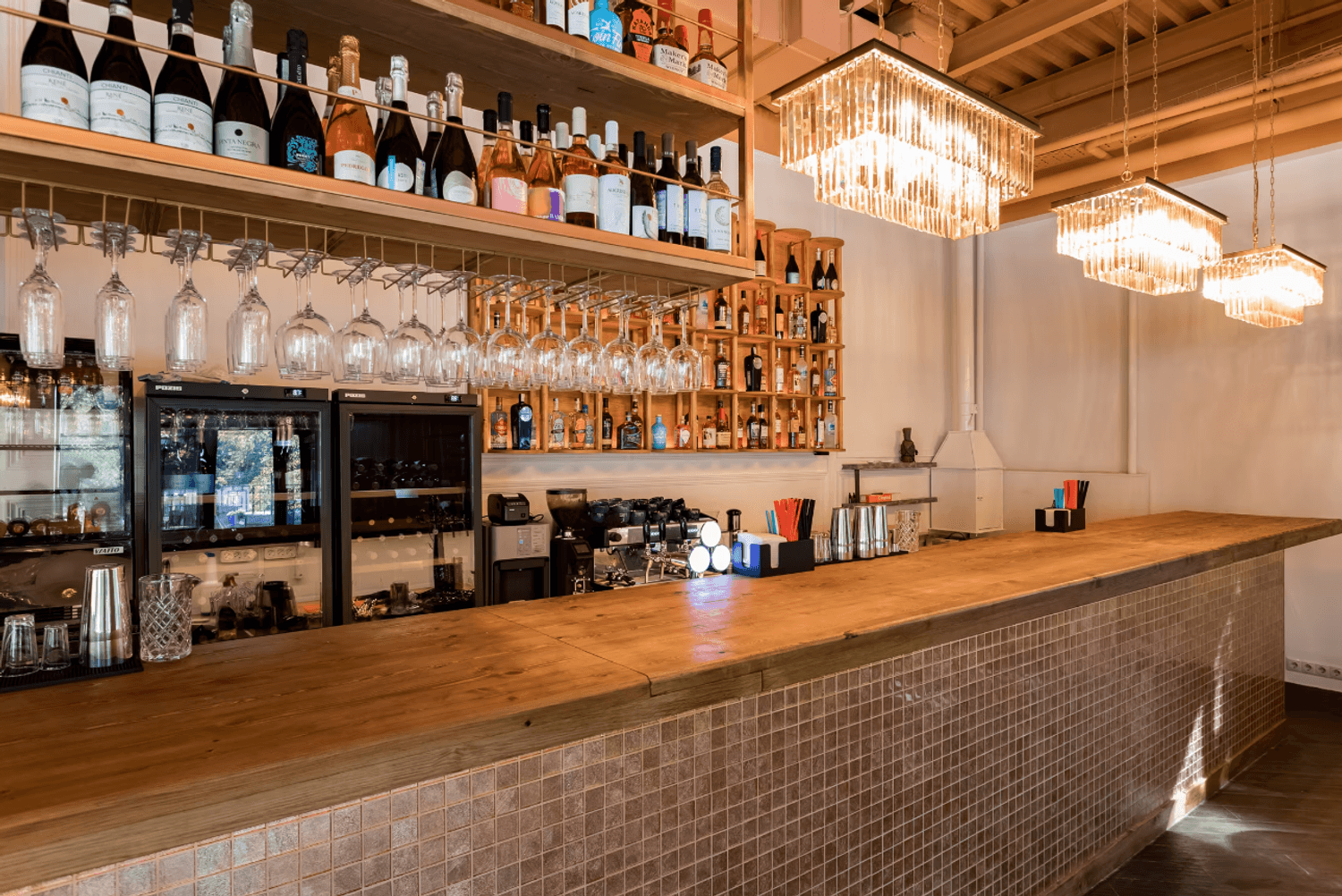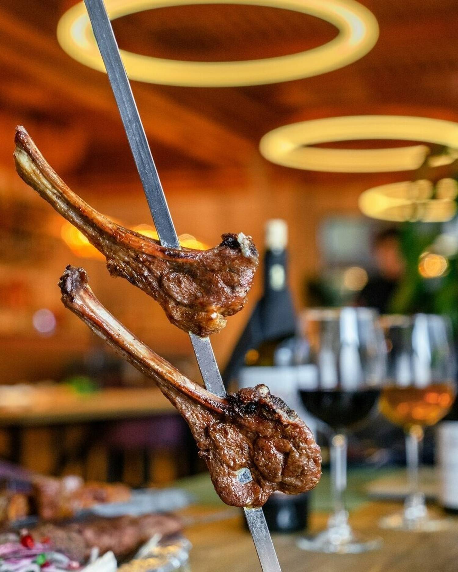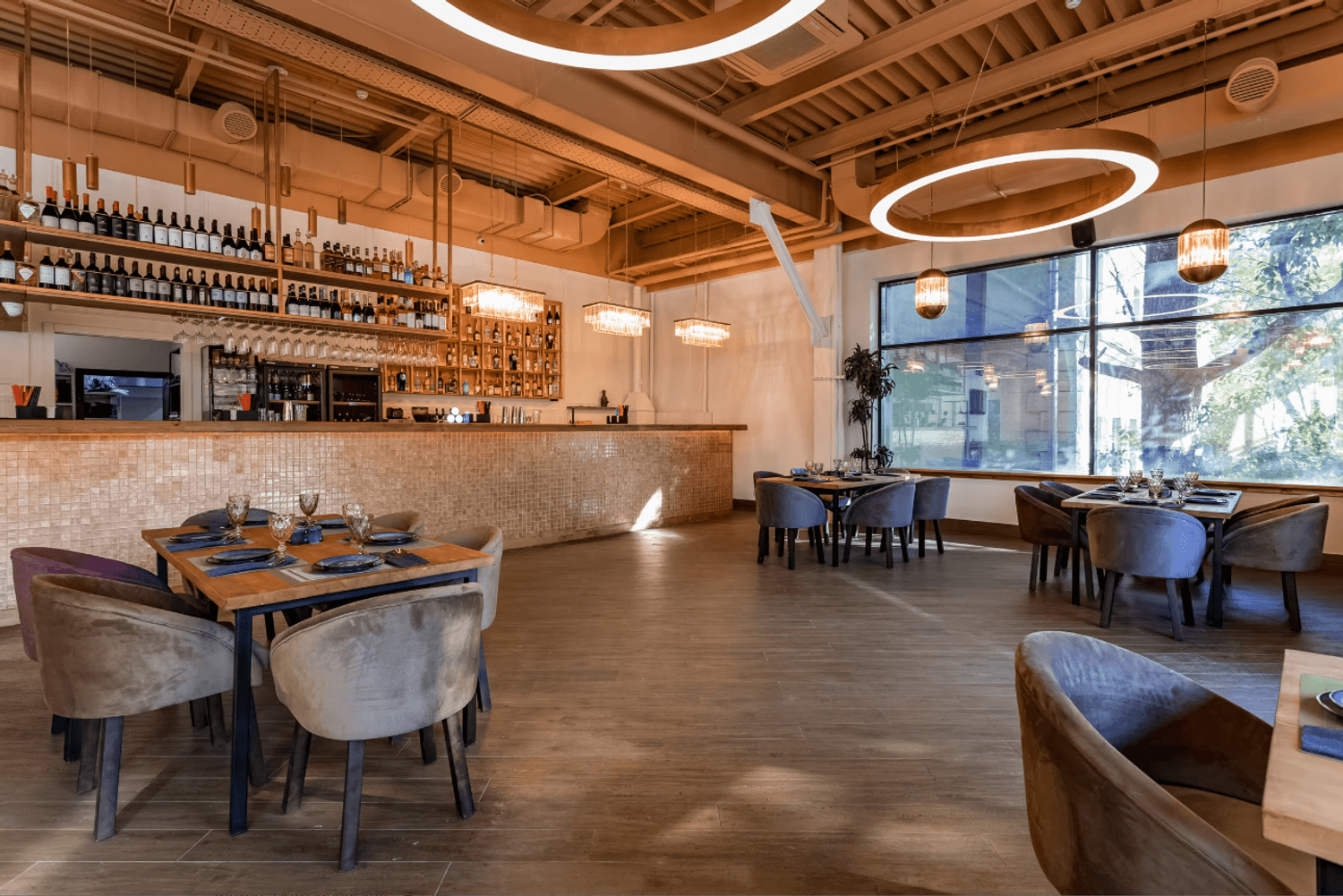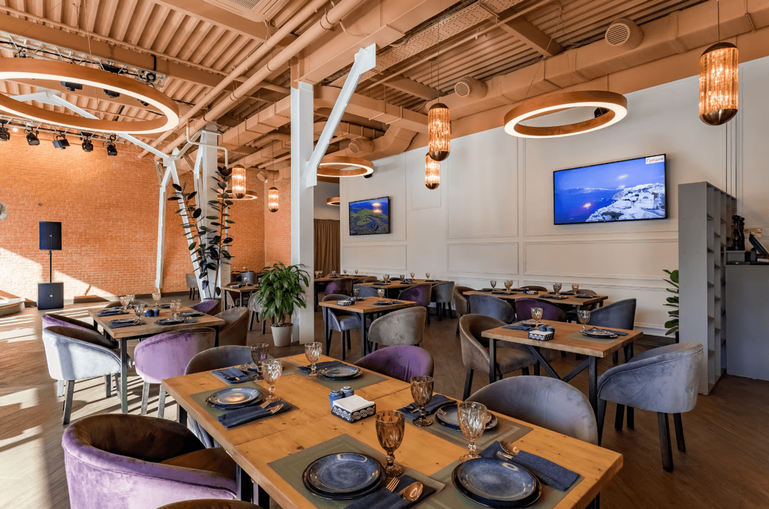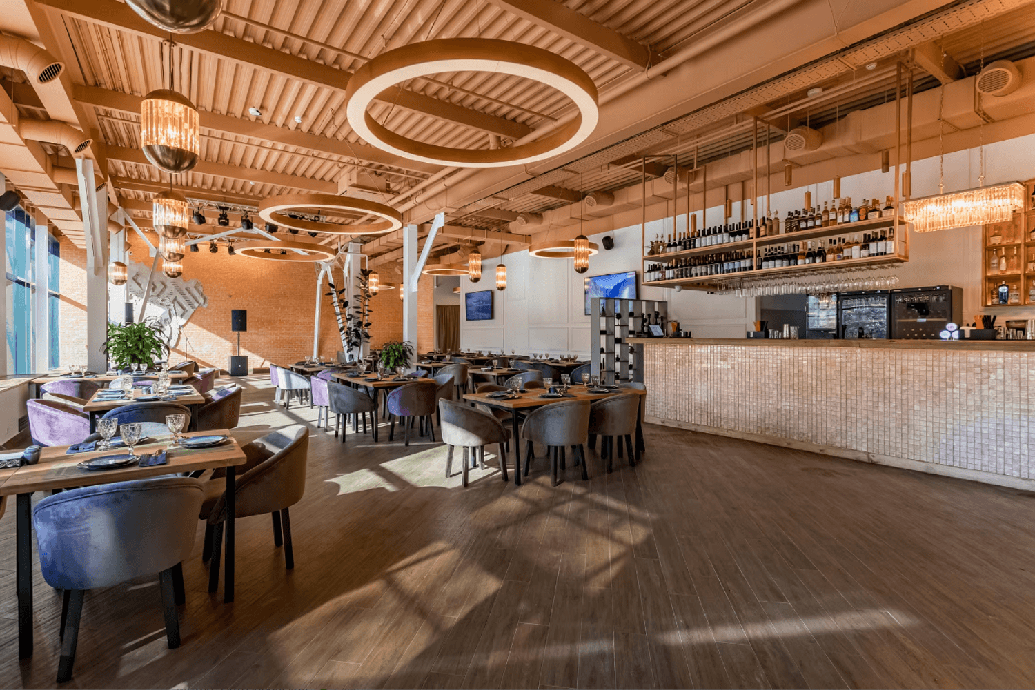 Атмосфера. Кирпичные стены и коричневые шторы создают теплую основу, которую дополняют эффектные детали — большие круглые люстры-нимбы с деревянной рамой, барная стойка со слегка мерцающим покрытием и зеркало в золотой раме. На небольшой сцене регулярно выступают музыканты, а летом работает терраса.