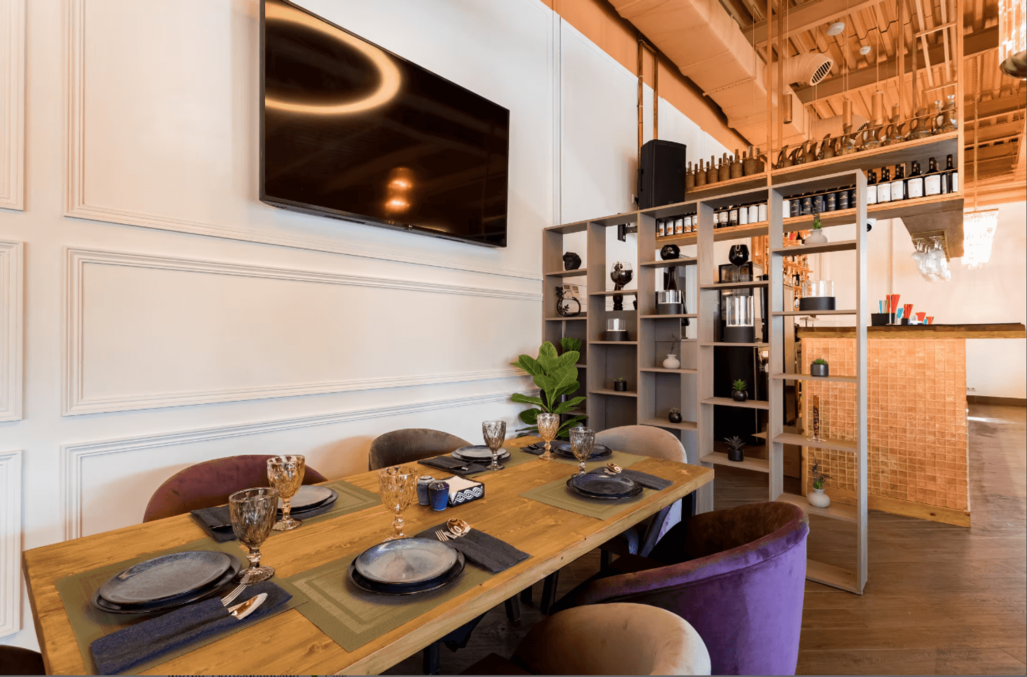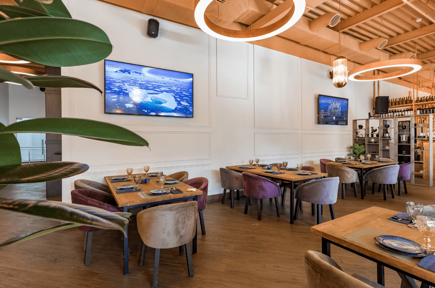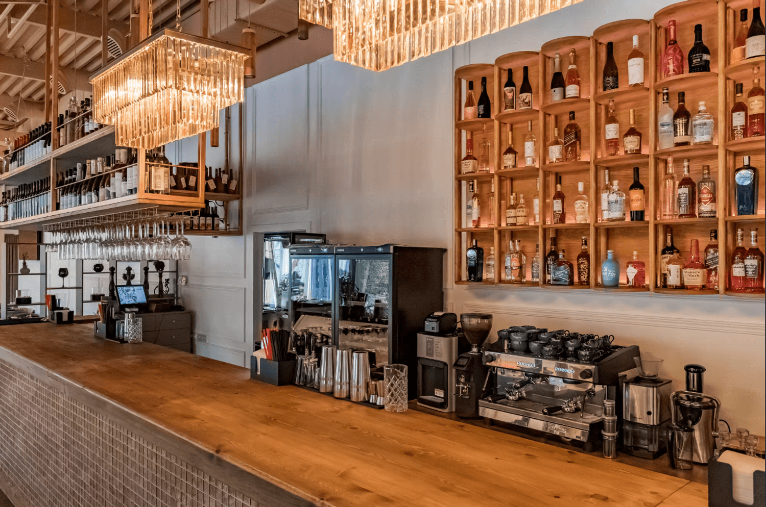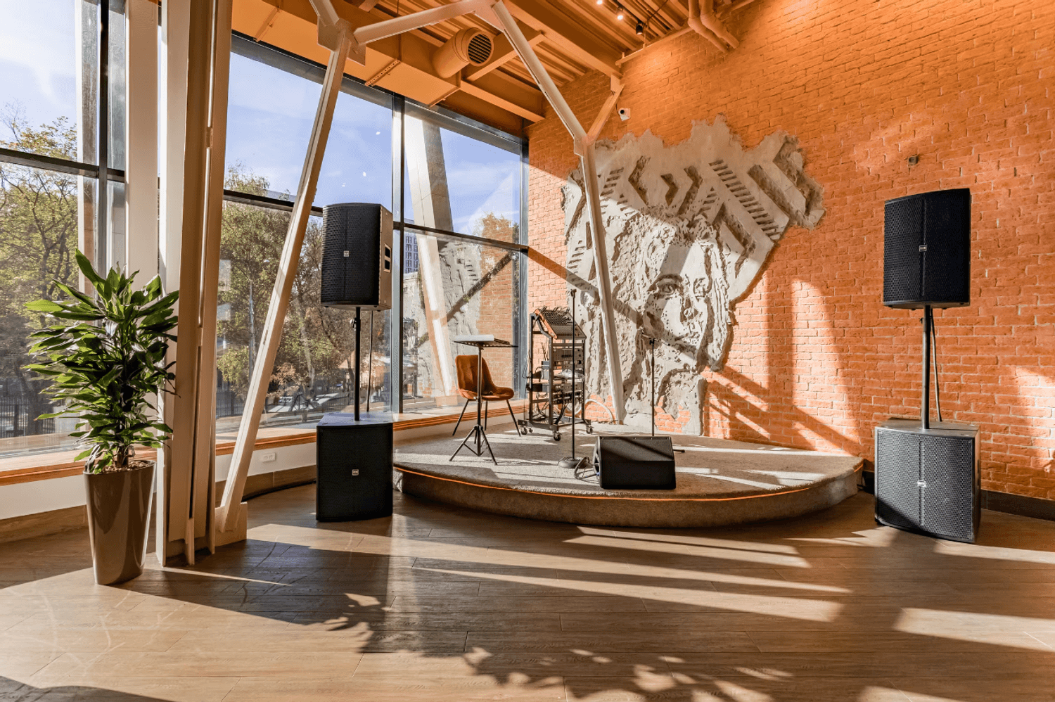Атмосфера. Кирпичные стены и коричневые шторы создают теплую основу, которую дополняют эффектные детали — большие круглые люстры-нимбы с деревянной рамой, барная стойка со слегка мерцающим покрытием и зеркало в золотой раме. На небольшой сцене регулярно выступают музыканты, а летом работает терраса.