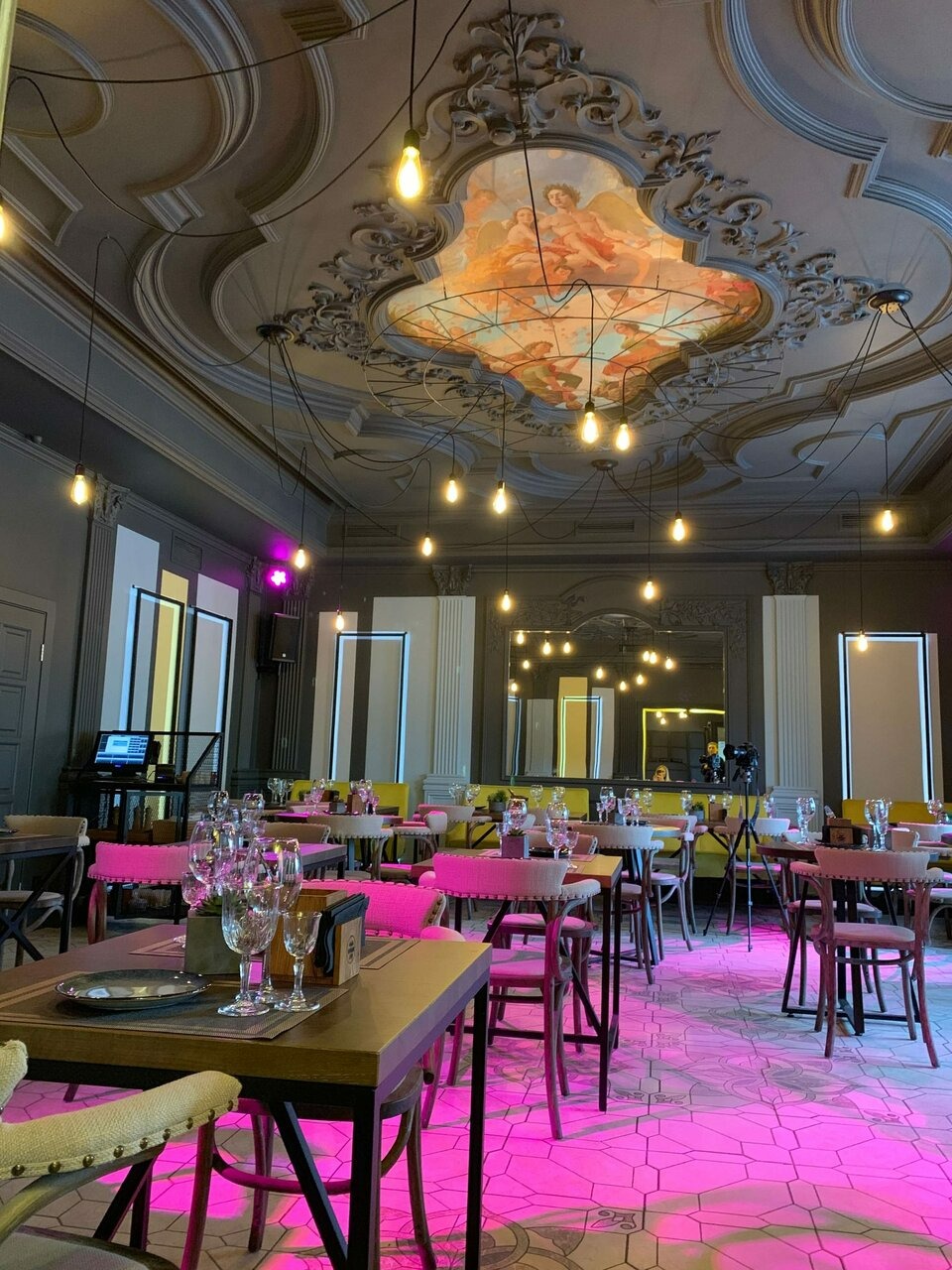 Атмосфера. Пространство оформлено в элегантном стиле: потолок с фресками, лепнина, лаконичная мебель и окна с видом на Таганку создают. Среди деталей розовая подсветка и круглые панно с бутылками вина.