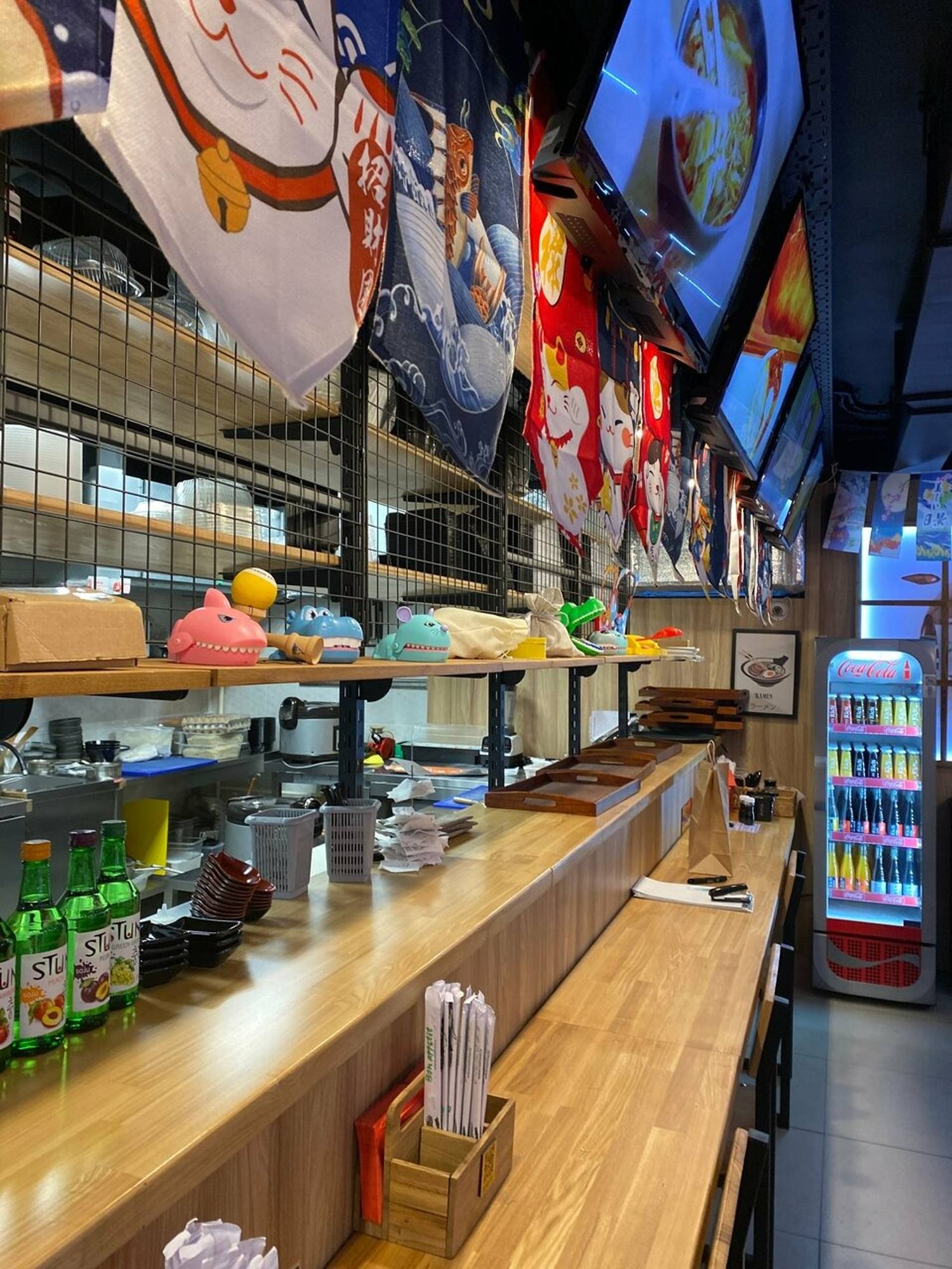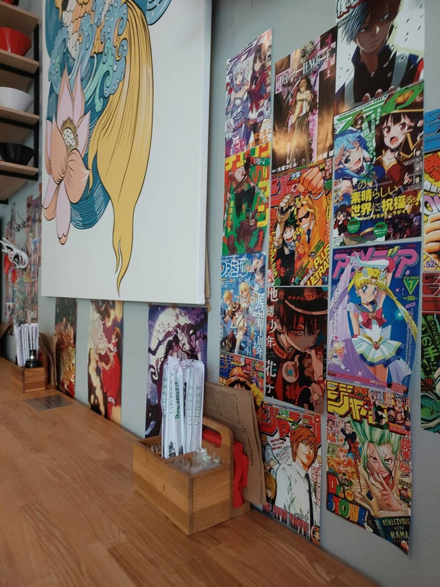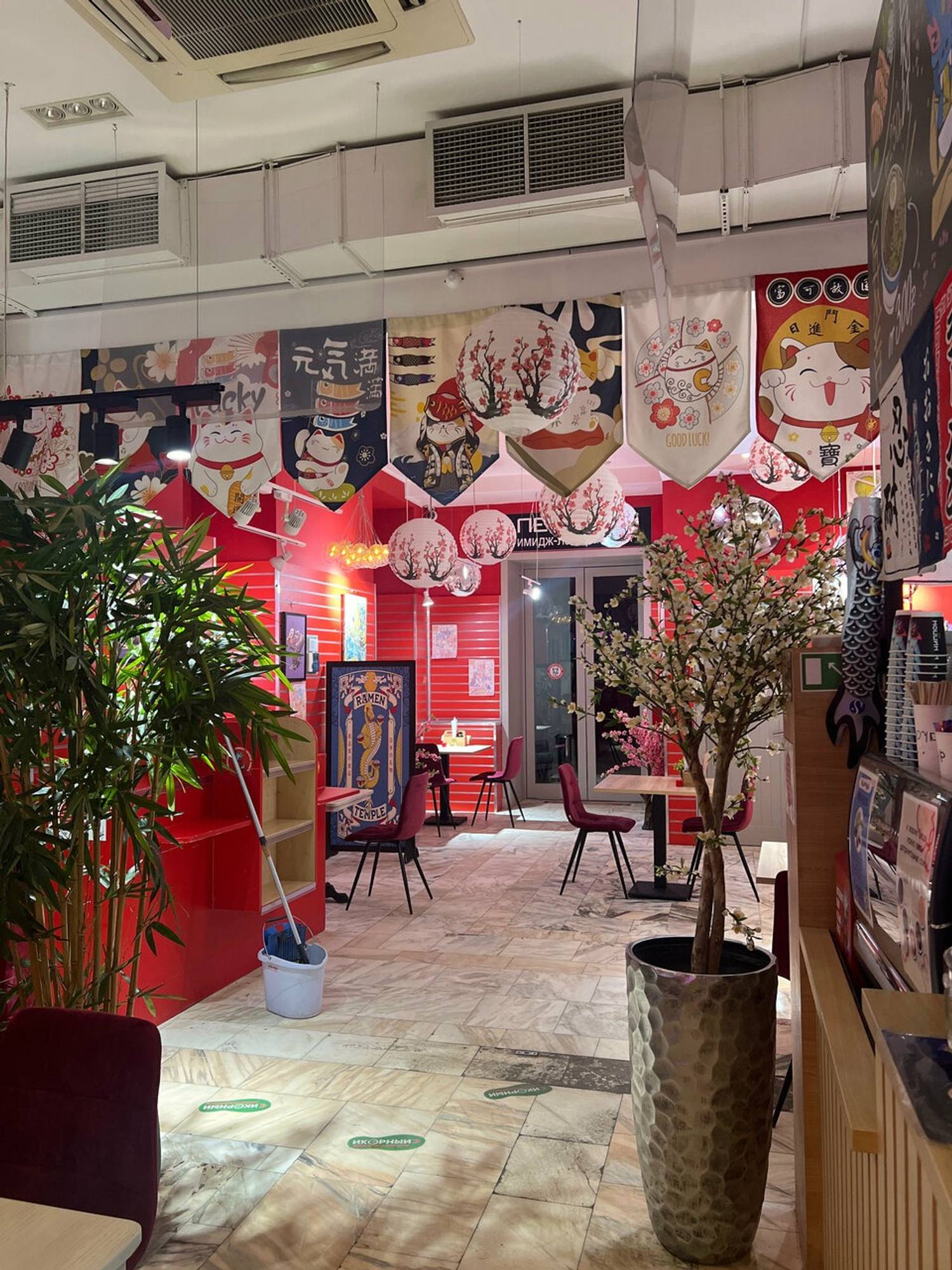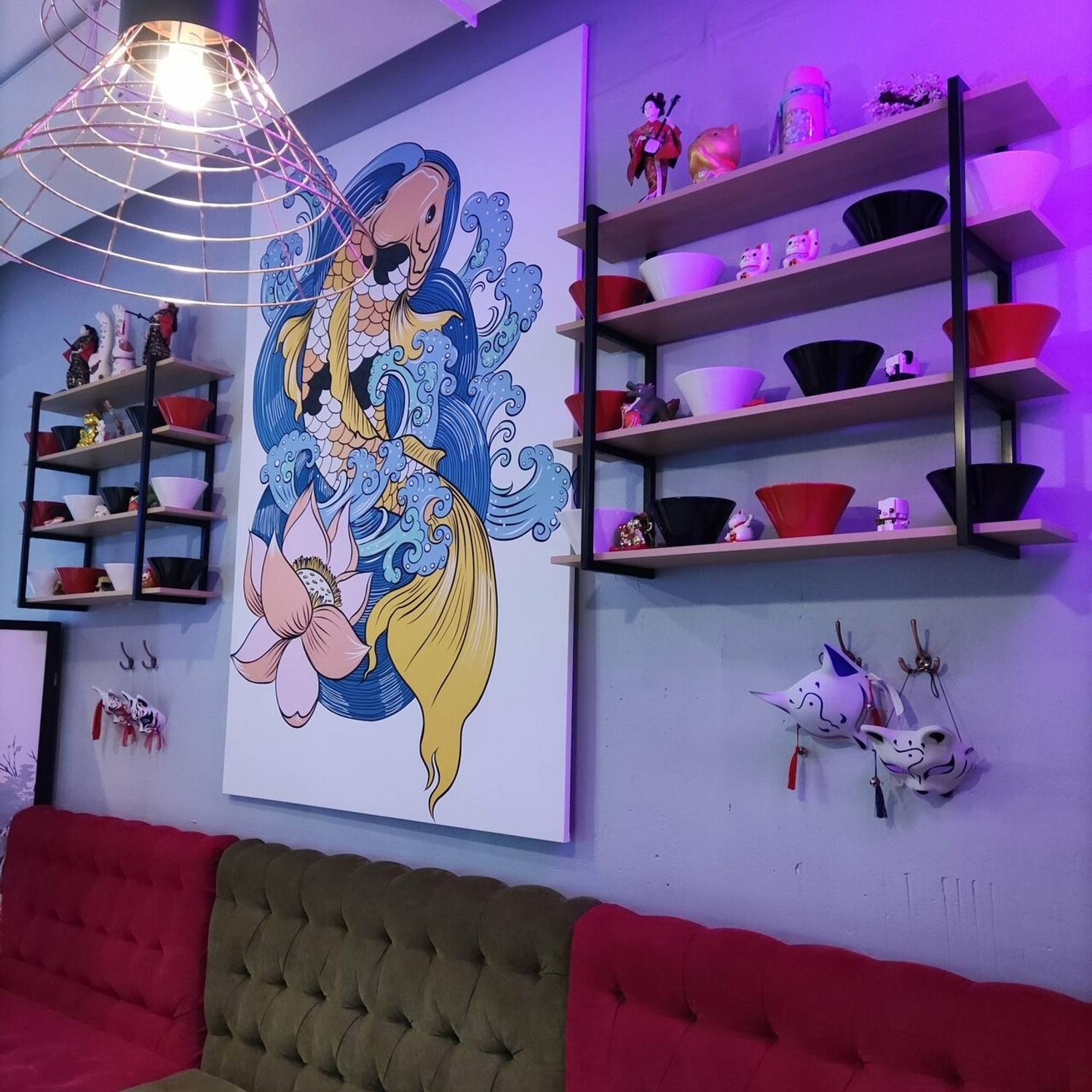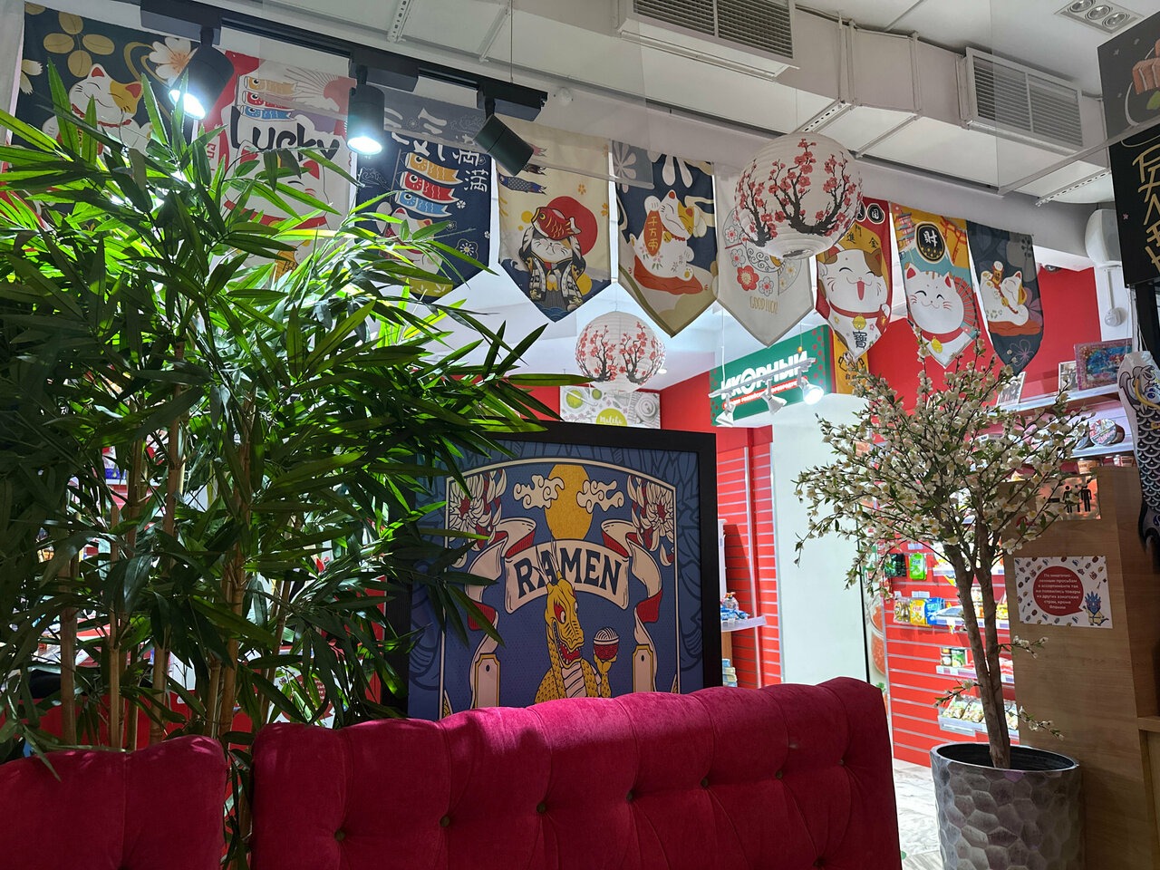 Атмосфера. Интерьер напоминает уголок токийского кафе: стены украшены плакатами с популярными аниме, стилизованные перегородки разделяют пространство на зоны, а открытые полки с тематической посудой и коллекционными фигурками добавляют детализации. Яркие мягкие кресла и приглушенное освещение располагают к долгим посиделкам за разговорами или просмотром аниме.