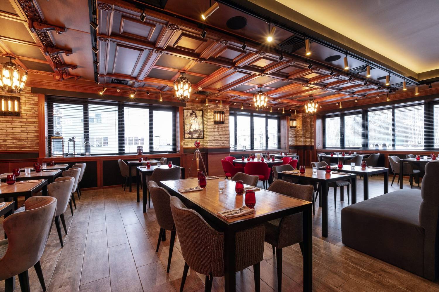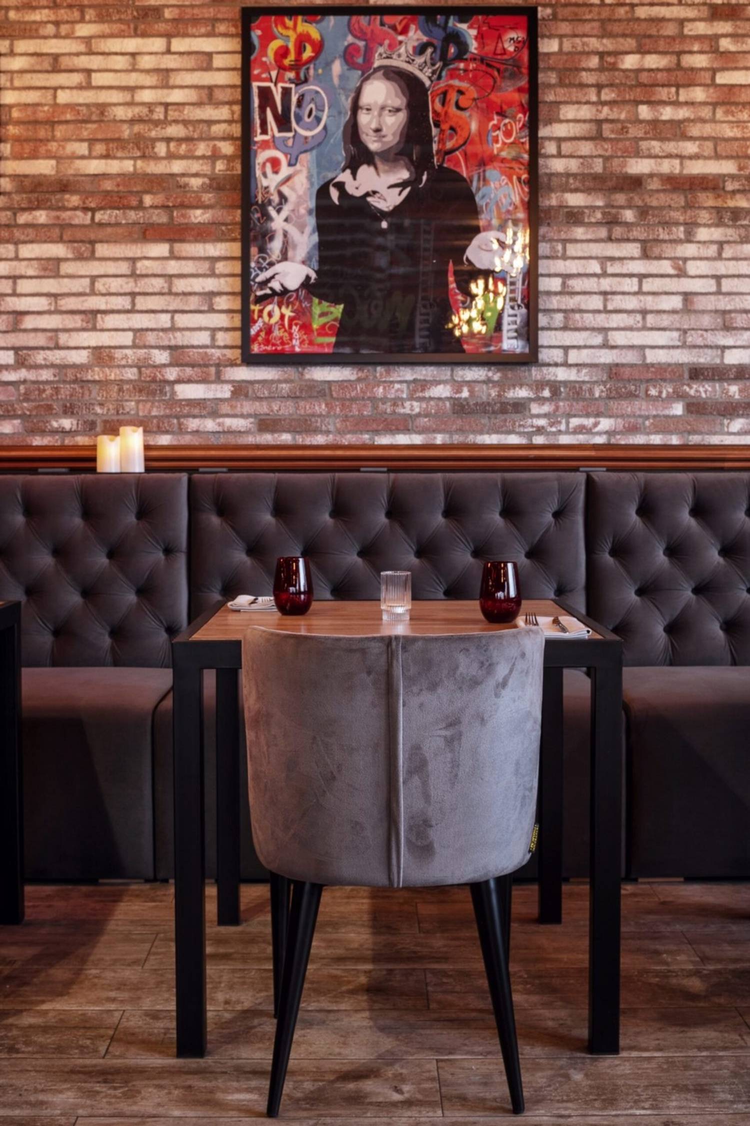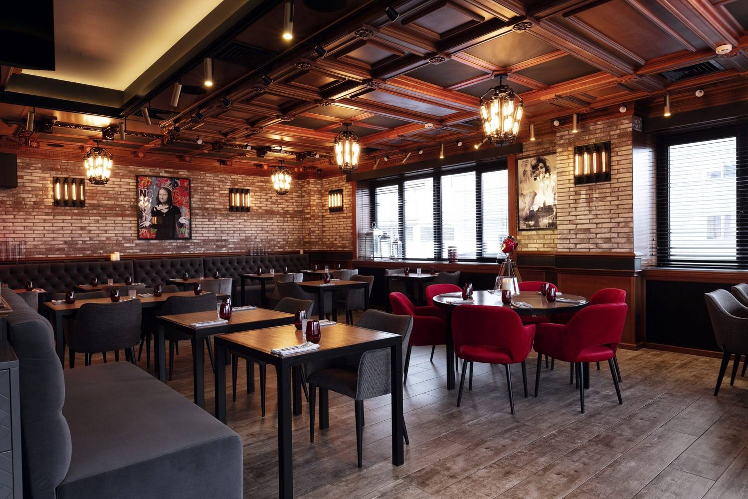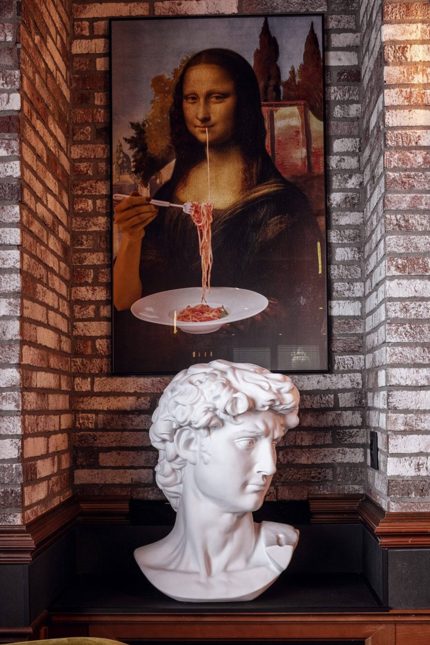 Атмосфера. Пространство создает ощущение энергичного и гостеприимного места, где царит дух настоящей Италии. Интерьер сочетает в себе классику и лофт: кирпичная кладка, темные деревянные потолки с декоративной резьбой и акцентированная красная подсветка бара создают яркий и слегка дерзкий вайб. Большие окна с видом на парк, мягкие кресла и живые растения добавляют комфорта, а разбавляют обстановку забавные картины вроде изображения Джоконды, поедающей спагетти. В теплое время года открывается терраса, куда иногда приглашают музыкантов.