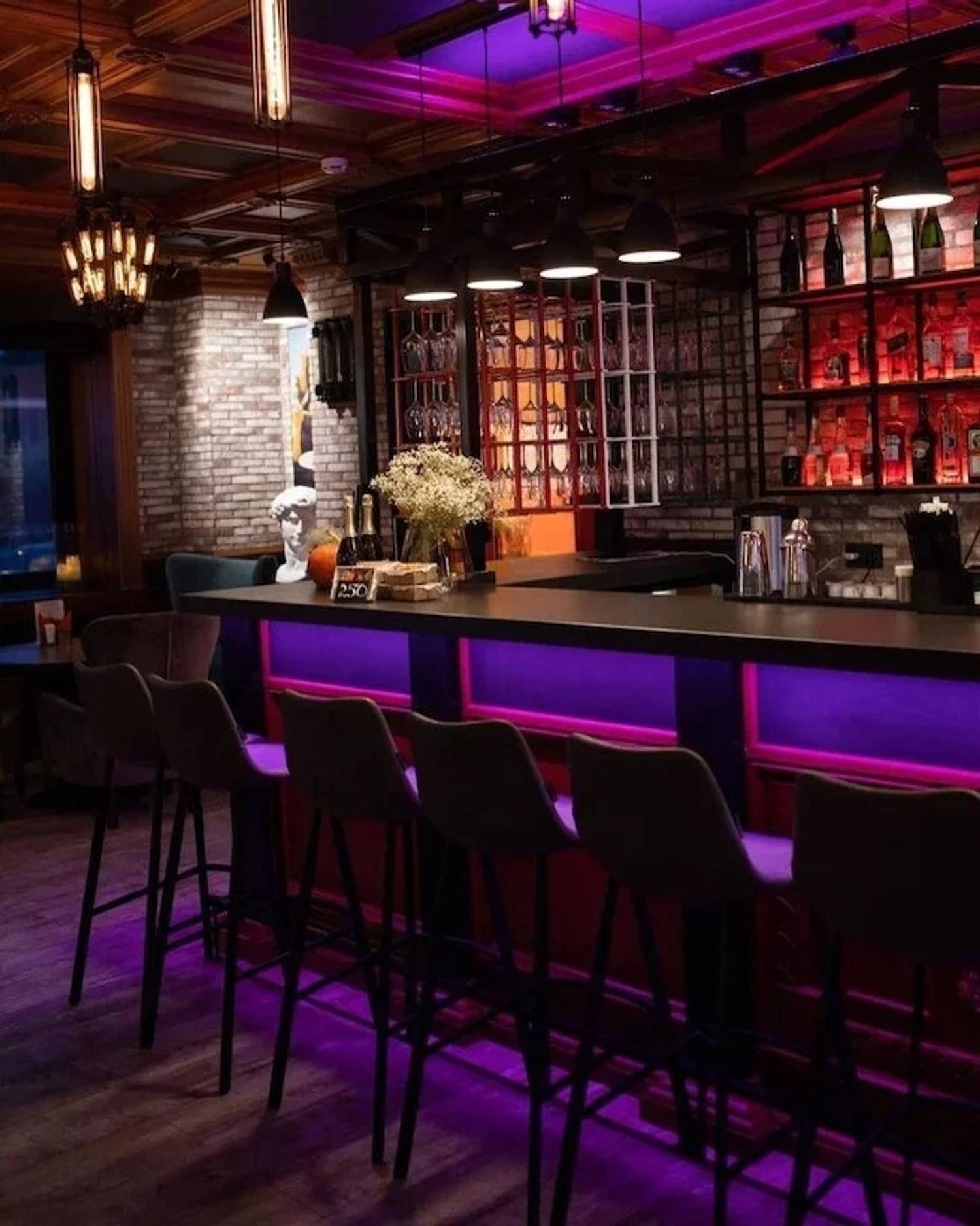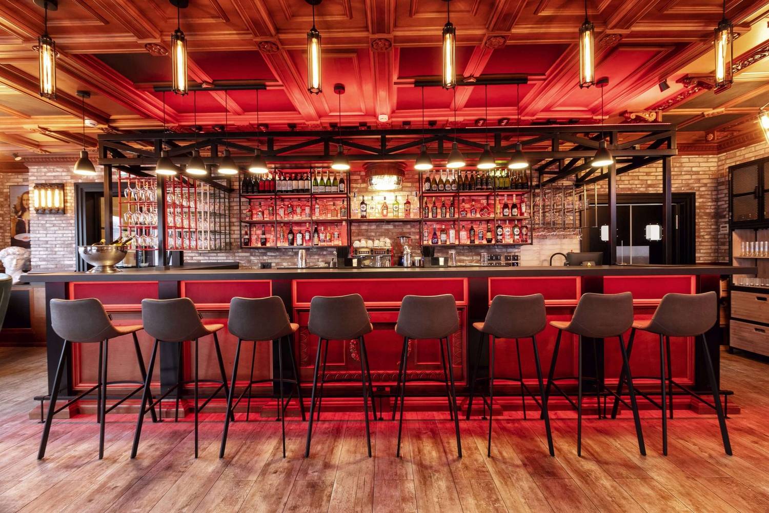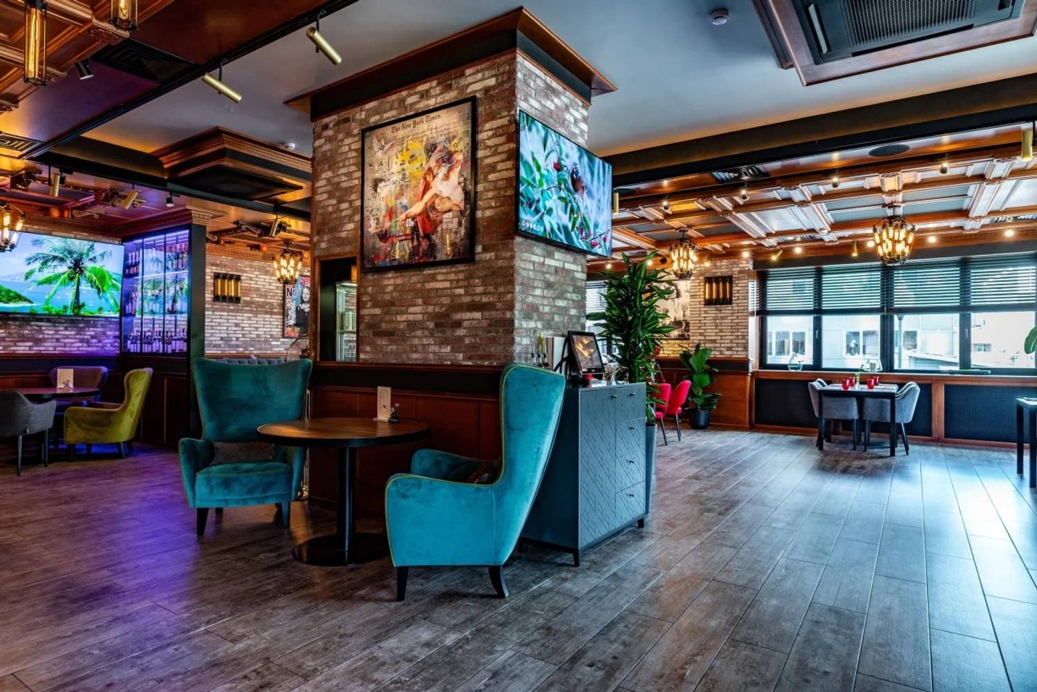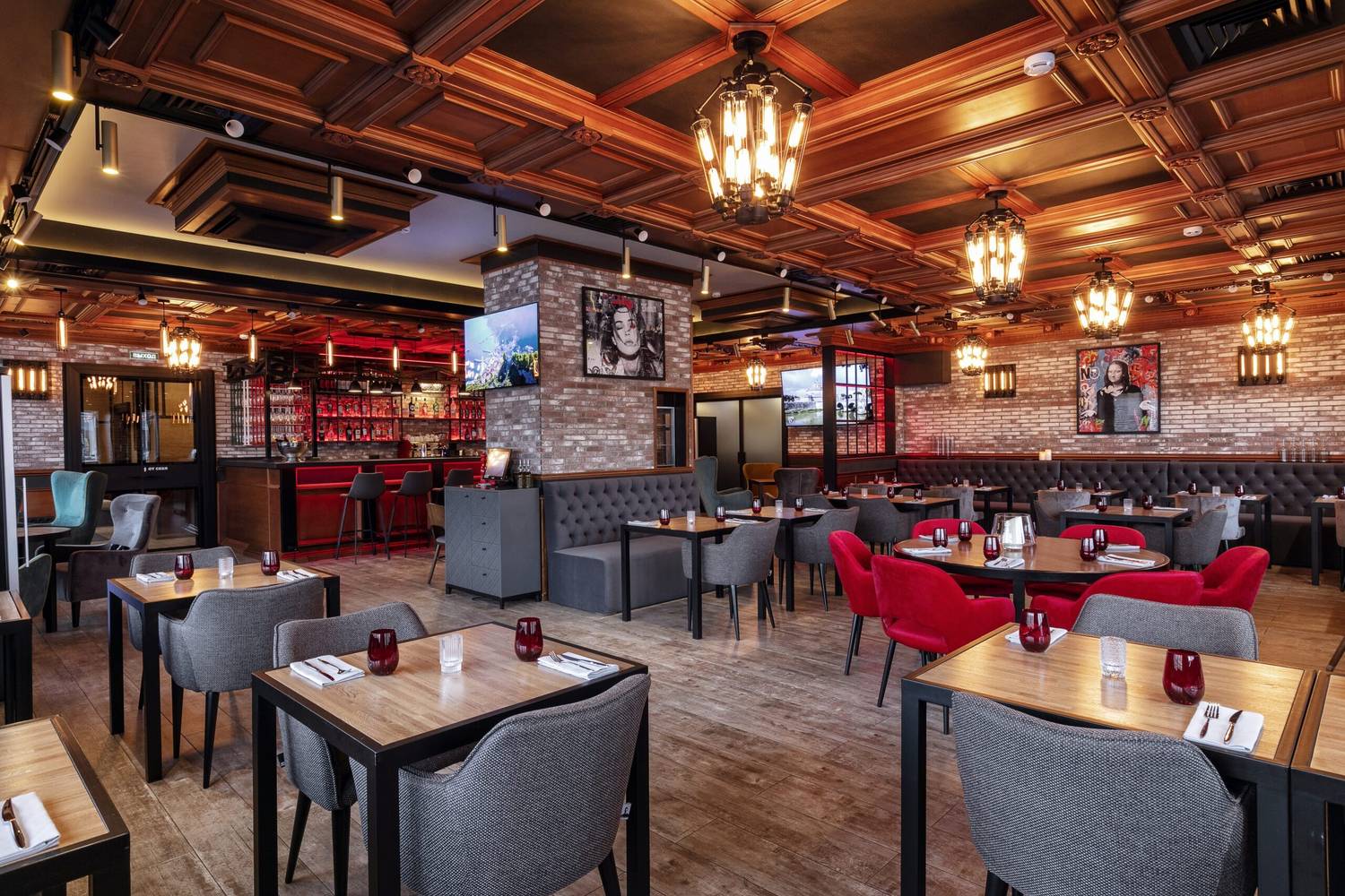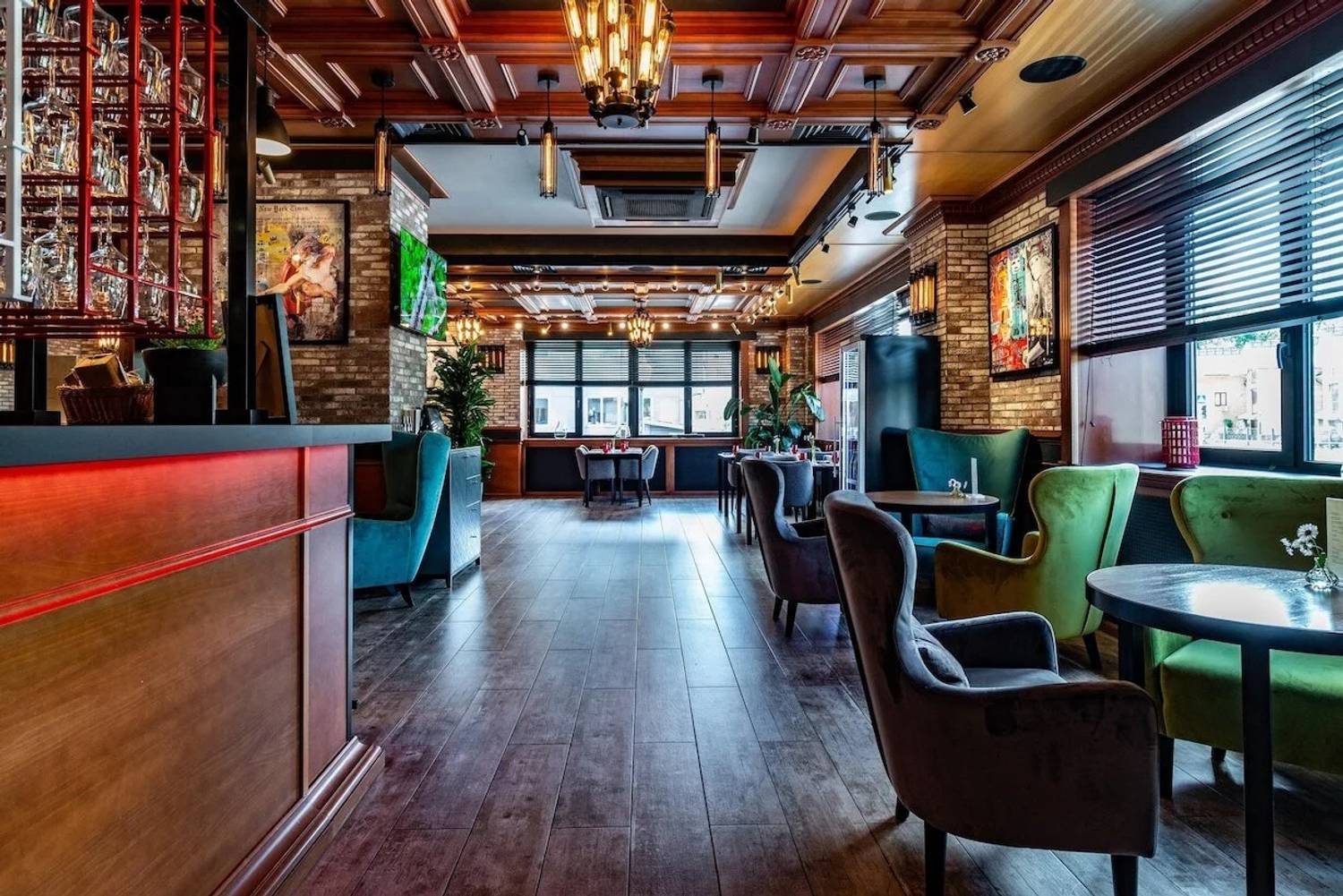 Атмосфера. Пространство создает ощущение энергичного и гостеприимного места, где царит дух настоящей Италии. Интерьер сочетает в себе классику и лофт: кирпичная кладка, темные деревянные потолки с декоративной резьбой и акцентированная красная подсветка бара создают яркий и слегка дерзкий вайб. Большие окна с видом на парк, мягкие кресла и живые растения добавляют комфорта, а разбавляют обстановку забавные картины вроде изображения Джоконды, поедающей спагетти. В теплое время года открывается терраса, куда иногда приглашают музыкантов.